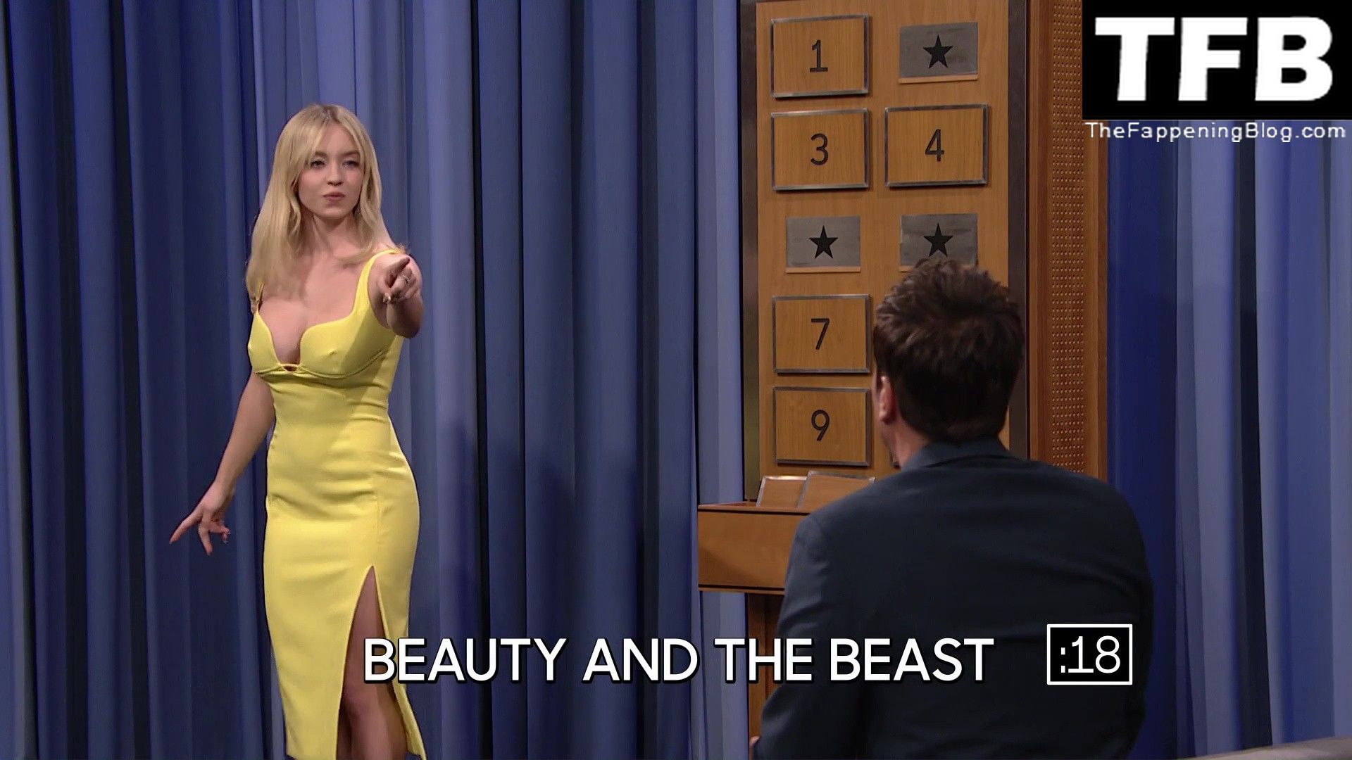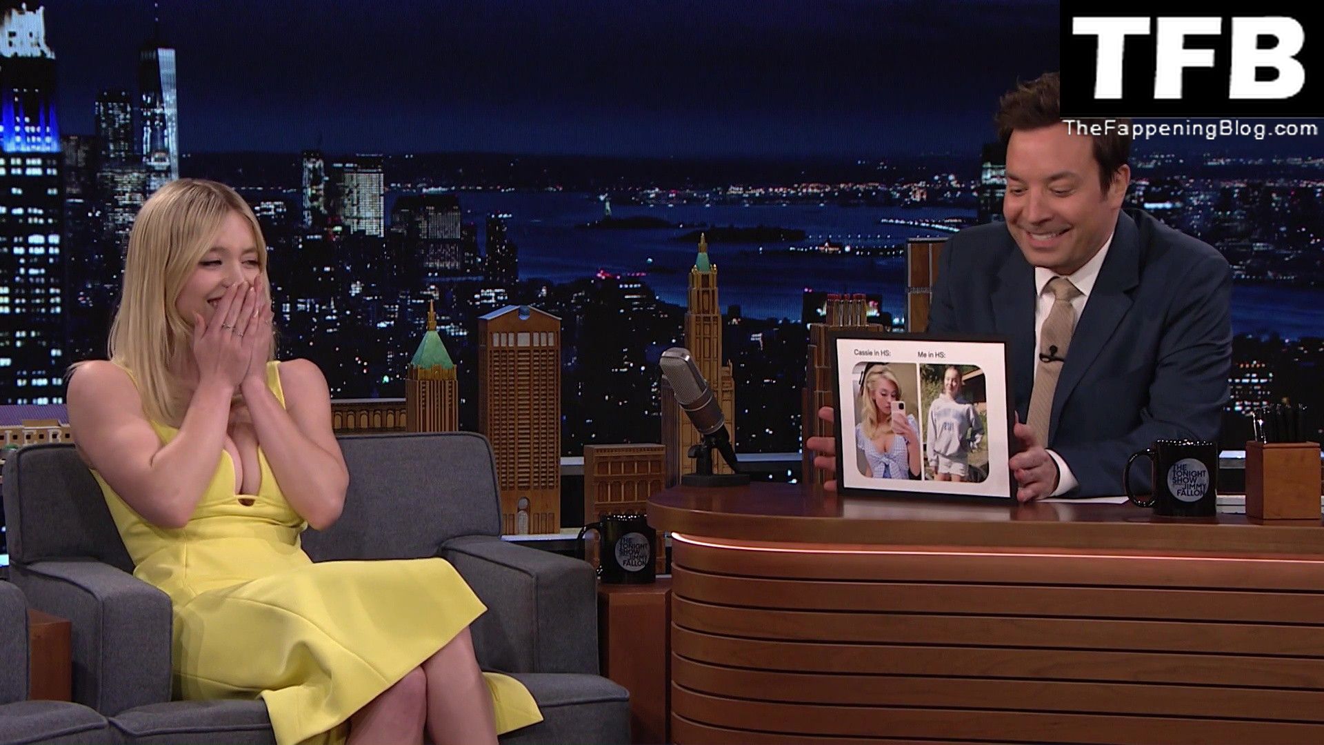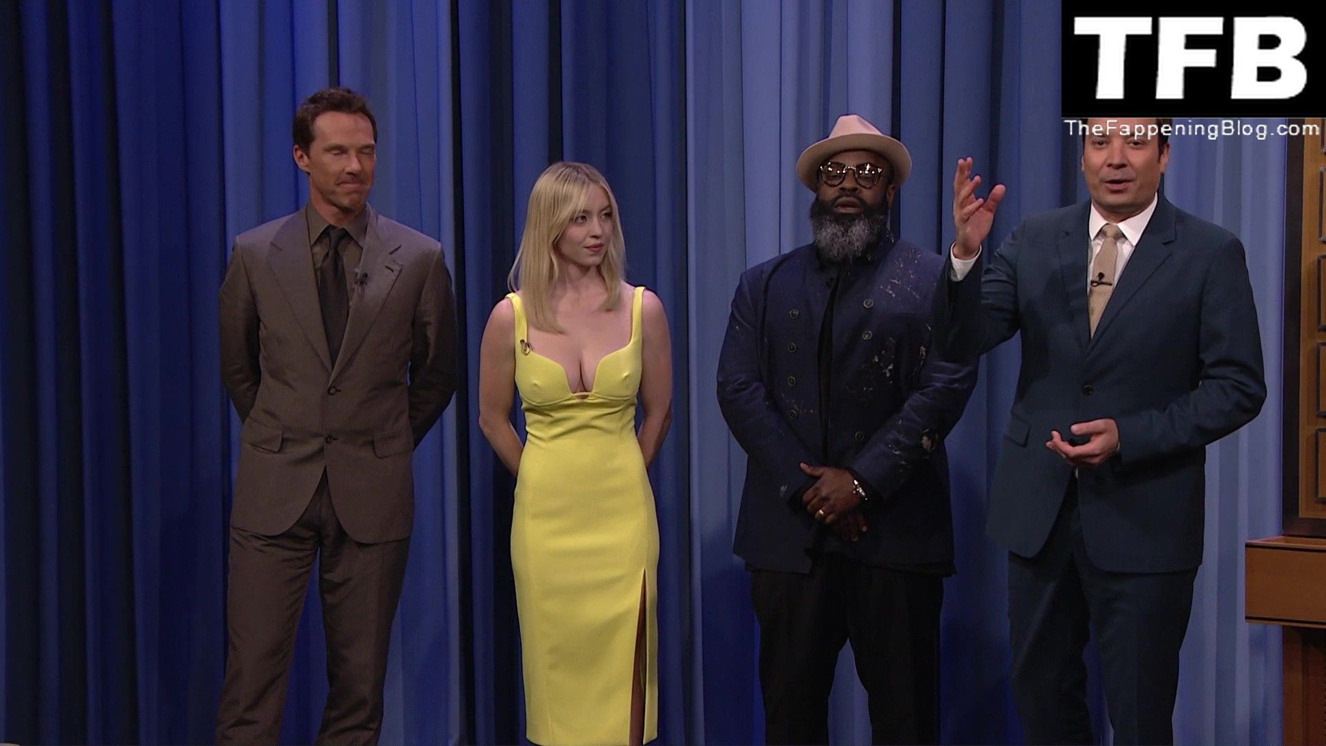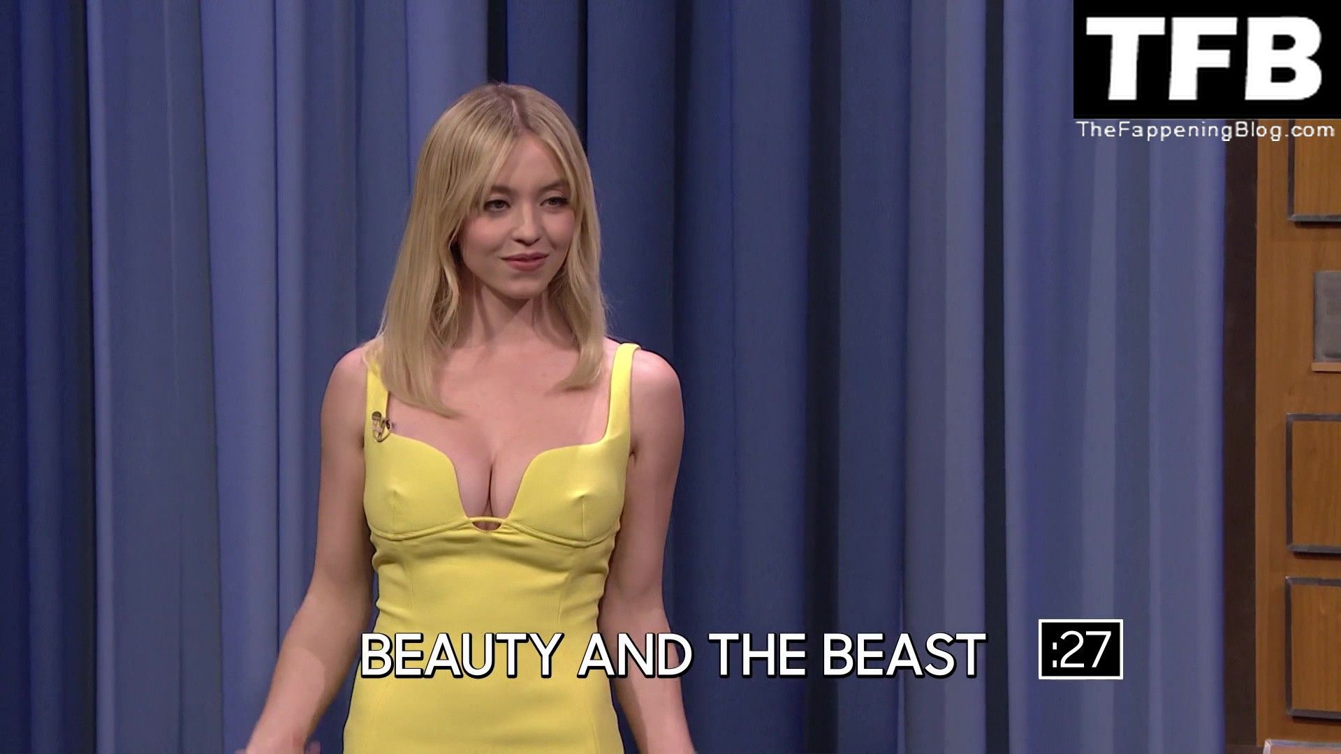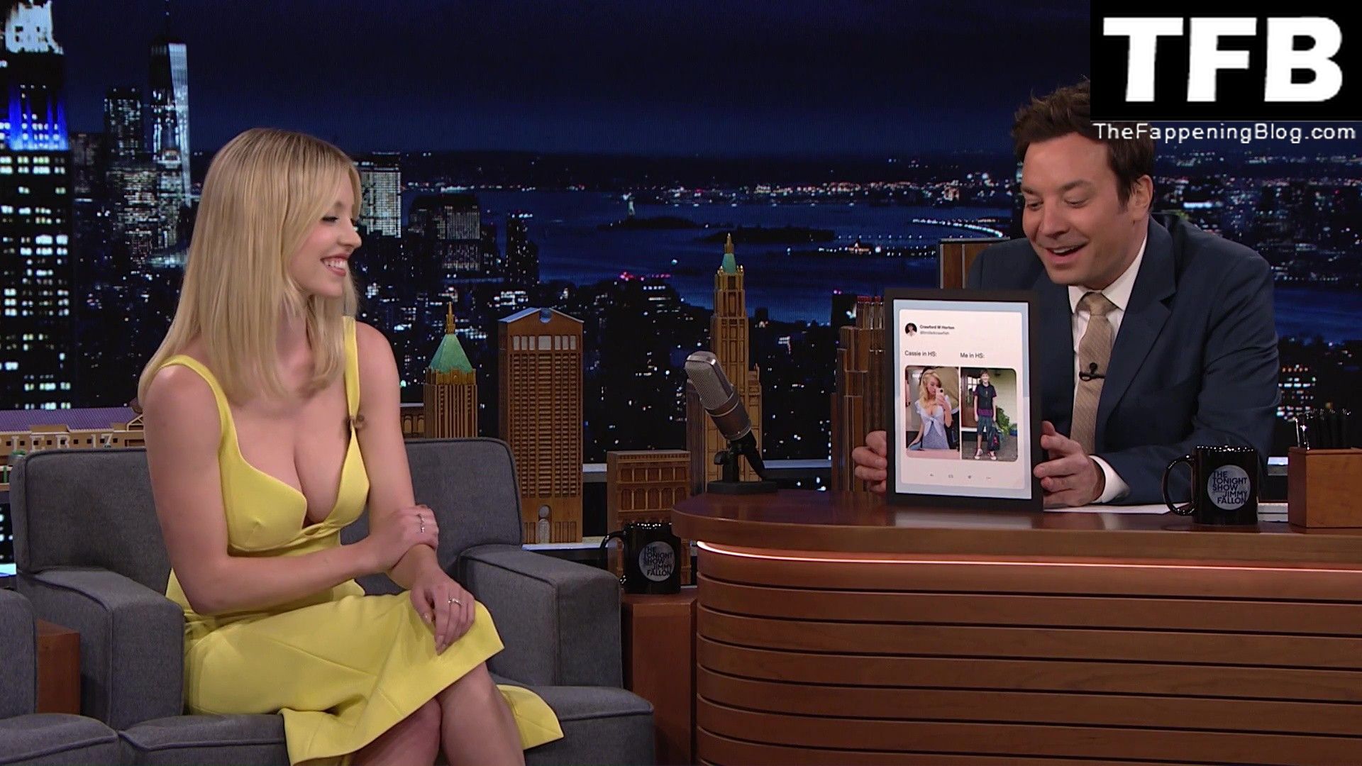 Sydney Sweeney muestra su sexy escote y enseña su pezón en el programa “The Tonight Show with Jimmy Fallon” (mayo 2022).