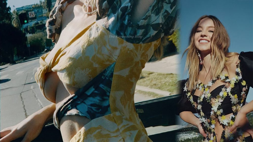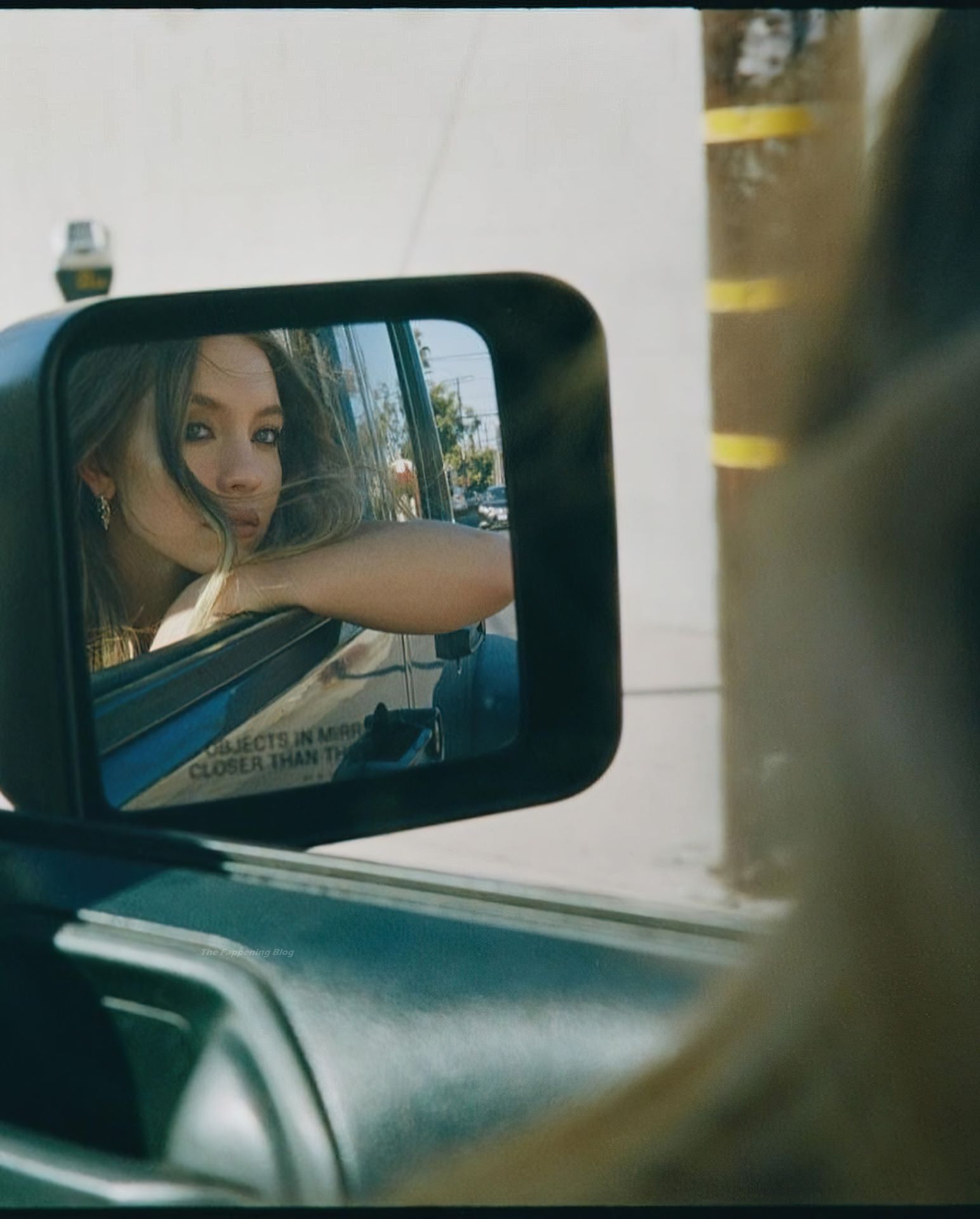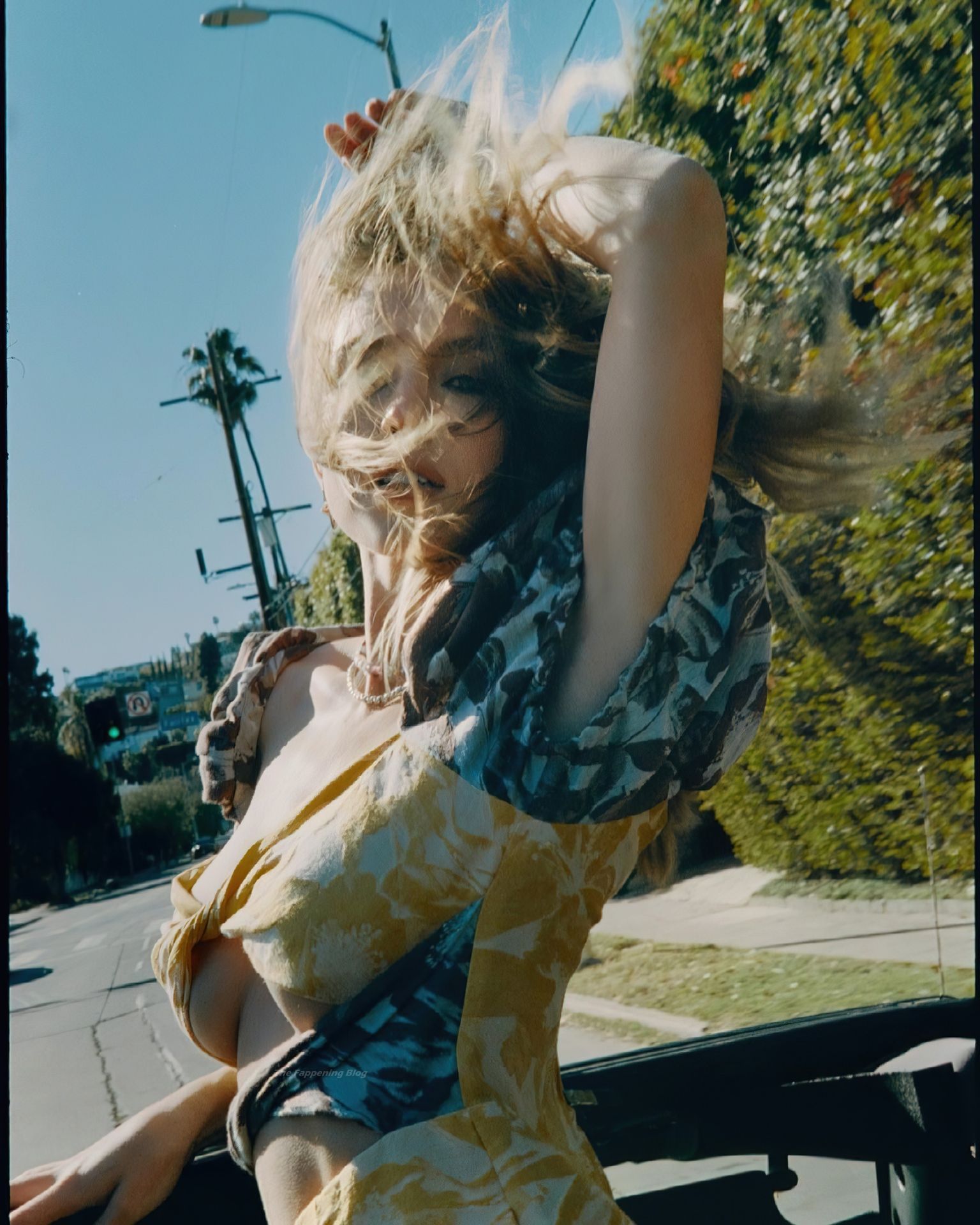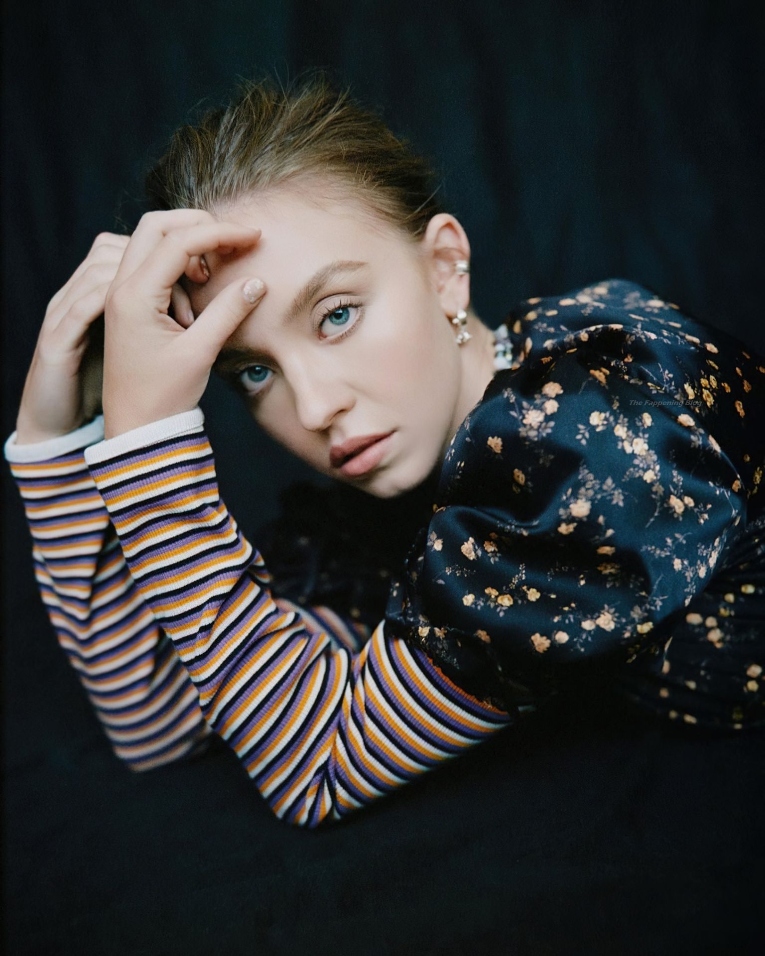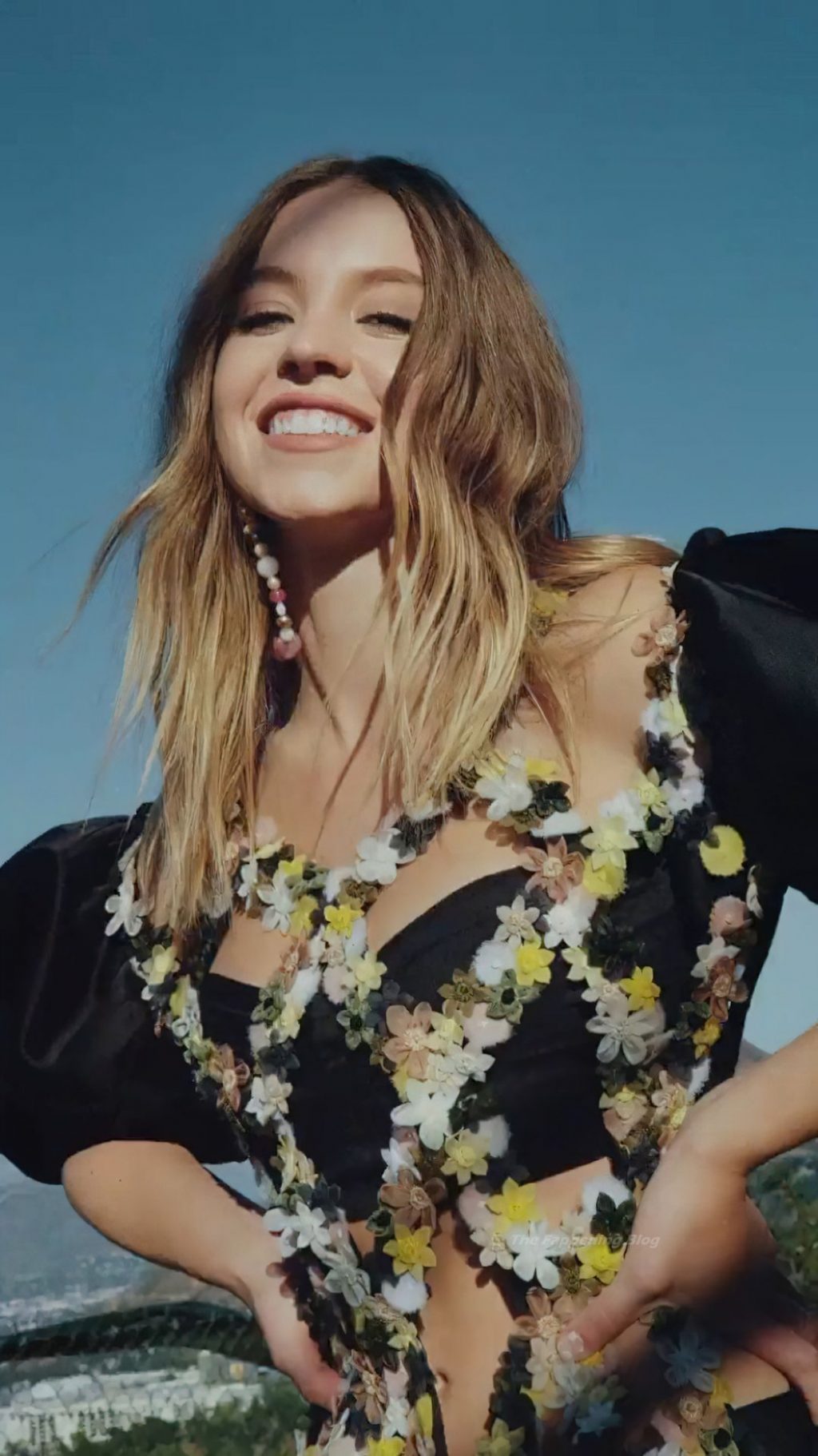 Actriz/modelo Sydney Sweeney luce adorable, mostrando su escote y bajo pecho en una sesión fotográfica realizada por Taylor Tupy para la revista Glamour España, edición abril/mayo 2021.