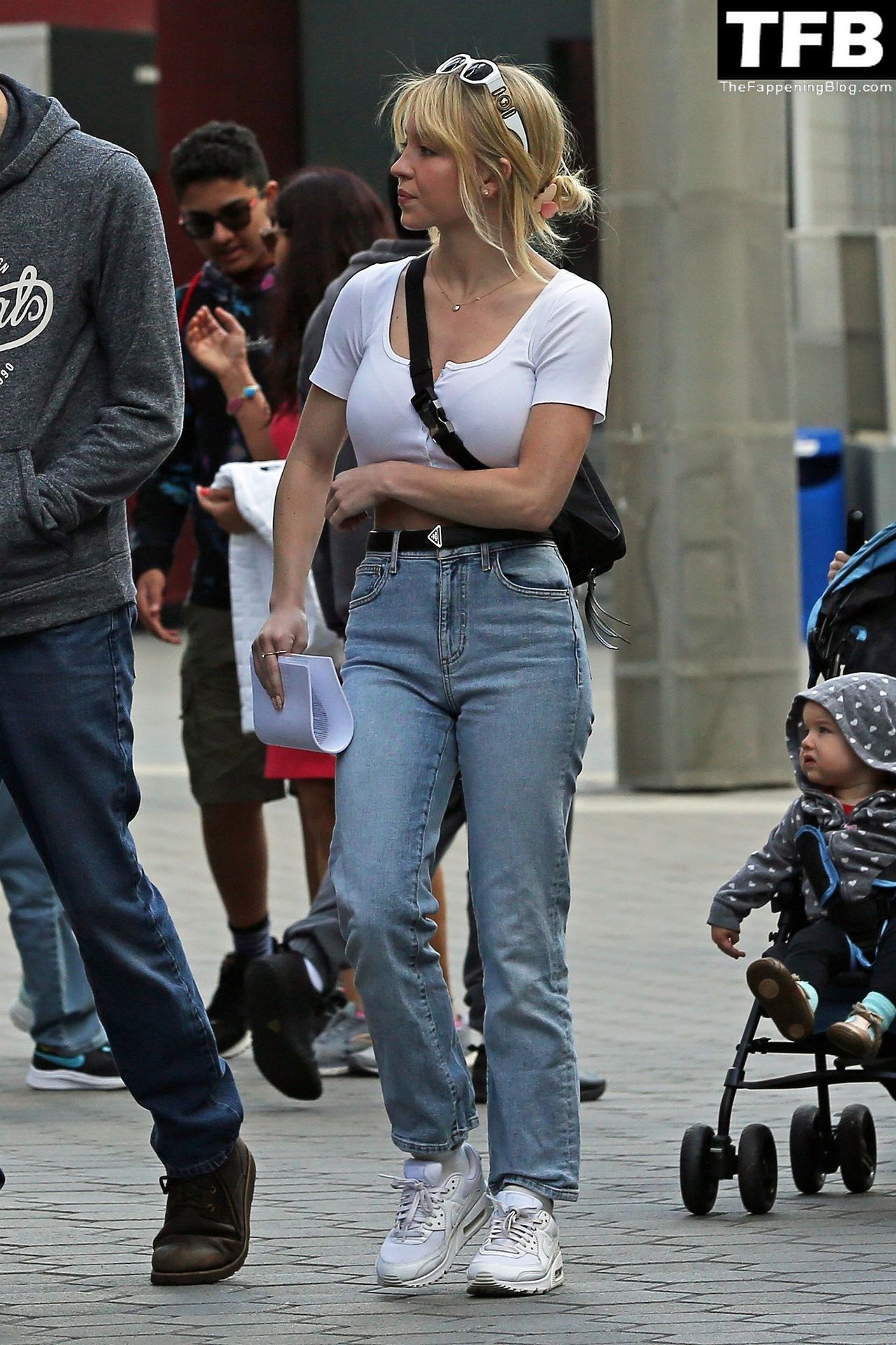 Los paparazzi captan a la estrella en ascenso manteniendo un estilo simple y chic con un top blanco corto y jeans de talle alto combinados con zapatillas Nike Air Max.