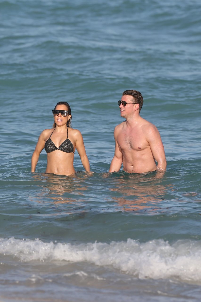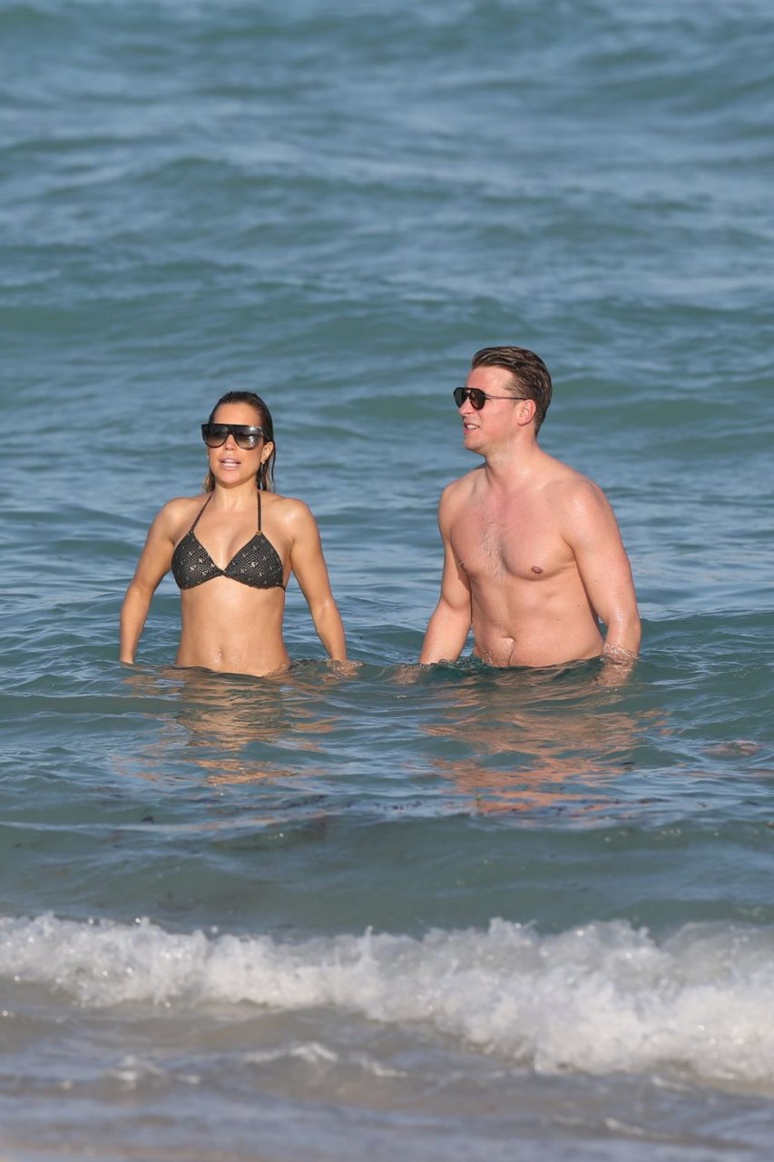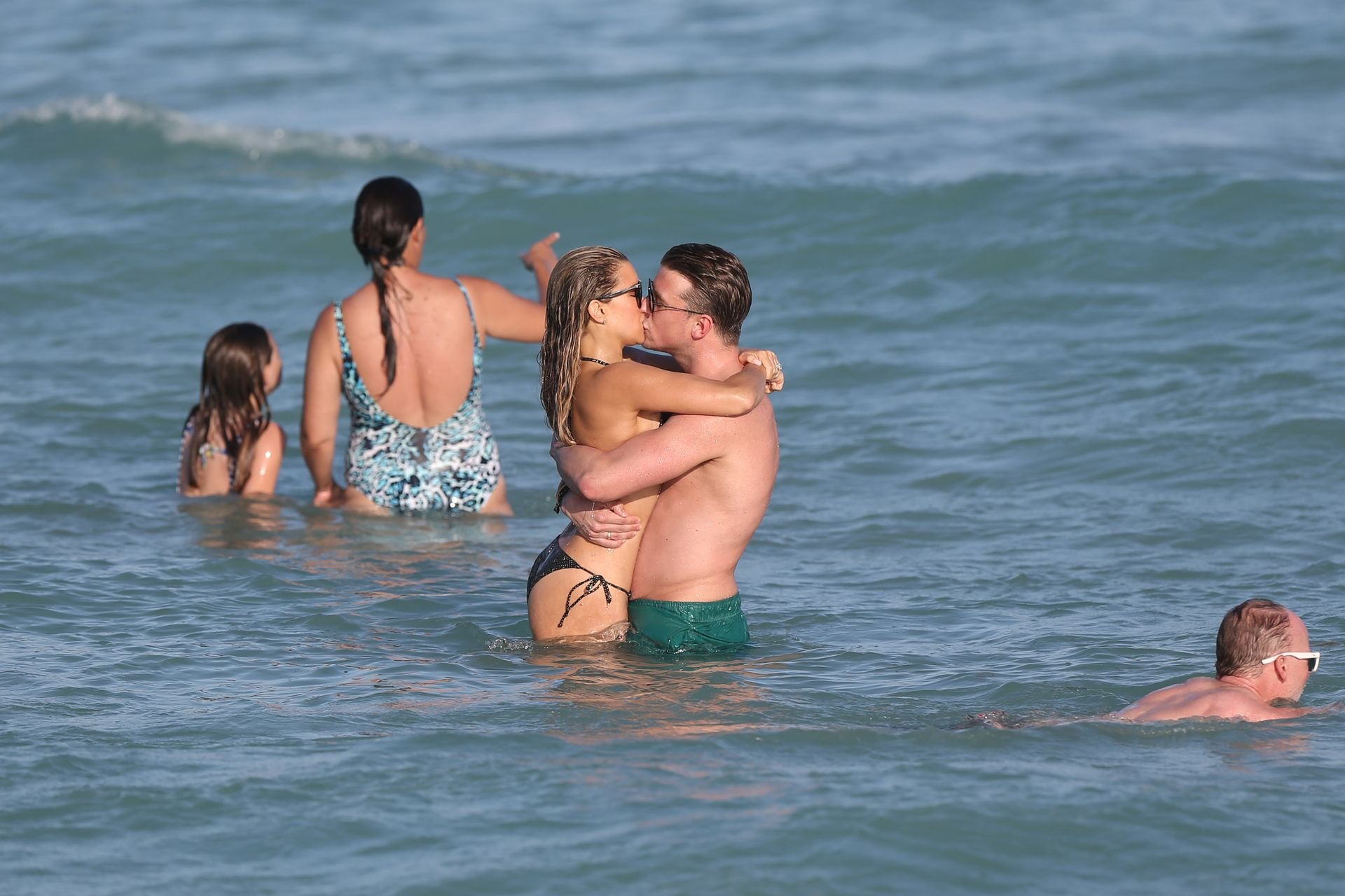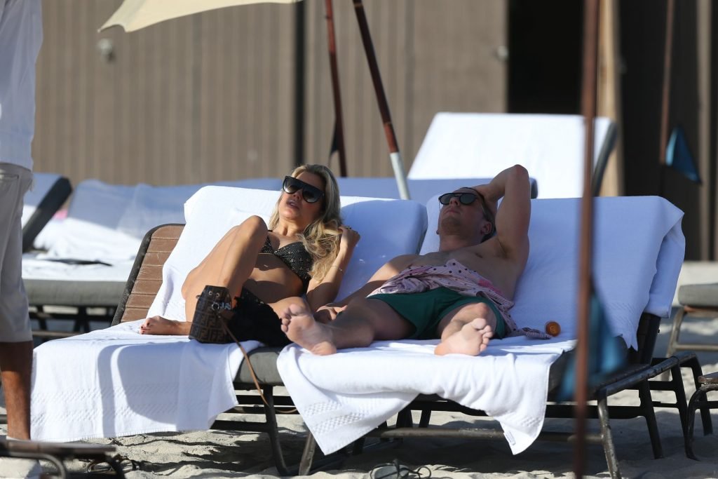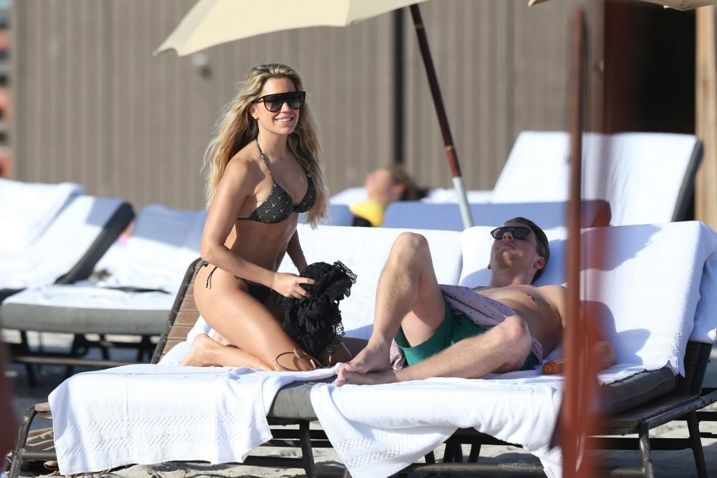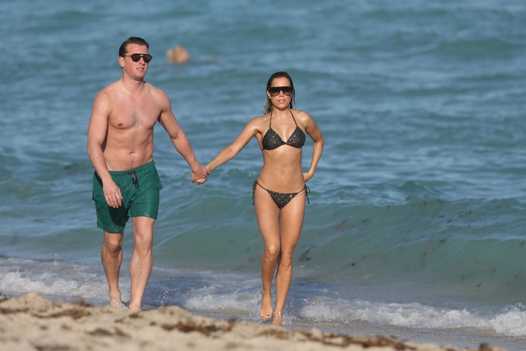 Modelo y presentadora de televisión holandesa Sylvie Meis luce fantástica a los 40 años mientras muestra su cuerpo en bikini y un enorme anillo de diamantes en la playa con su novio de 29 años Bart Willemsen en Miami, 29/12/2018.
