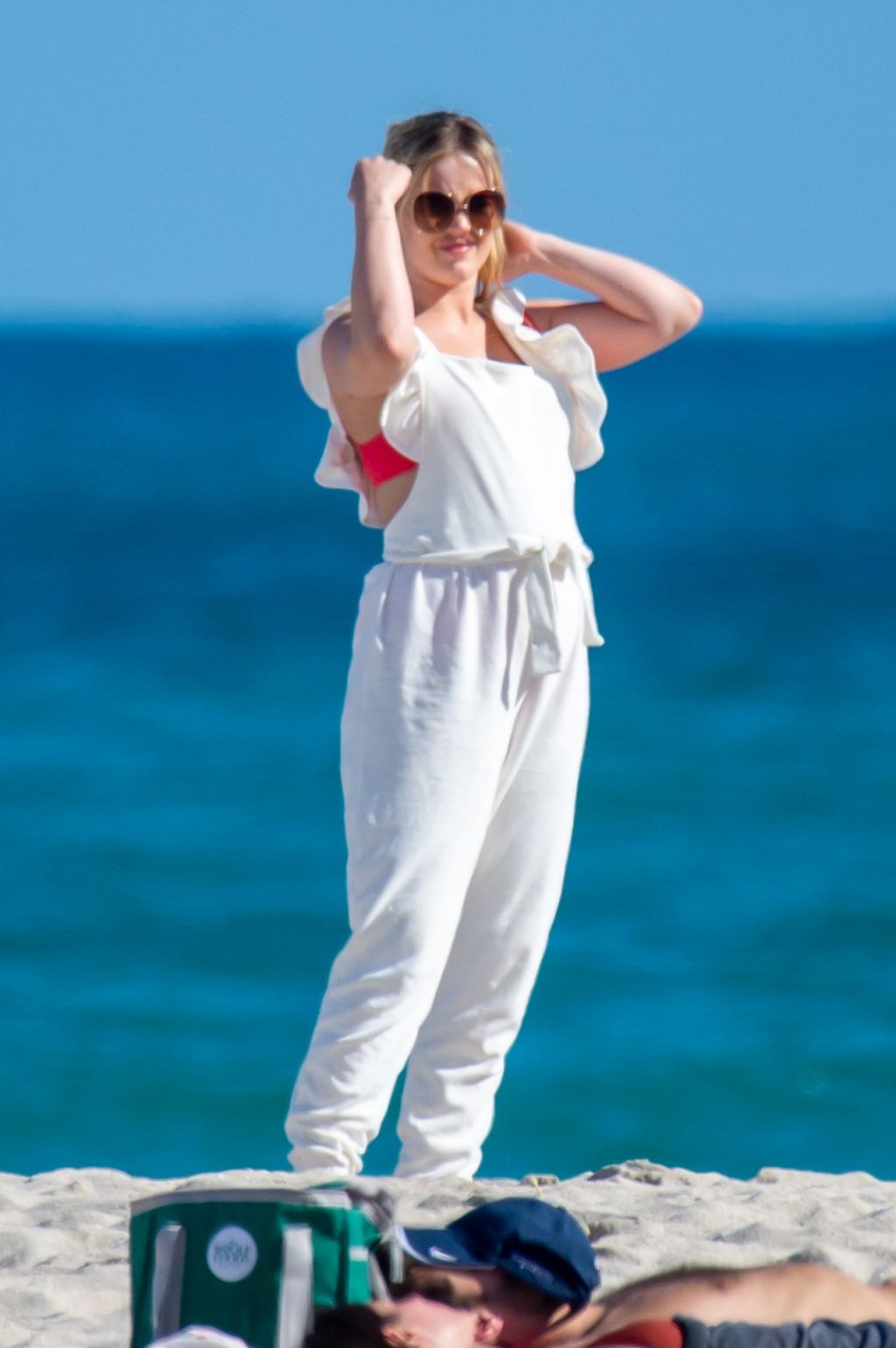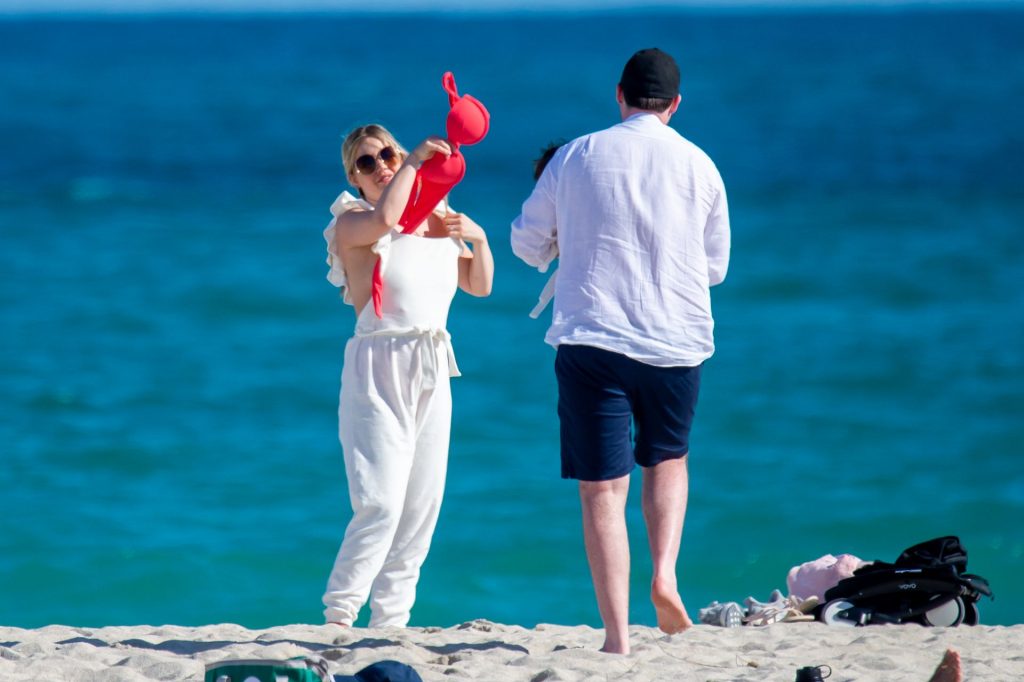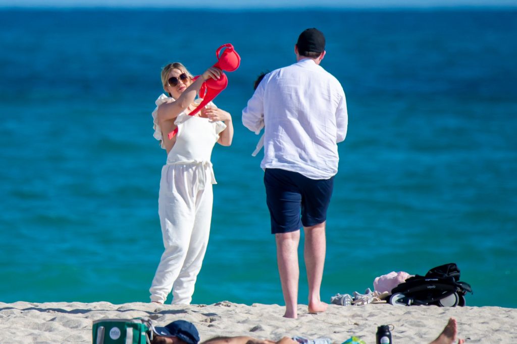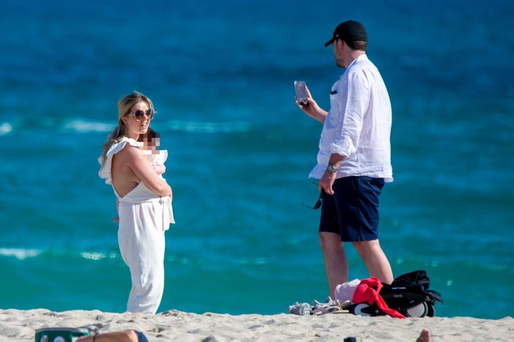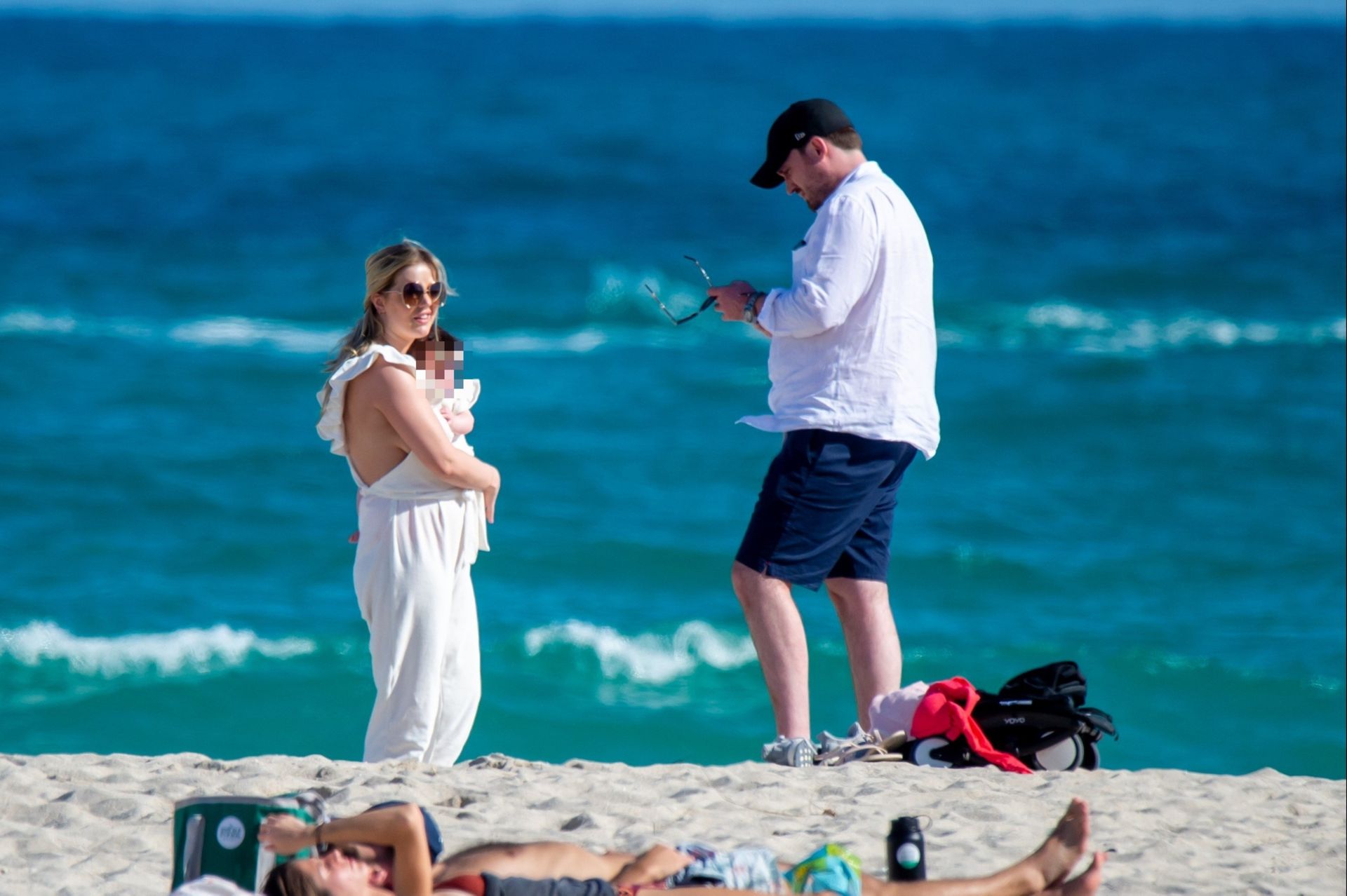 Recién comprometida estrella de Made In Chelsea Tabitha Willett y su prometido Fraser Carruthers son vistos con su bebé durante un paseo por Miami Beach días después del compromiso, 22/11/2019.
