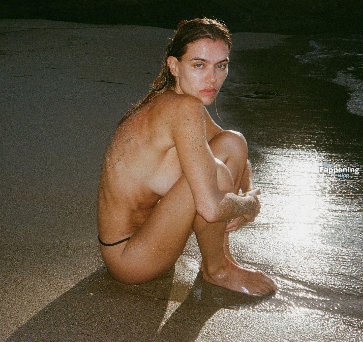 La modelo Joanna Halpin muestra su sideboob mientras posa desnuda en la playa.