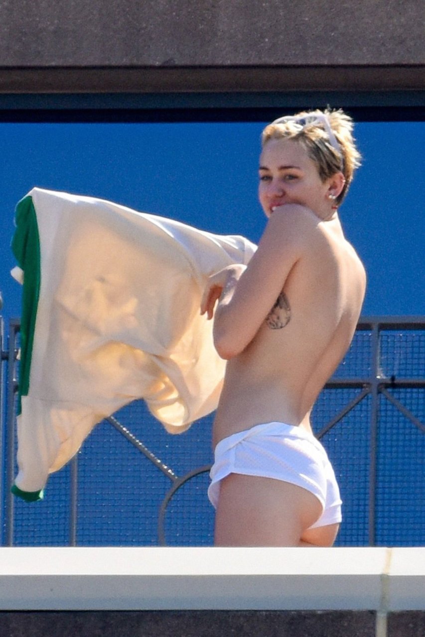 Miley Cyrus se empapó del sol vistiendo solo pantalones cortos blancos en el balcón del hotel en Sídney, 10/10/2014. Fotos antiguas, ¡pero geniales! Miley Cyrus es una actriz y cantante estadounidense. Edad: 23 (23 de noviembre de 1992).