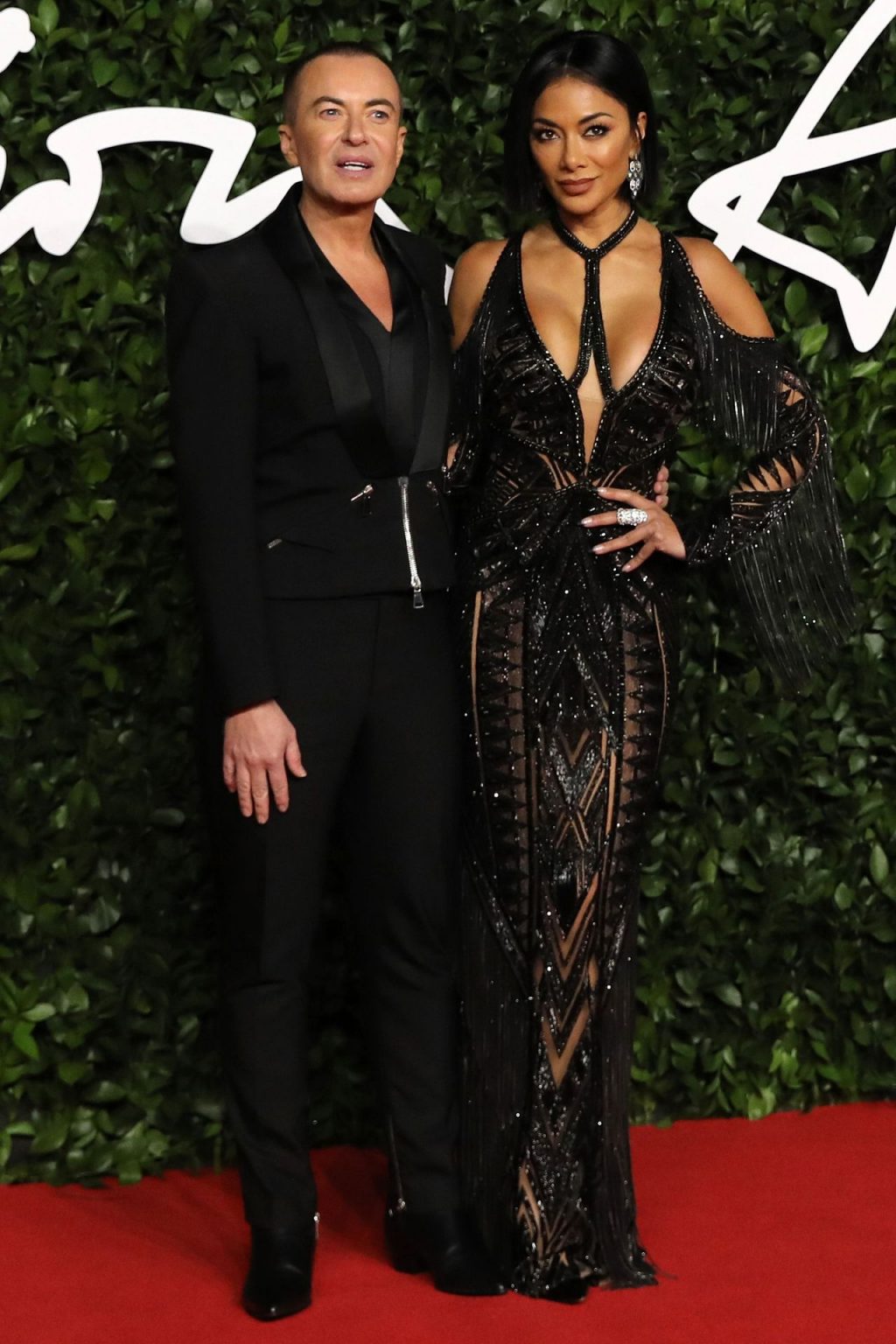El diseñador de moda galés Julien MacDonald y la cantante estadounidense Nicole Scherzinger posan en la alfombra roja a su llegada a los Fashion Awards 2019 en Londres, 12/01/2019