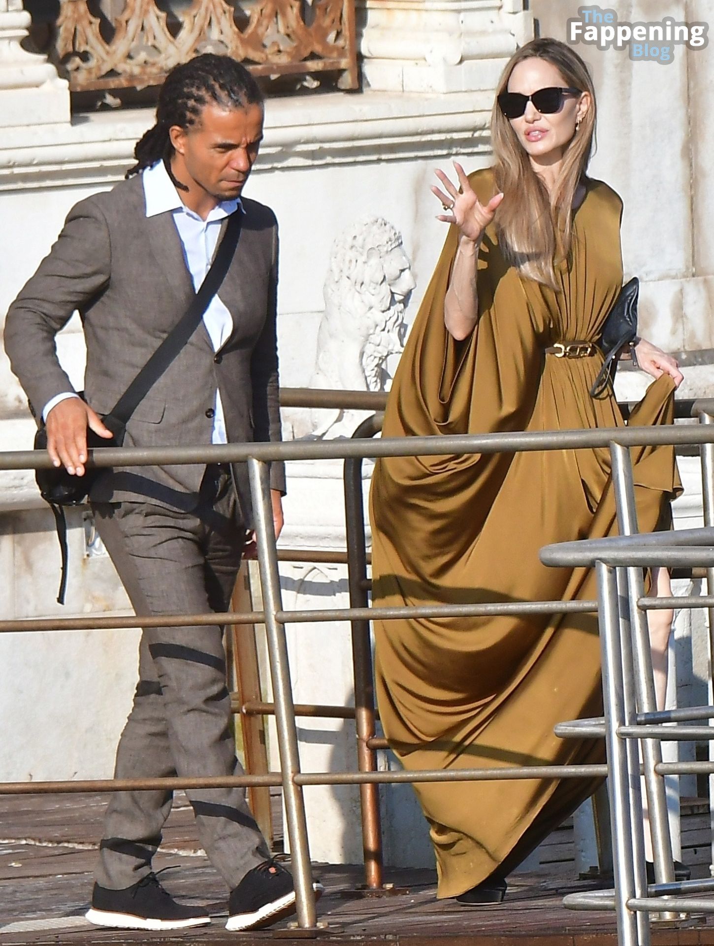 La actriz estadounidense Angelina Jolie se ve impresionante con un vestido de estilo griego, pasando el rato con el rapero Akala mientras salen del hotel para asistir al estreno de ‘Maria’ en el Festival de Cine de Venecia.