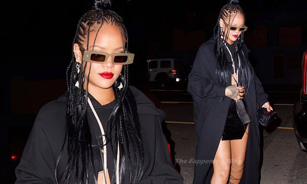 La estrella barbadense del Fappening llamó la atención al lucir sus largas piernas con una minifalda corta, un top revelador y un largo abrigo negro.
