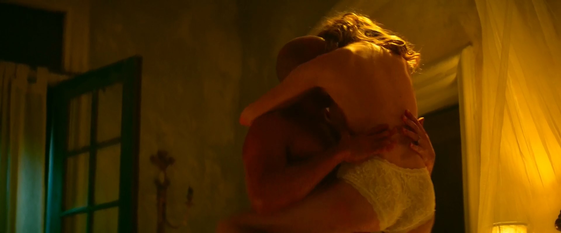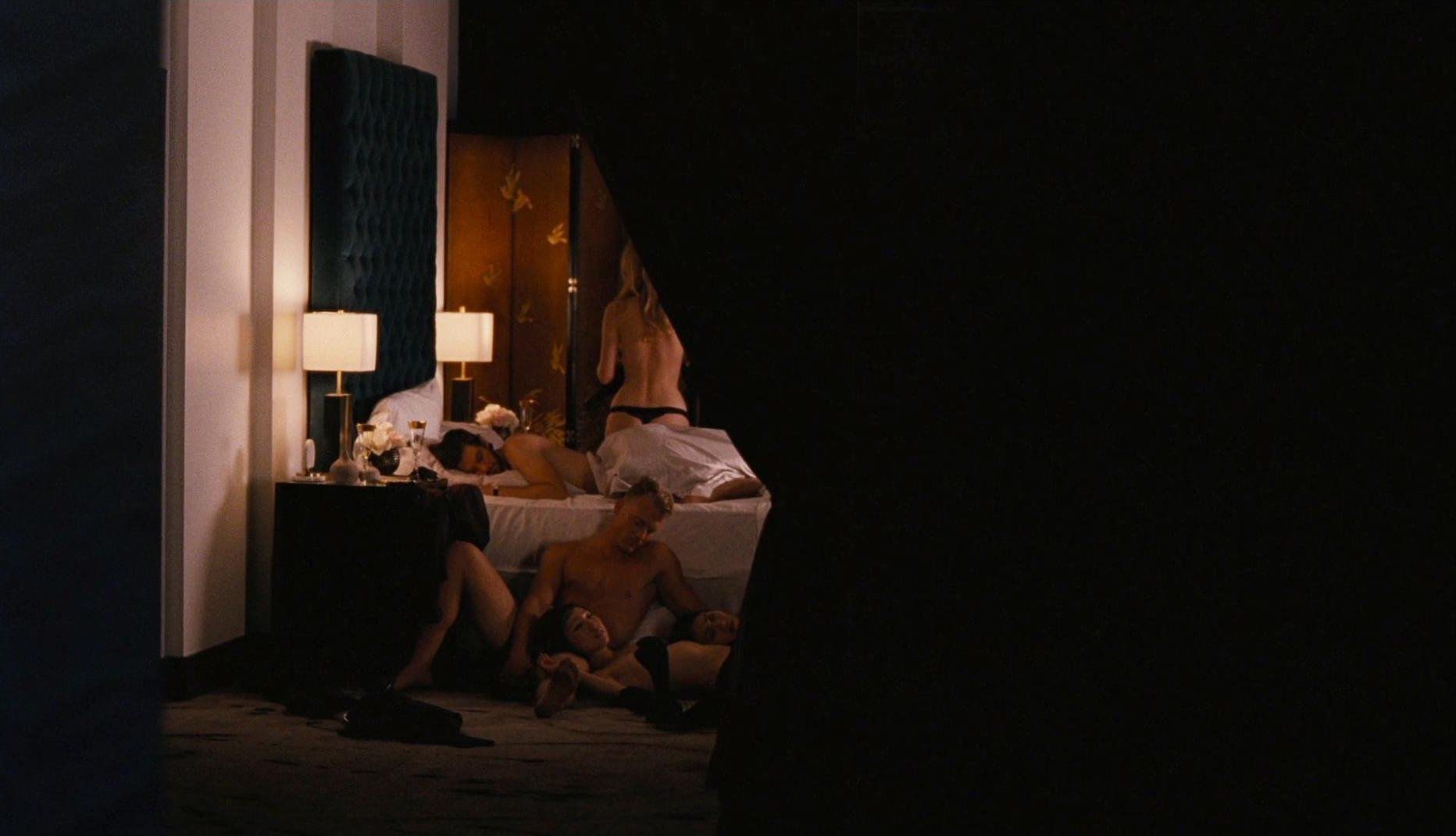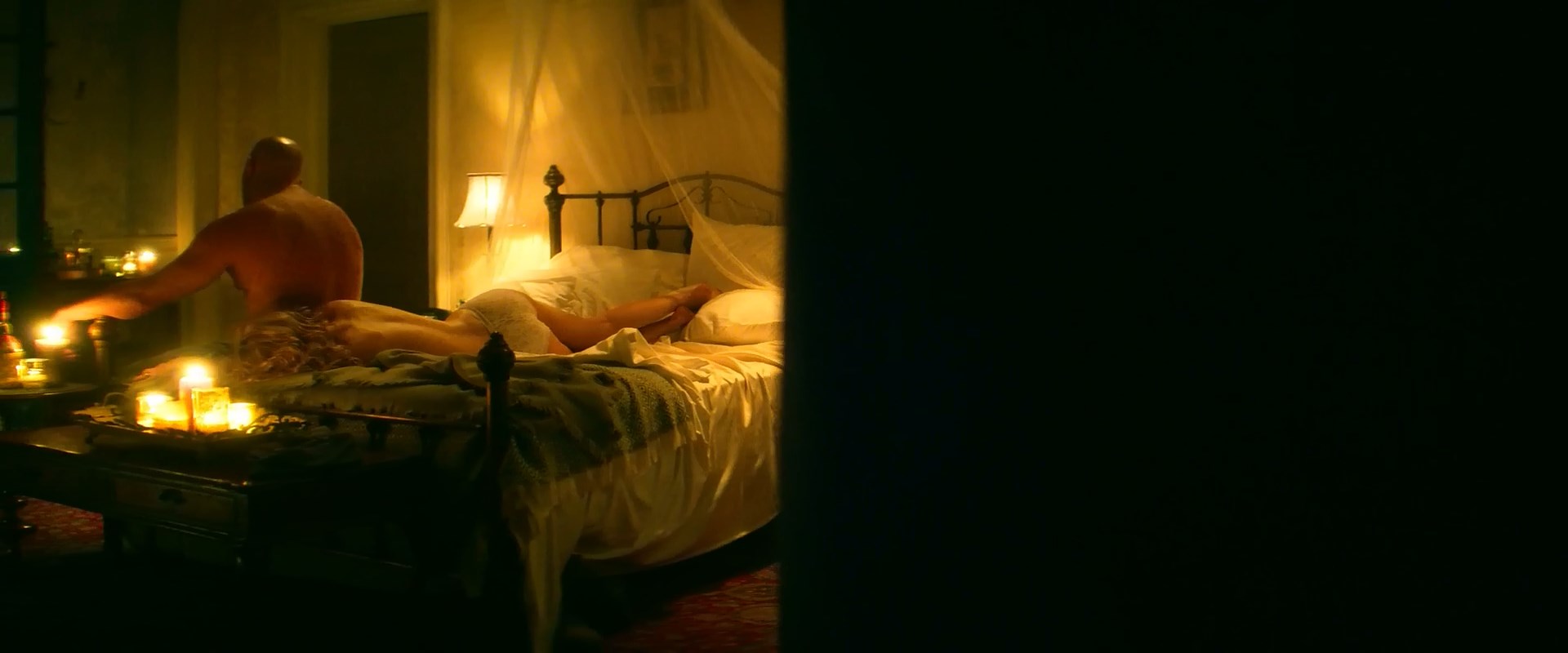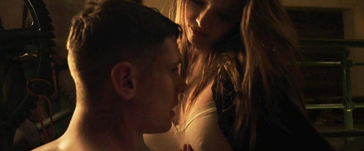 Talulah Riley is in just a pair of panties as she lies on her side in bed and runs his hands over a guy’s back who is sitting beside her. She then lifts herself up, revealing plenty of side boob as she sits behind the guy and puts her arms around him. We then again almost see her full breast but not quite a nipple as she climbs into his arms and then lays down on top of him.