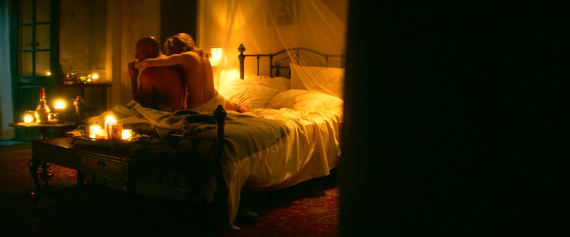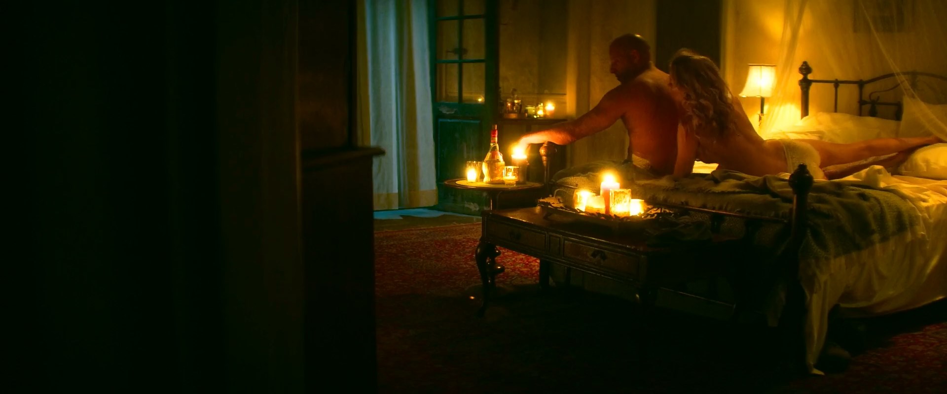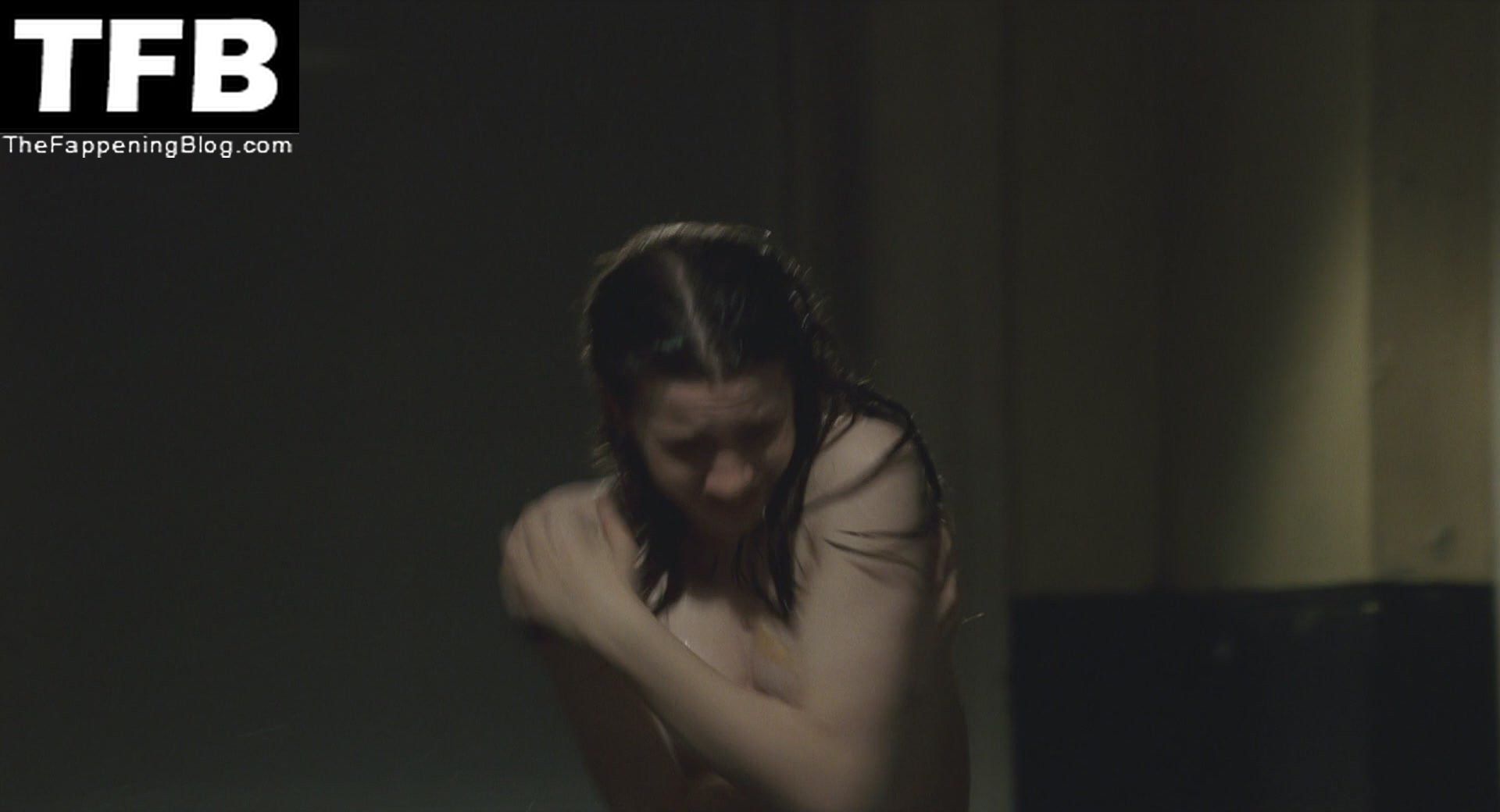 Talulah Riley is in just a pair of panties as she lies on her side in bed and runs his hands over a guy’s back who is sitting beside her. She then lifts herself up, revealing plenty of side boob as she sits behind the guy and puts her arms around him. We then again almost see her full breast but not quite a nipple as she climbs into his arms and then lays down on top of him.