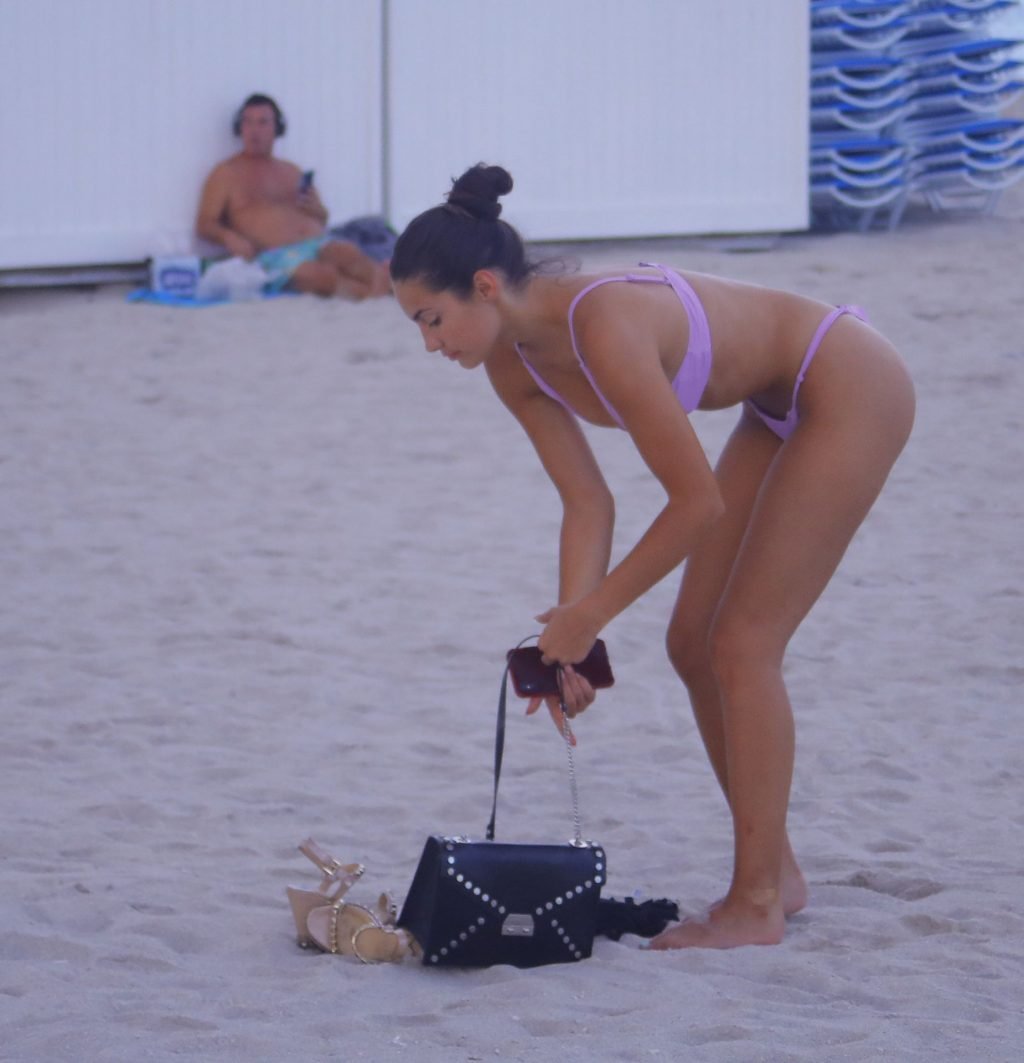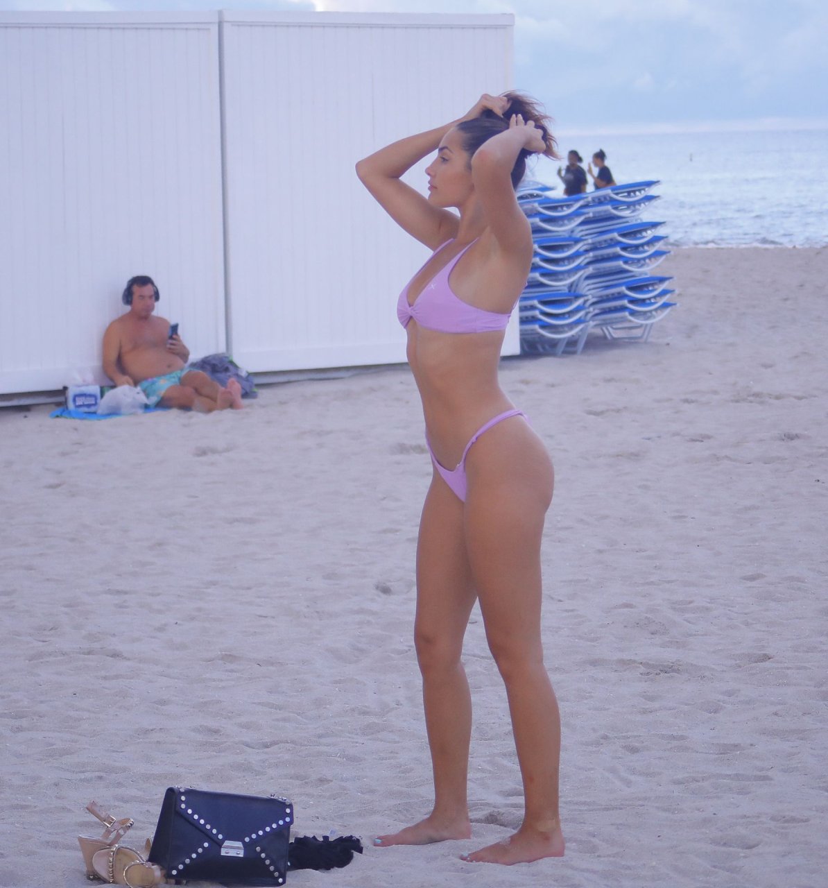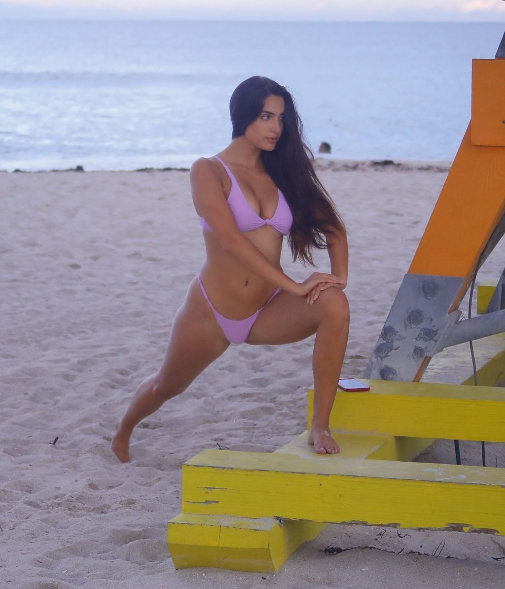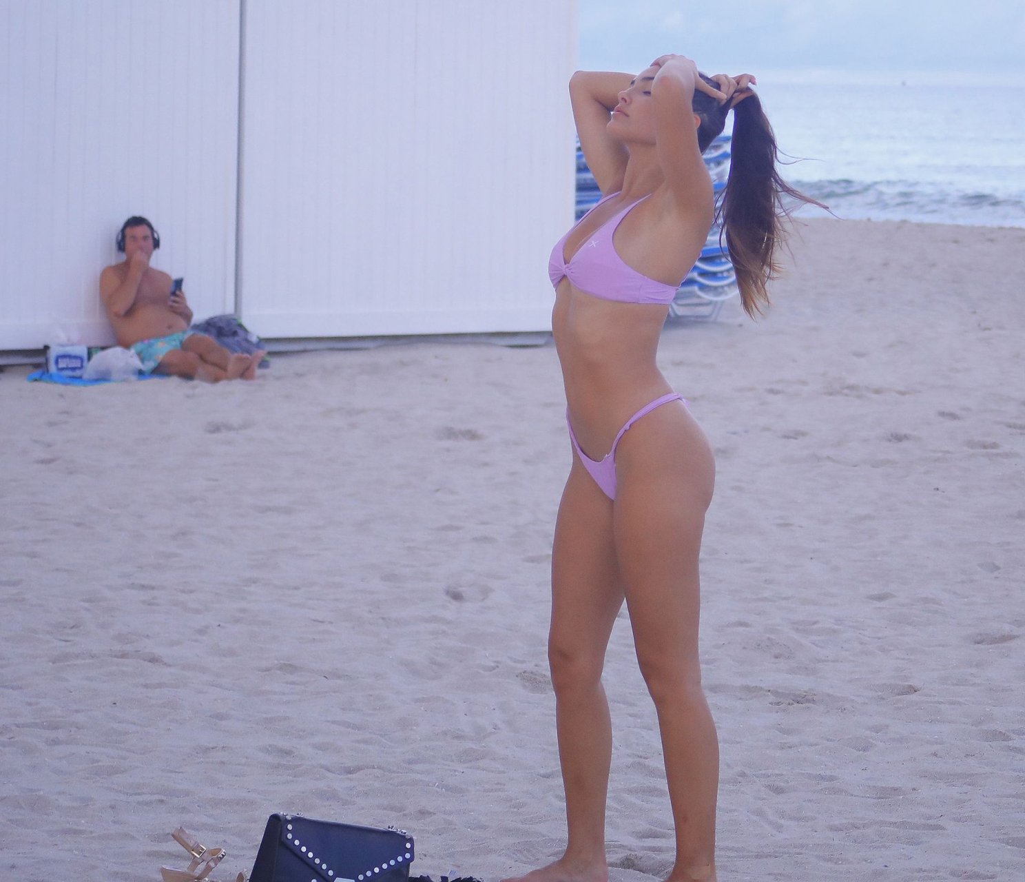 Tao Wickrath muestra su tonificado cuerpo de playa mientras se estira cerca de una torre de salvavidas a pocos días de que la Tormenta Tropical Dorian golpee South Beach, 28/08/2019.