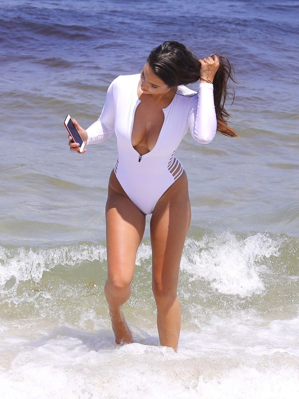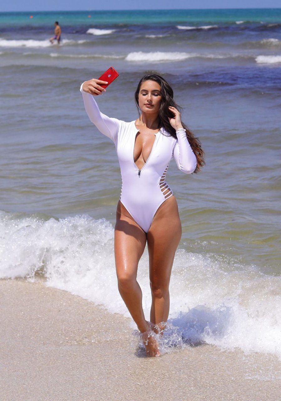 La modelo francesa Tao Wickrath deslumbra con un traje de baño blanco mientras se toma selfies en un puesto de salvavidas, haciendo sus mejores poses de ‘Baywatch’ e incluso saltando después de casi ser mordida por un insecto mientras disfruta de un día caluroso durante el fin de semana del Día de los Caídos en Miami, 24/05/2019.