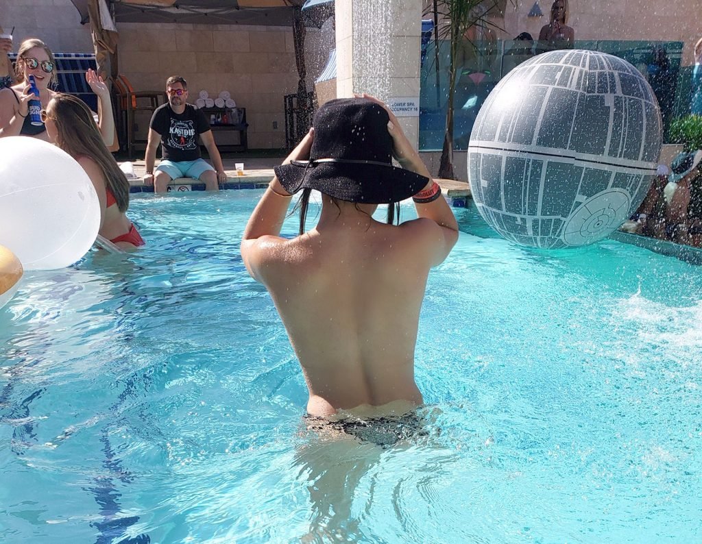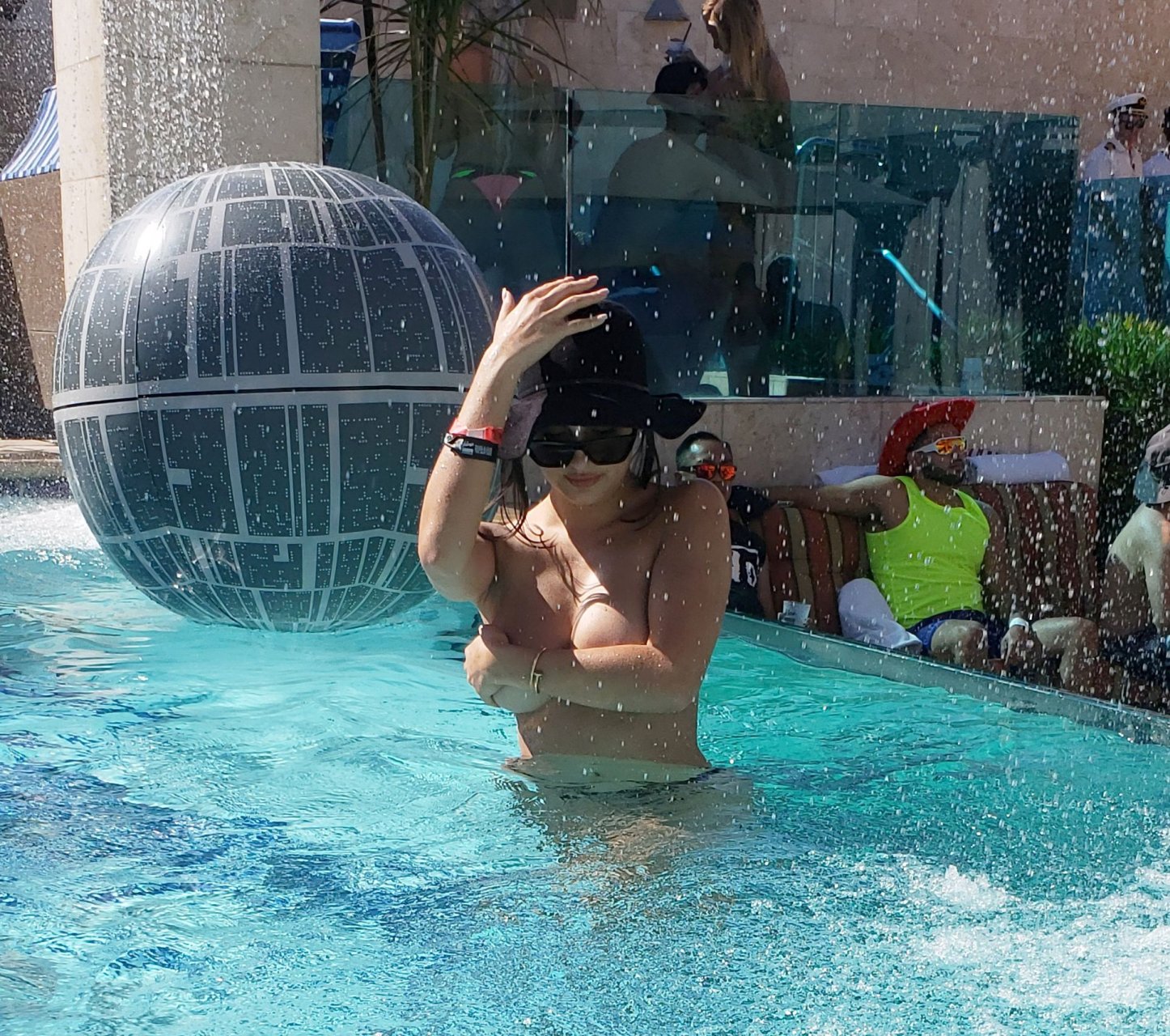 La modelo disfrutaba en la piscina VIP del club diurno Sapphire, donde tenían un globo de la estrella de la muerte de Star Wars en la piscina junto a ella. Tao también fue vista más tarde en la piscina del Ceasar’s Palace mientras sostenía una lata en la mano para celebrar la fiesta mexicana bajo el sol caliente.