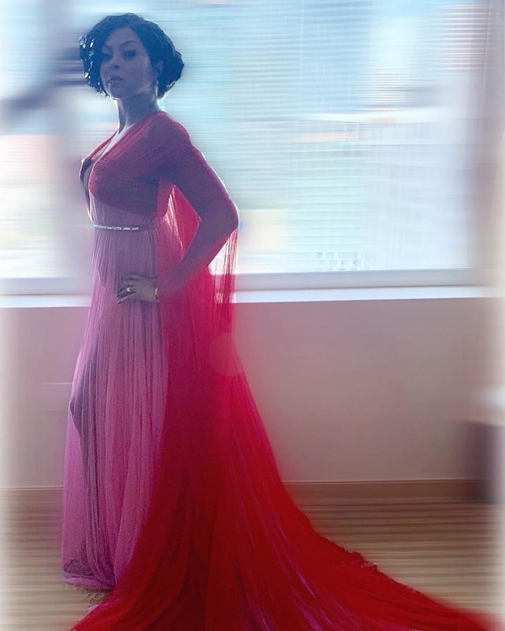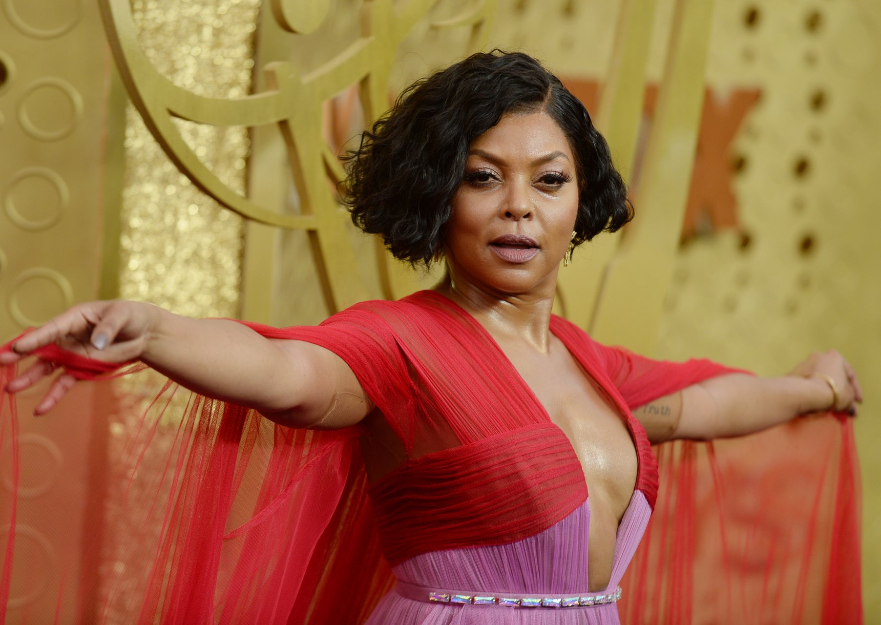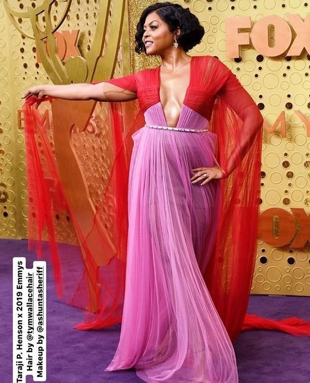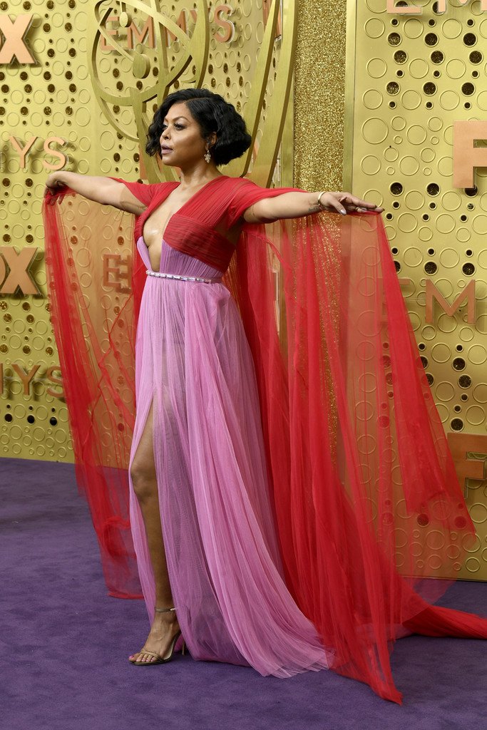 Actriz Taraji P. Henson compartió su maravilloso estado de ánimo, pechos y piernas, vistiendo un vestido ligero rojo-rosado en la 71ª entrega de los premios Emmy en Los Ángeles, 22/09/2019.
