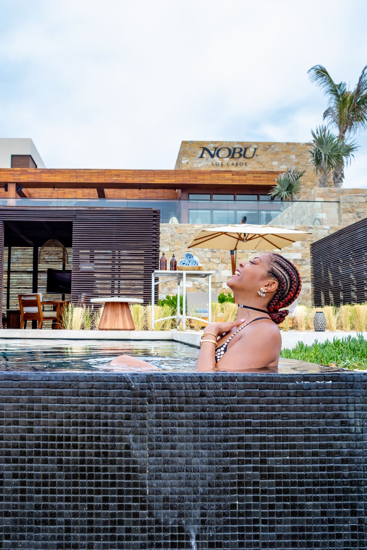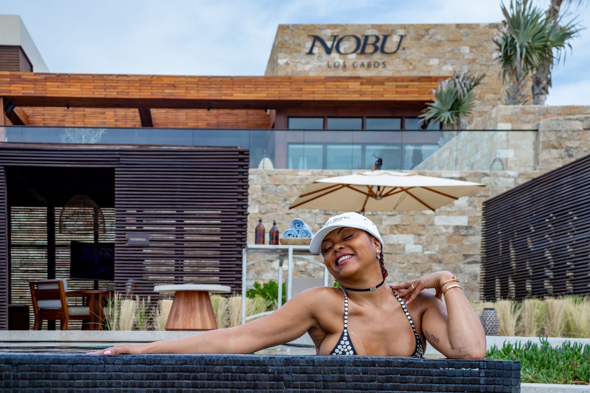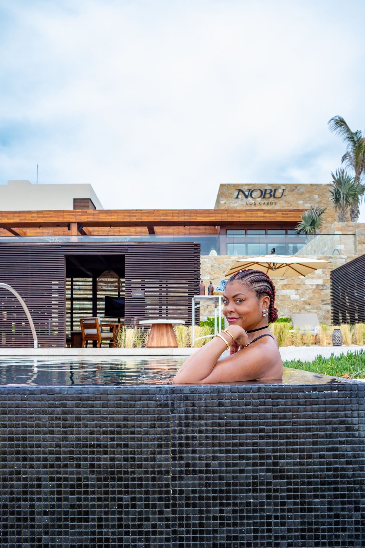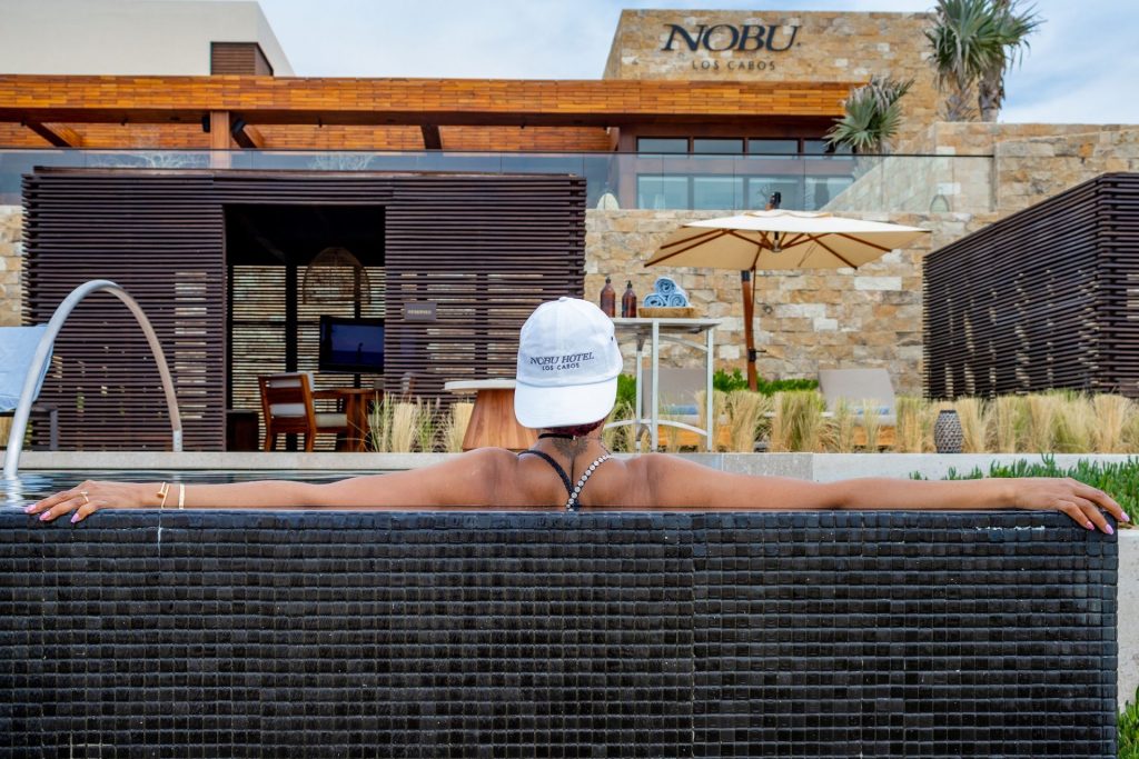 La actriz de 49 años se puso un atrevido traje de baño negro adornado con joyas y disfrutó de un tiempo de calidad con Kelvin, con quien se casará el 4 de abril, en el Hotel Nobu Los Cabos.
