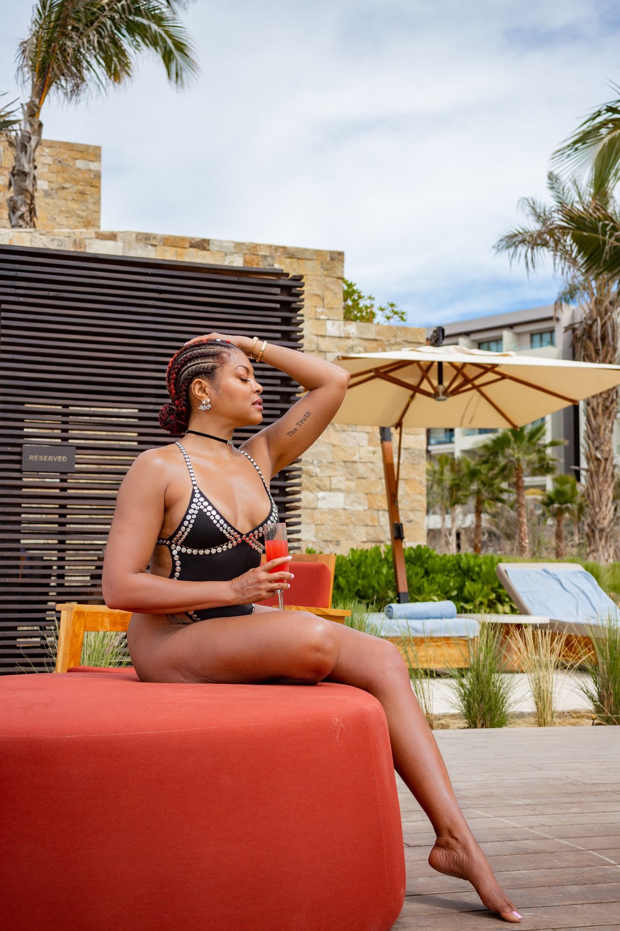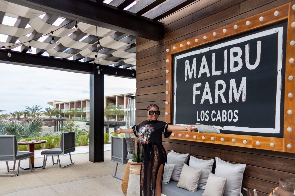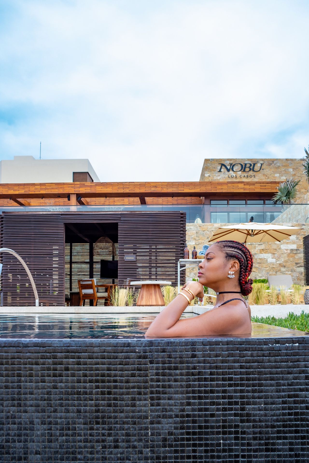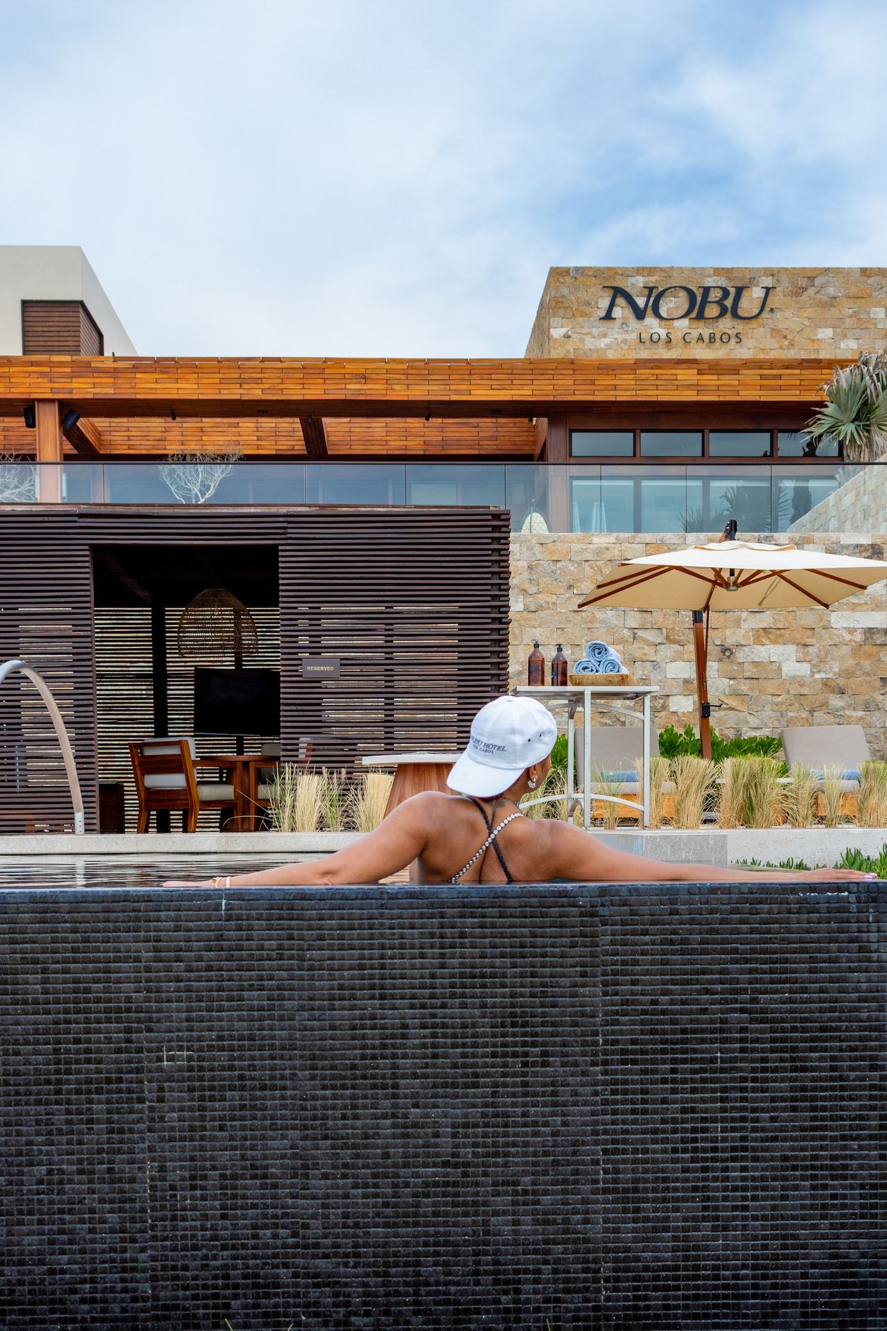 La actriz de 49 años se puso un atrevido traje de baño negro adornado con joyas y disfrutó de un tiempo de calidad con Kelvin, con quien se casará el 4 de abril, en el Hotel Nobu Los Cabos.