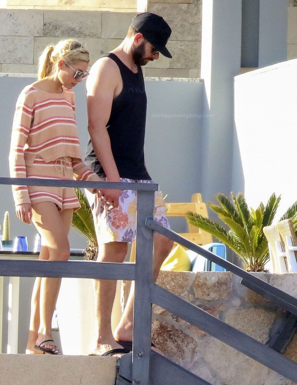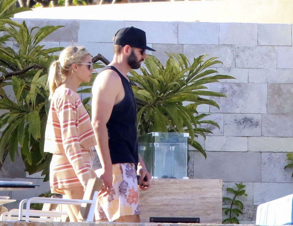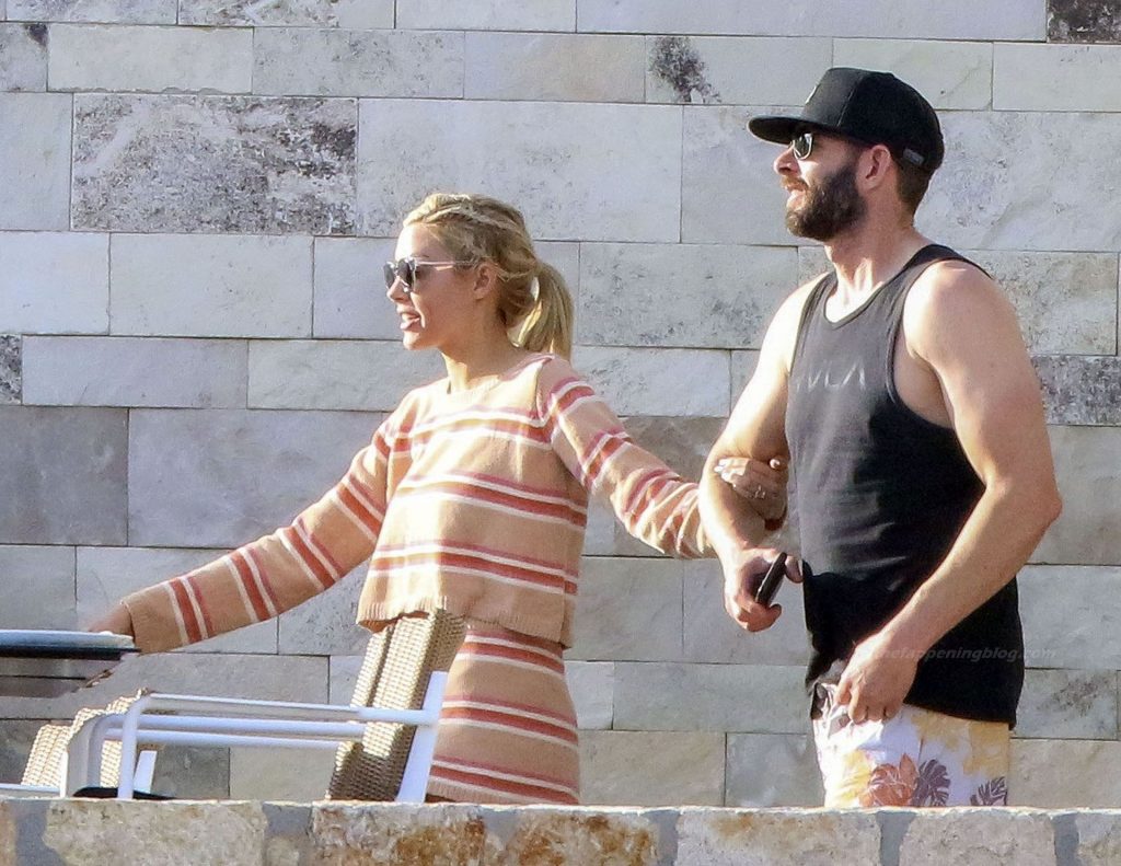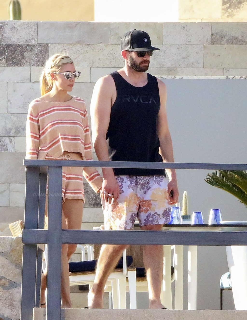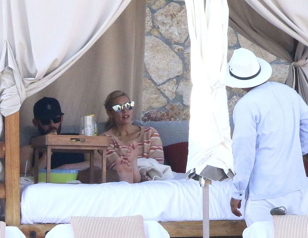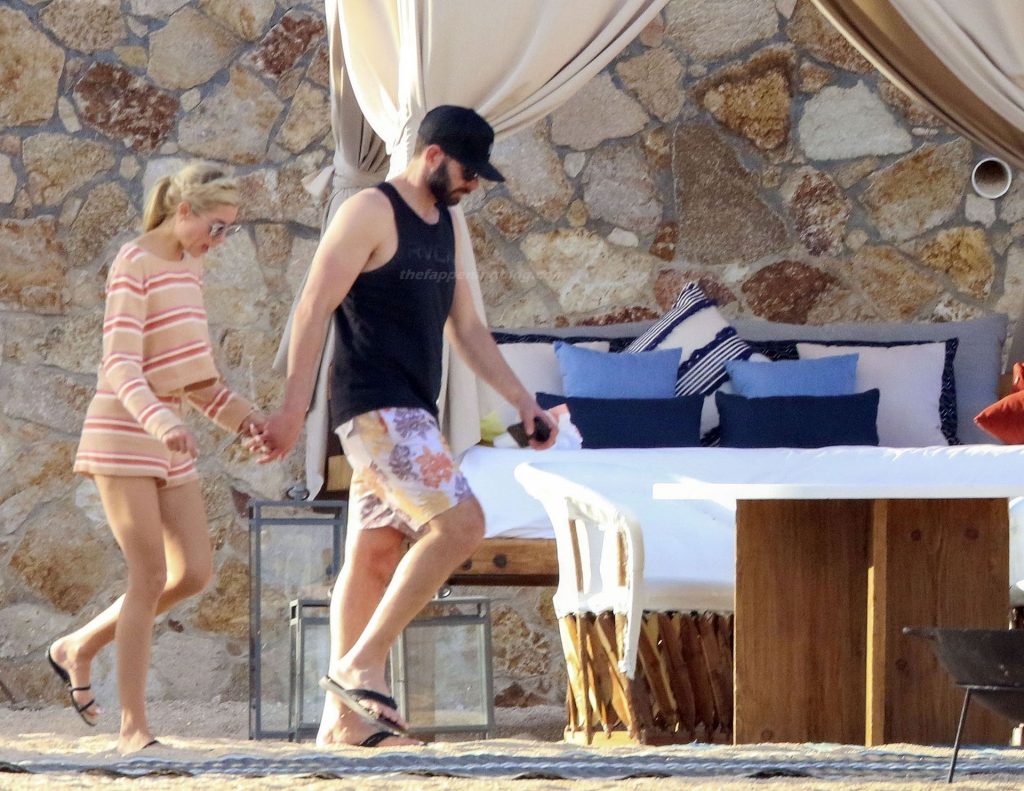 Selling Sunset miembro del elenco llevaba un traje de baño rosa fuerte de un solo hombro con pantalones cortos de punto, mientras que Tarek mantenía su camiseta puesta mientras la pareja tomaba el sol en Cabo, el domingo.