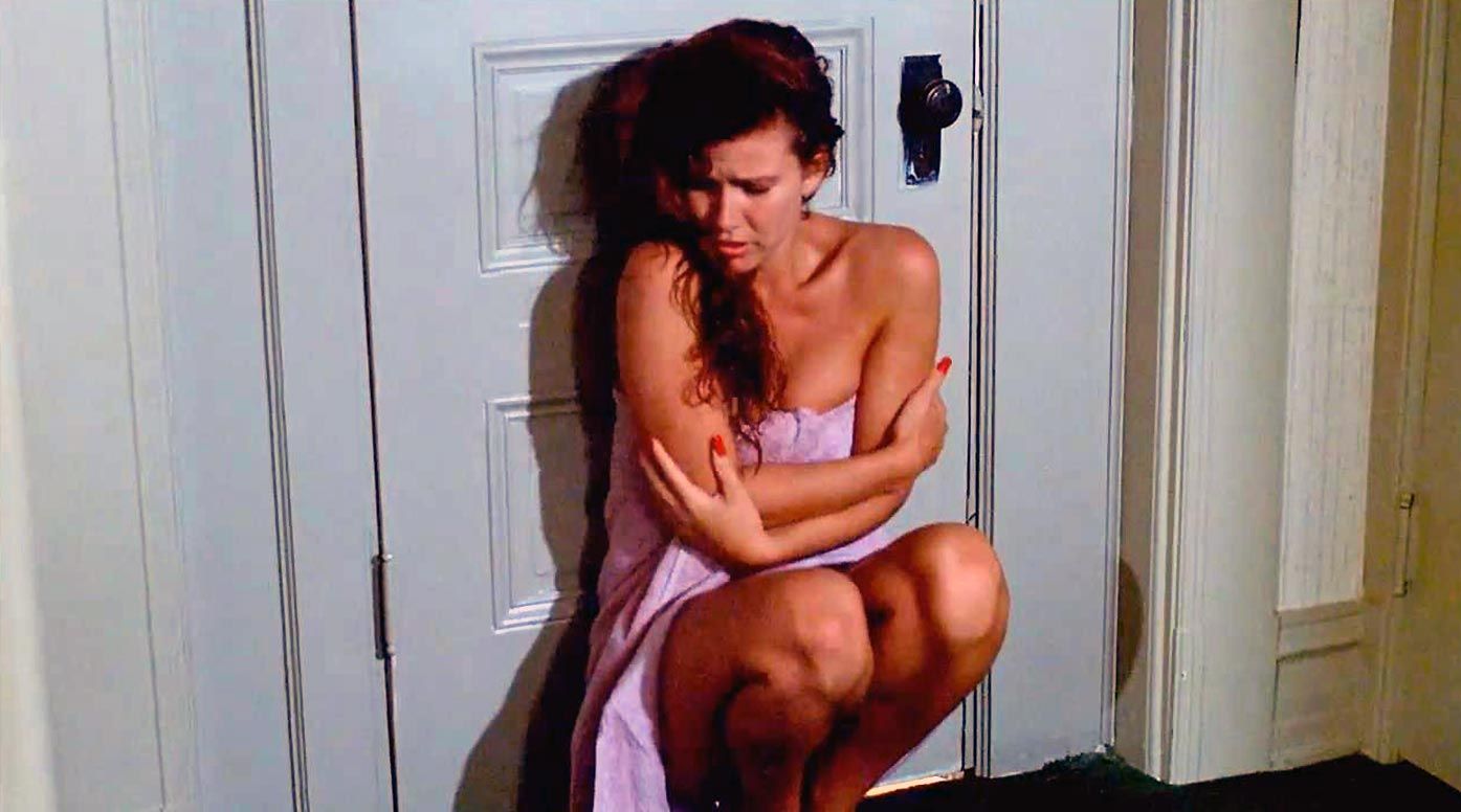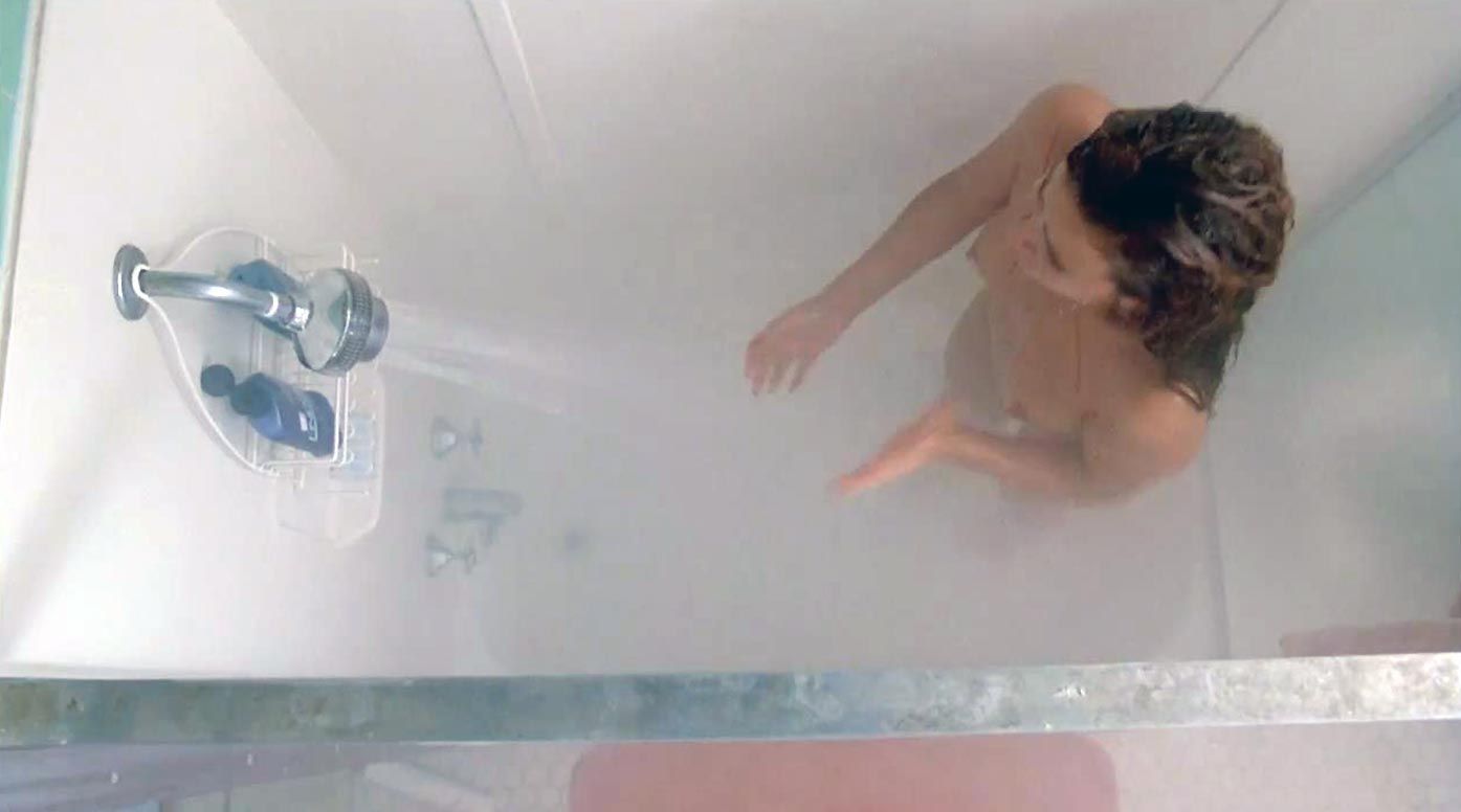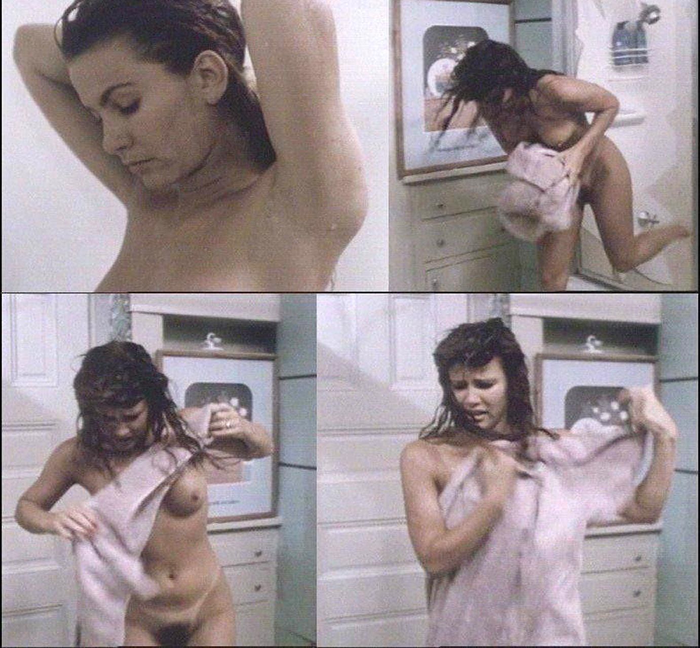 The next scene is from a movie called ‘Witchboard’. As she attempts to turn off the water in the bathroom, Tawny Kitaen is seen nude from above. She immediately smashes the mirror and emerges from the tub wholly clothed, exposing her breasts and bush before wrapping herself in a towel. She then exposes some cleavage when banging against a closed door and squatting next to it while looking for a robe at the foot of a bunk.