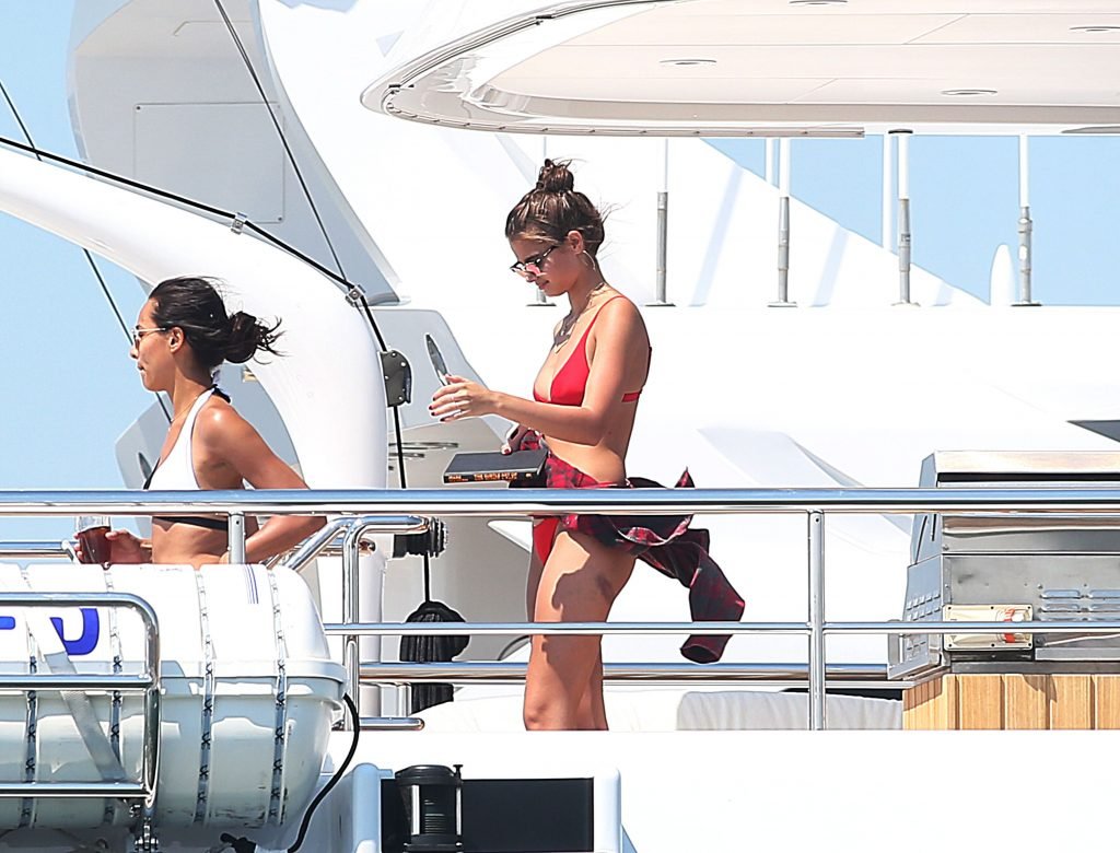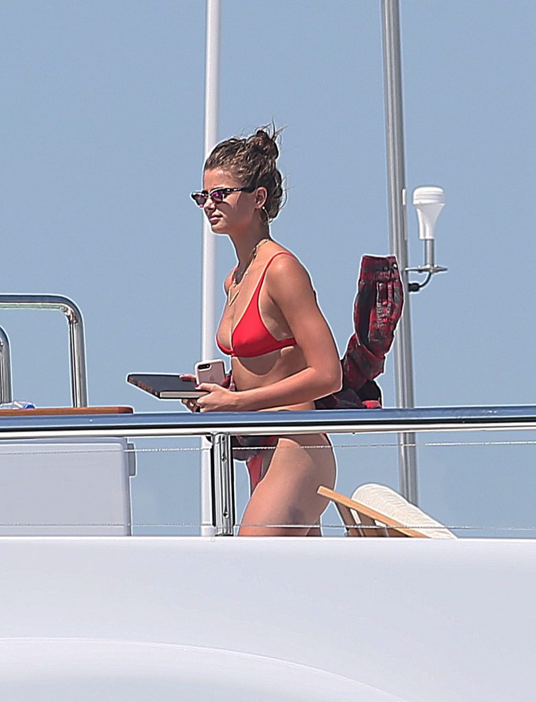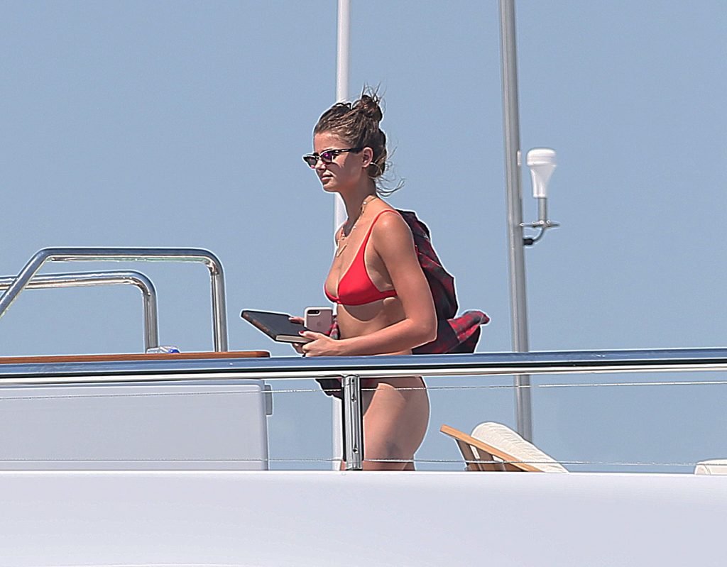 Taylor Marie Hill lleva un bikini rojo mientras disfruta con amigos en un mega yate en Saint-Tropez, 24/07/2017. Taylor Hill es una modelo de moda de Palatine (Condado de Cook, Illinois). Edad: 21 años.