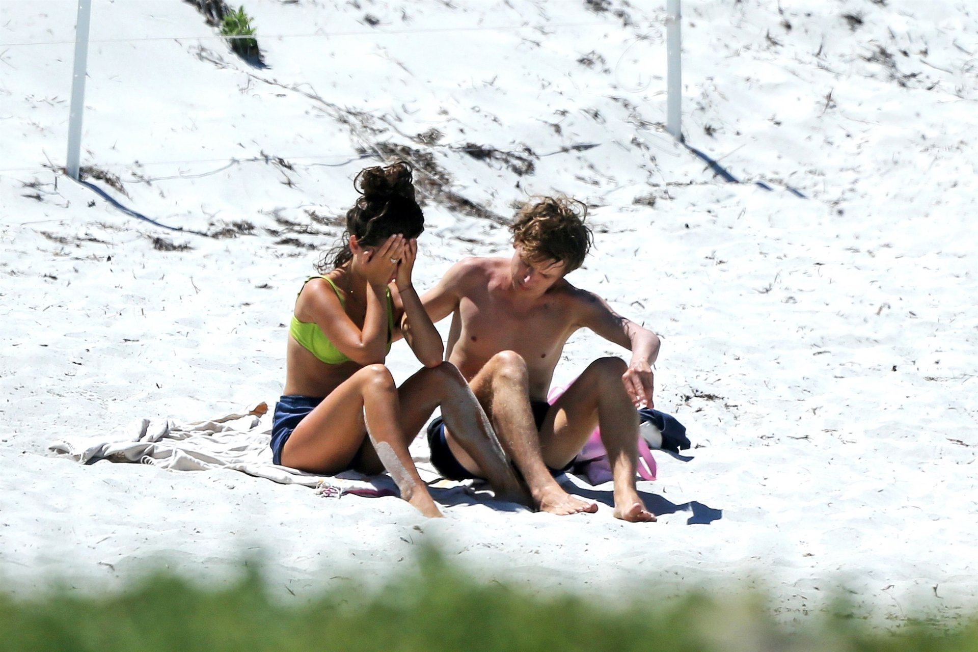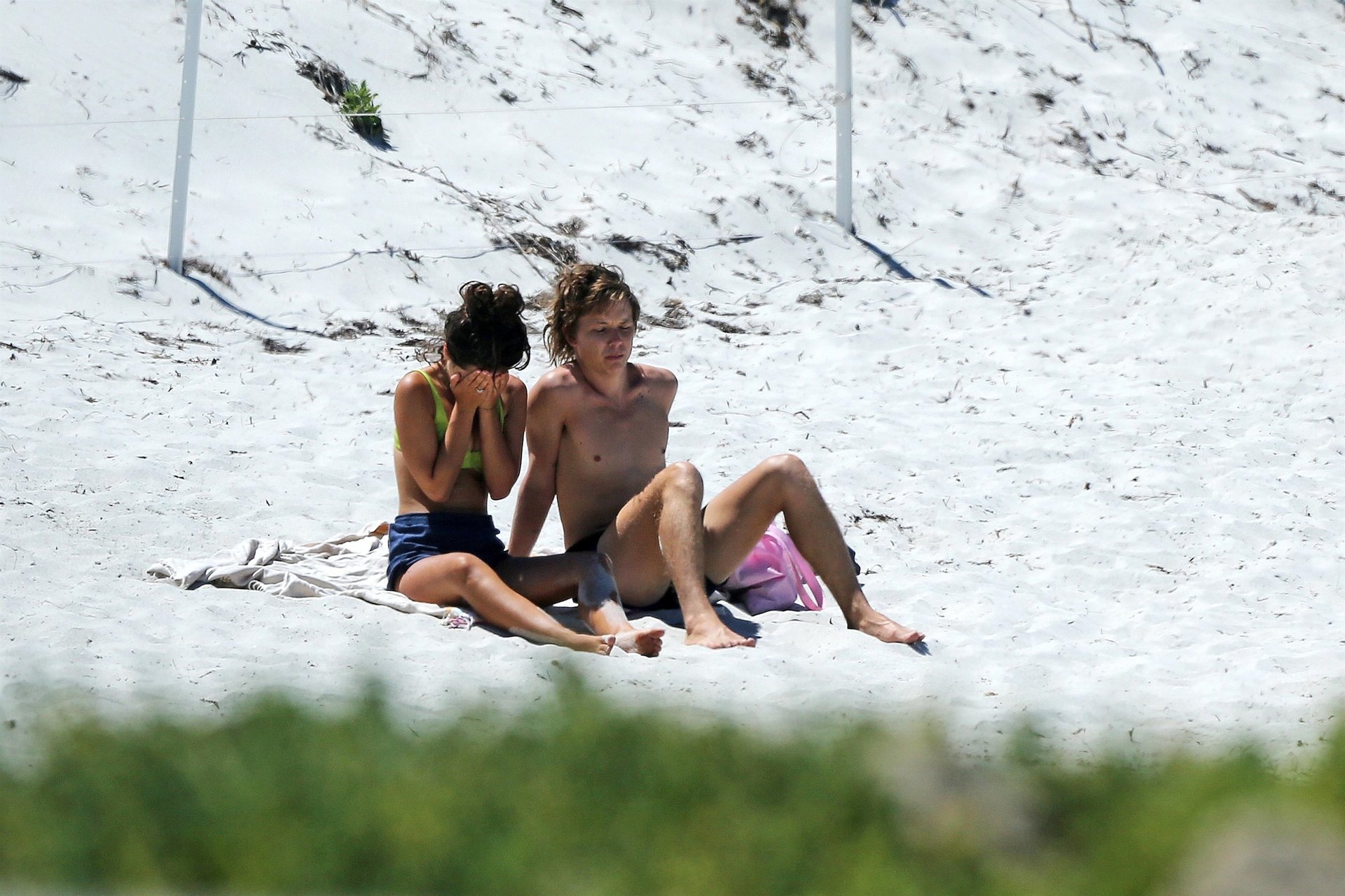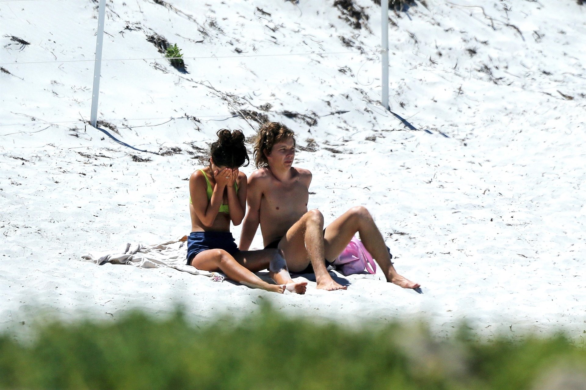 Tiger Lily Hutchence (23) está completamente enamorada del líder de Pond, Nick Allbrook, en la playa de Perth, Australia, 30/11/2019. La pareja se desnudó hasta la ropa interior. Tiger Lily parecía estar llorando cuando llegó a la playa antes de que su novio Nick la consolara. La joven pareja jugó en el agua juntos, luciendo muy enamorados antes de subirse a sus bicicletas.