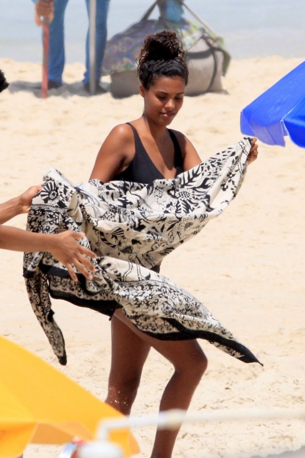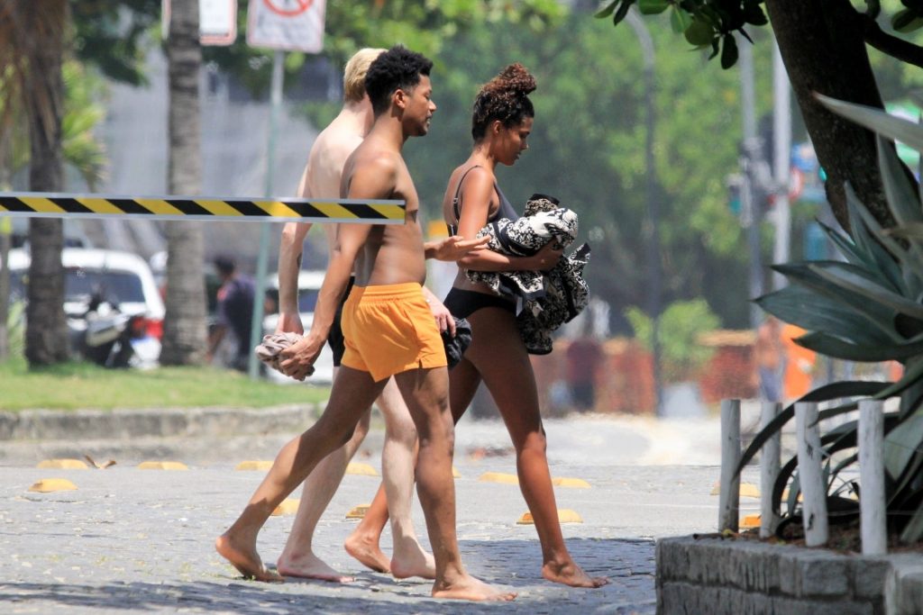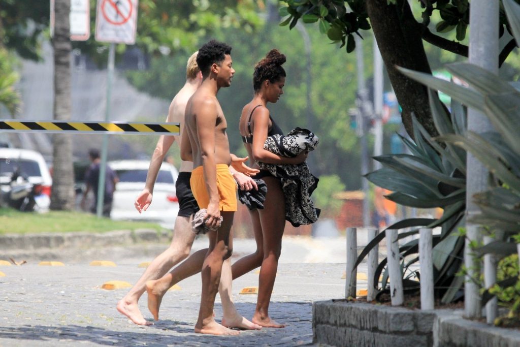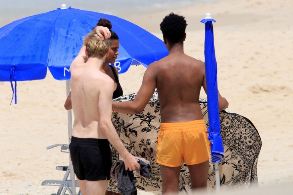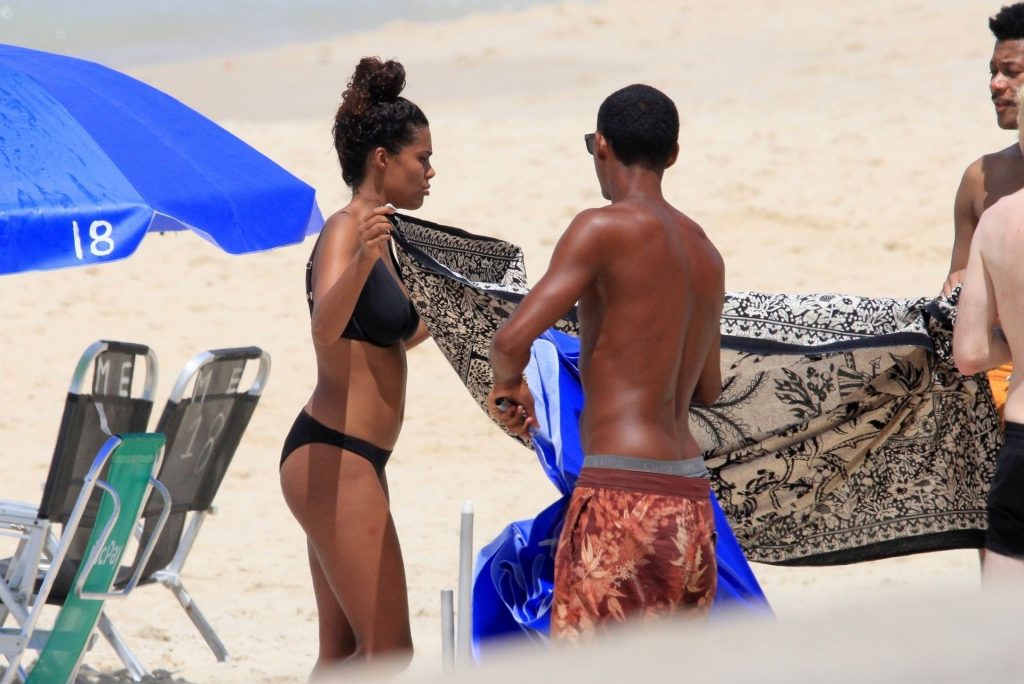 La esposa del modelo Vincent Cassel, Tina Kunakey, está acompañada por dos amigas para un día de playa en Río de Janeiro, 24/02/2020. La modelo, vistiendo un bikini negro, dobla una toalla de playa antes de salir de la playa con sus dos amigas.