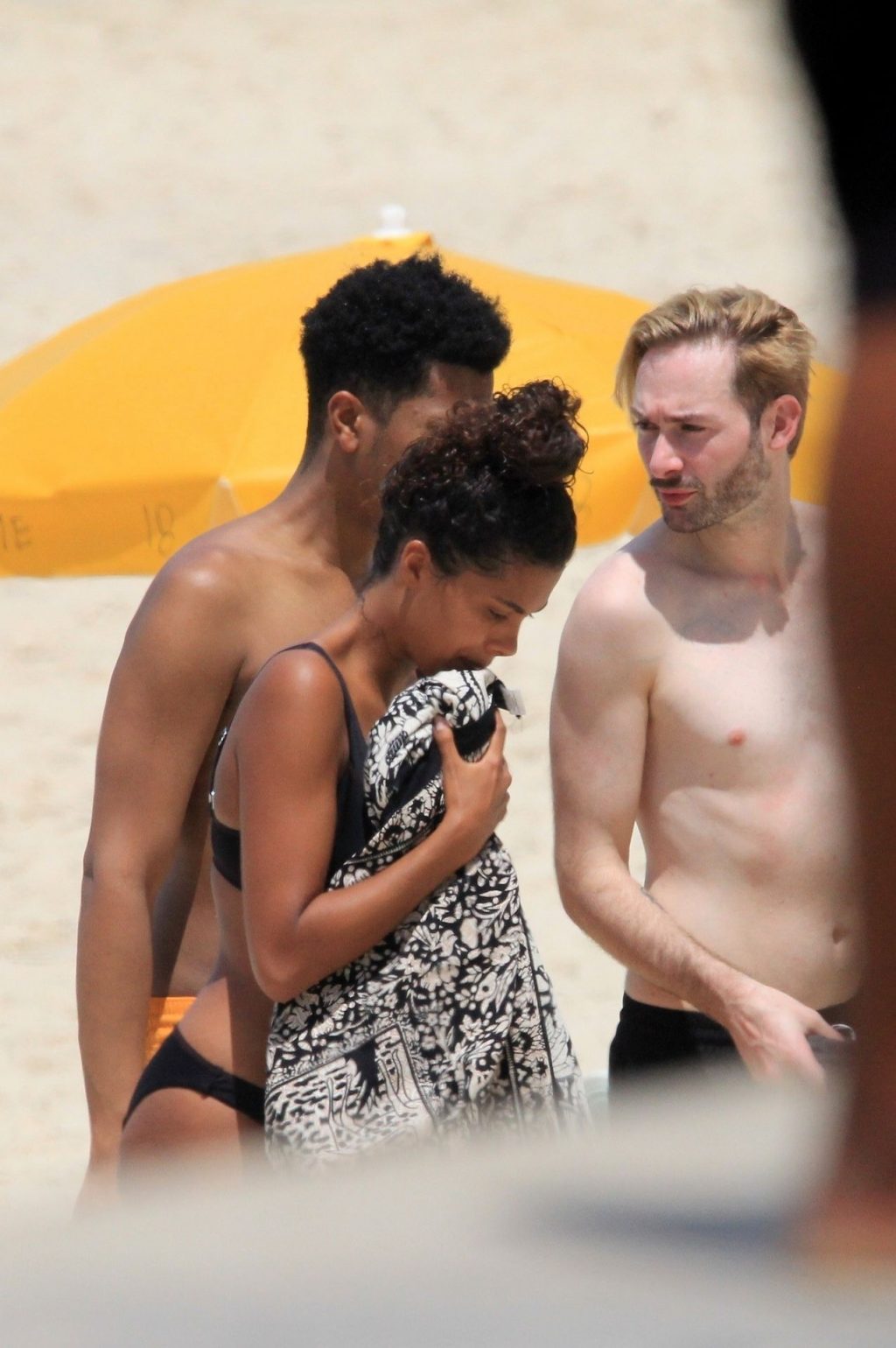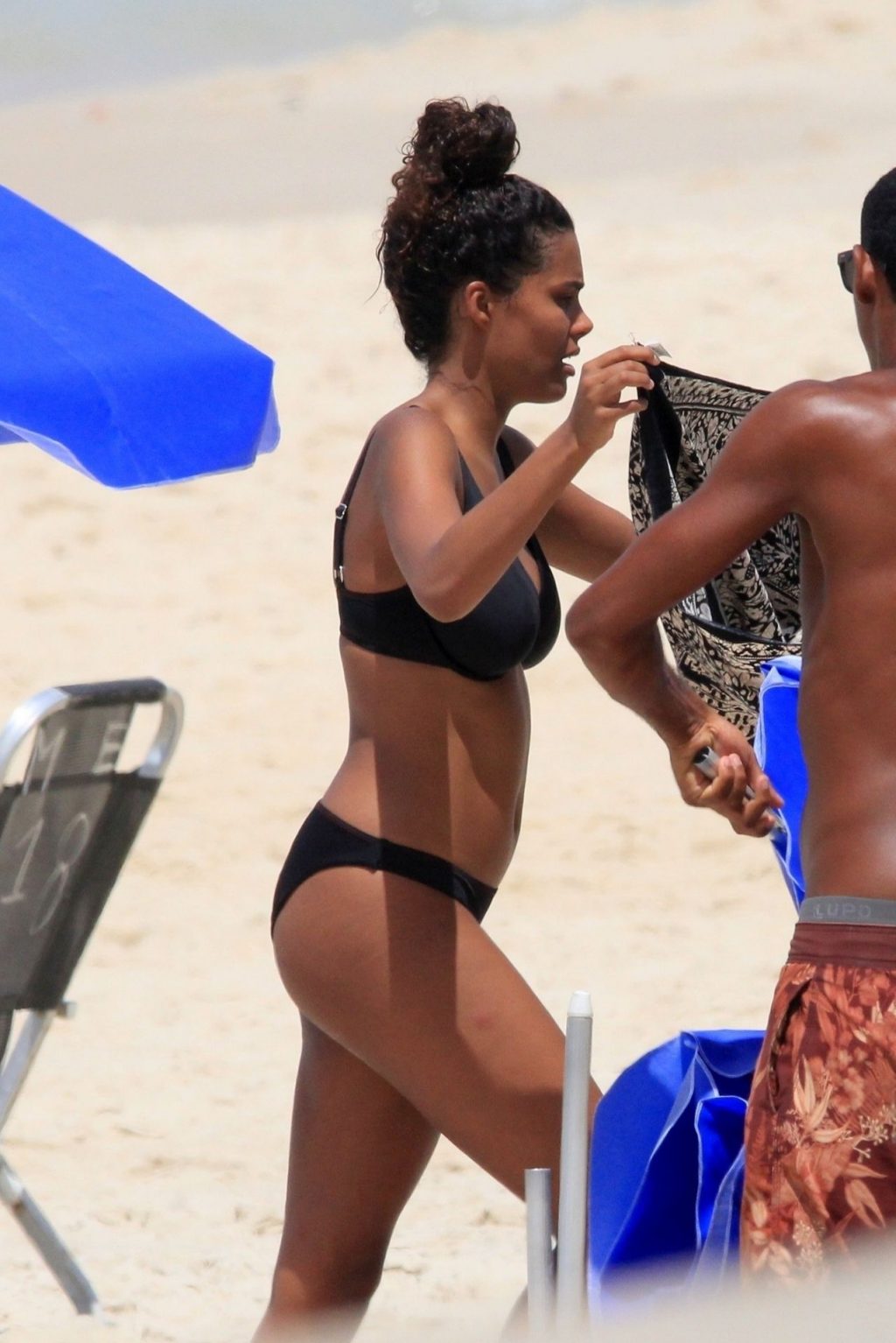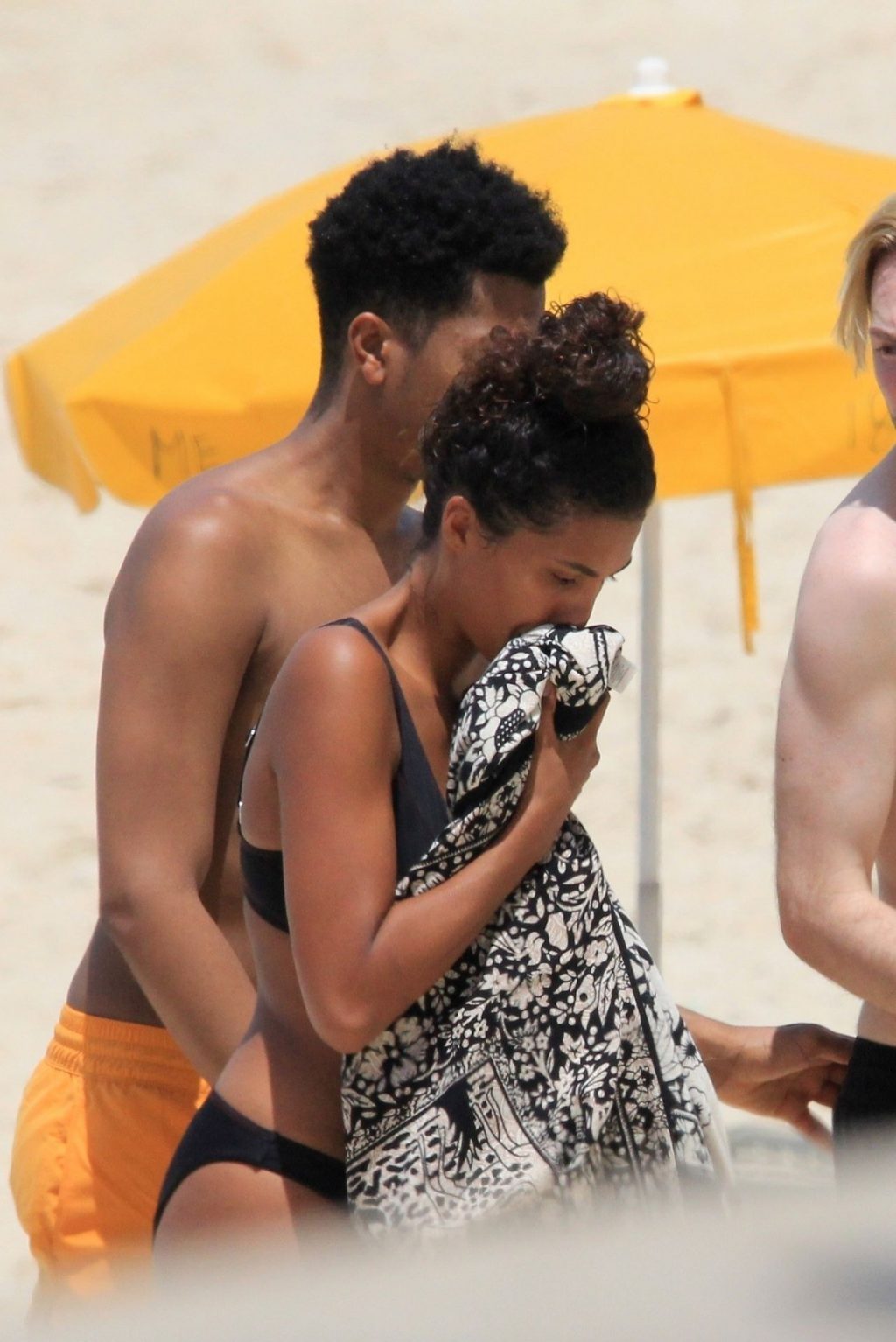 La esposa del modelo Vincent Cassel, Tina Kunakey, está acompañada por dos amigas para un día de playa en Río de Janeiro, 24/02/2020. La modelo, vistiendo un bikini negro, dobla una toalla de playa antes de salir de la playa con sus dos amigas.