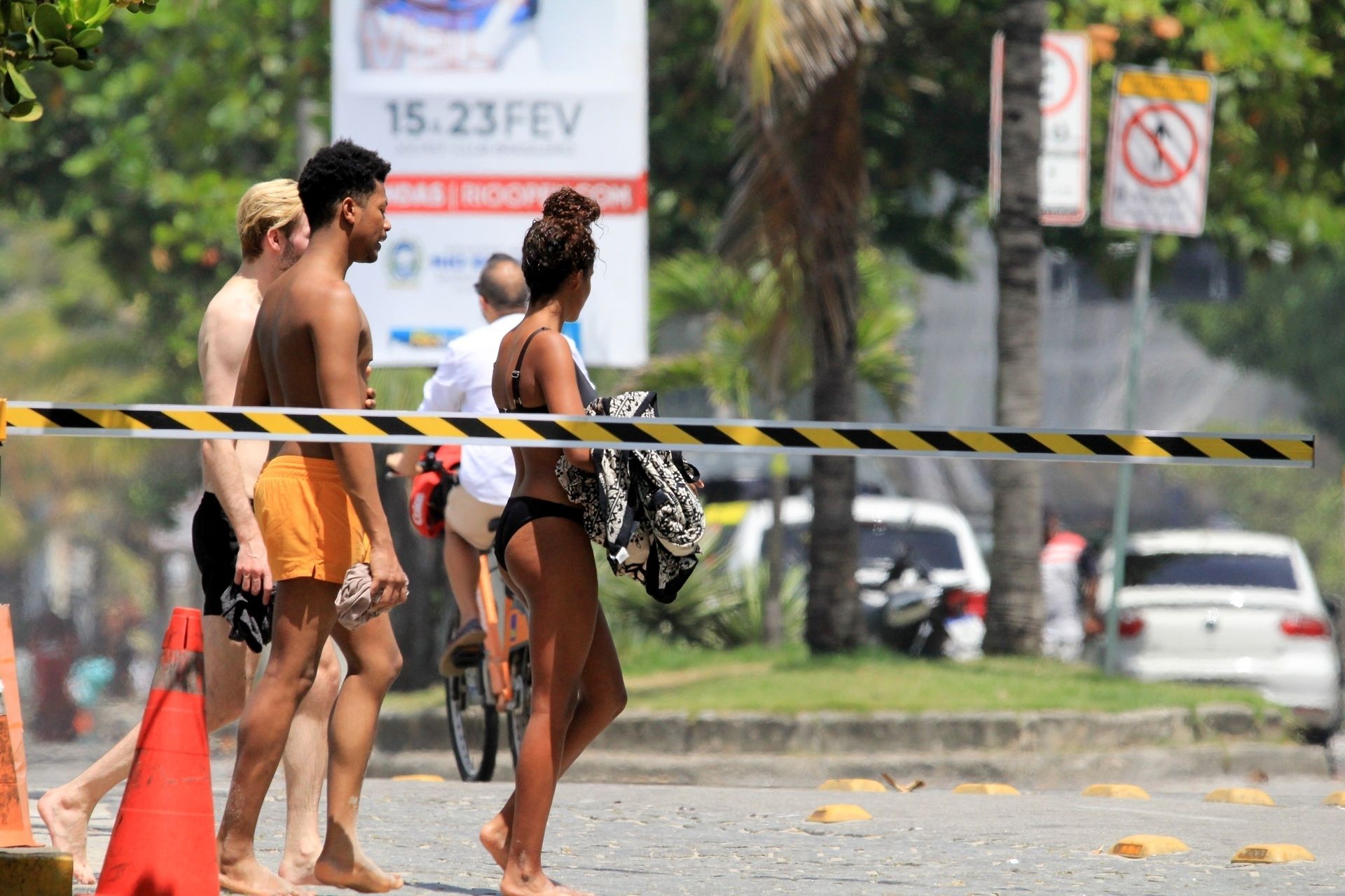 La esposa del modelo Vincent Cassel, Tina Kunakey, está acompañada por dos amigas para un día de playa en Río de Janeiro, 24/02/2020. La modelo, vistiendo un bikini negro, dobla una toalla de playa antes de salir de la playa con sus dos amigas.