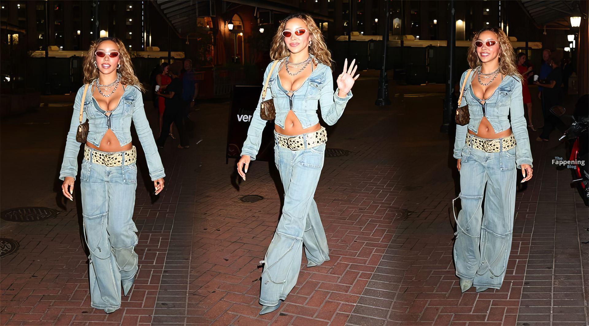 Tinashe luce sus sensuales pechos en un conjunto de mezclilla en la fiesta del Super Bowl (24 fotos)