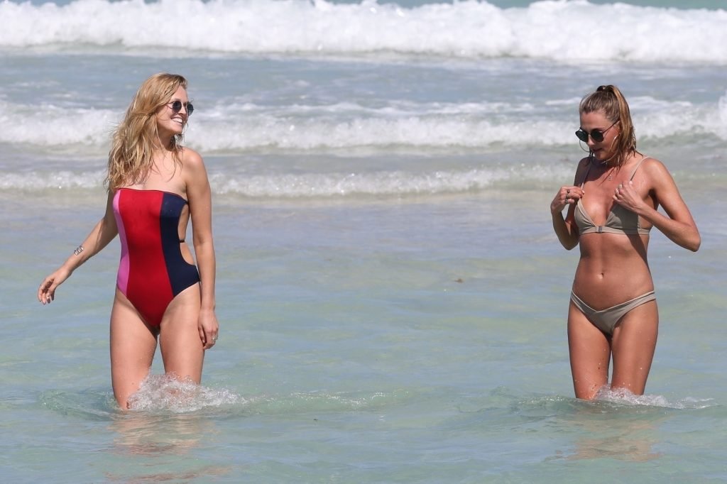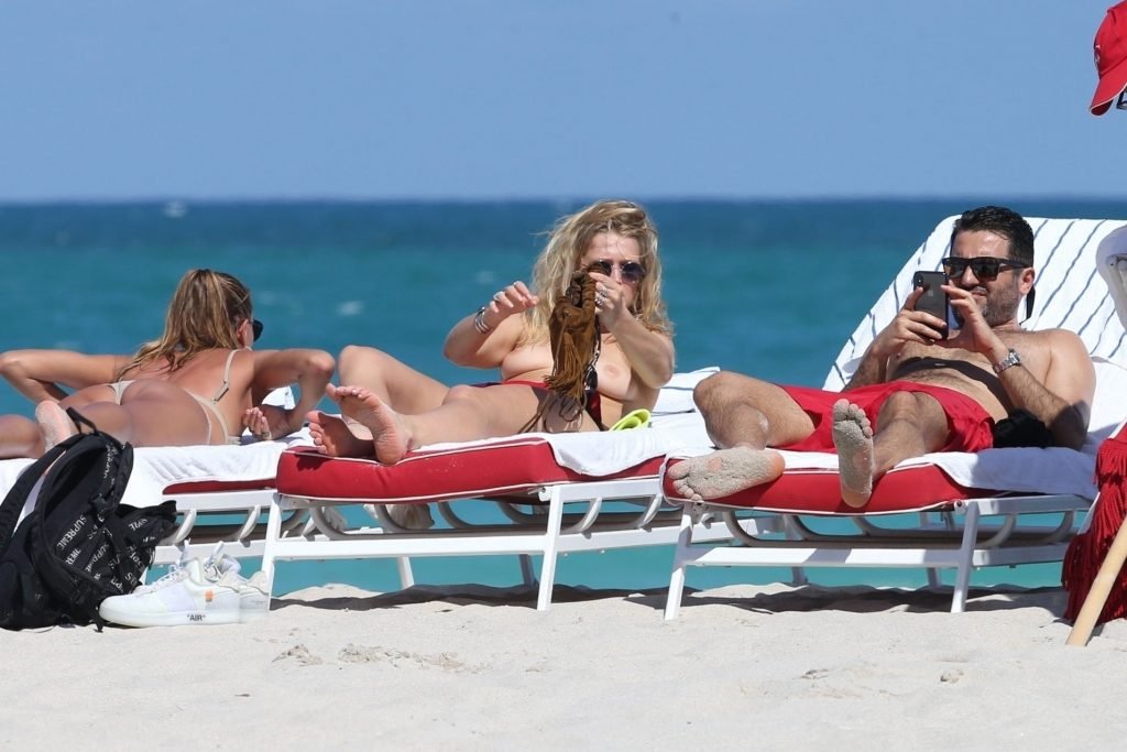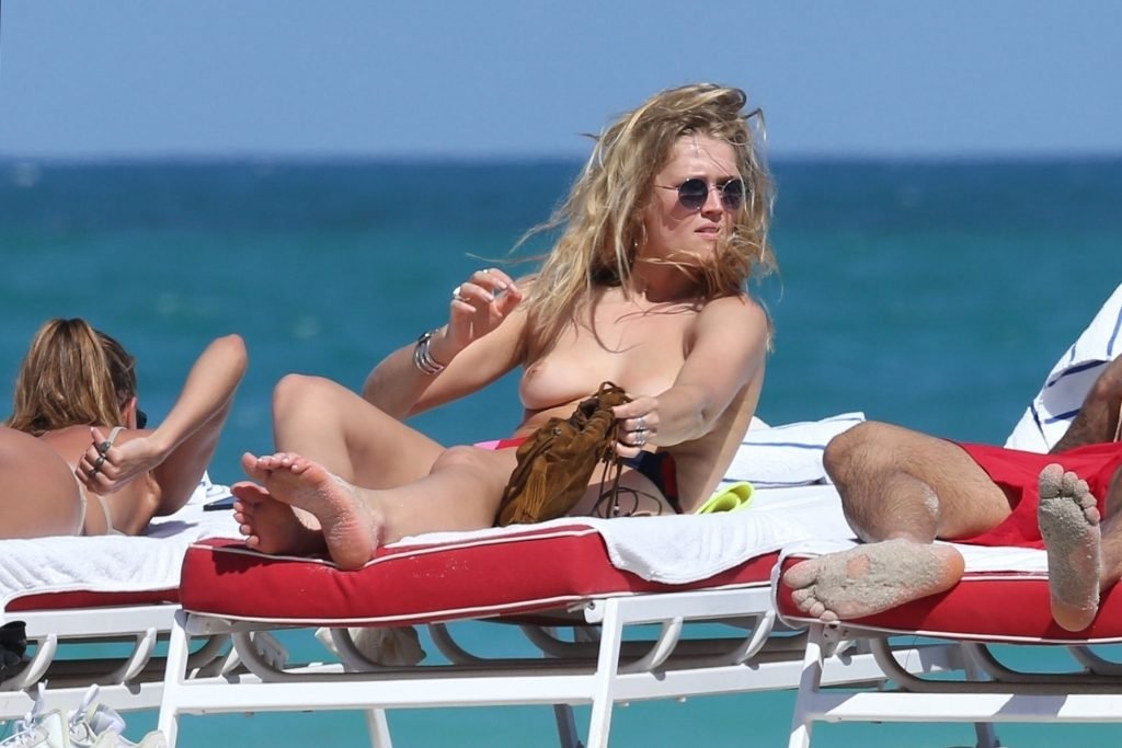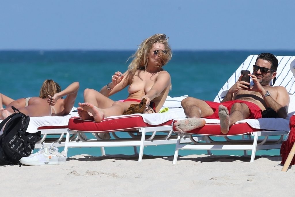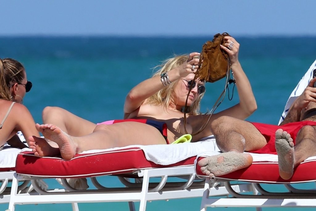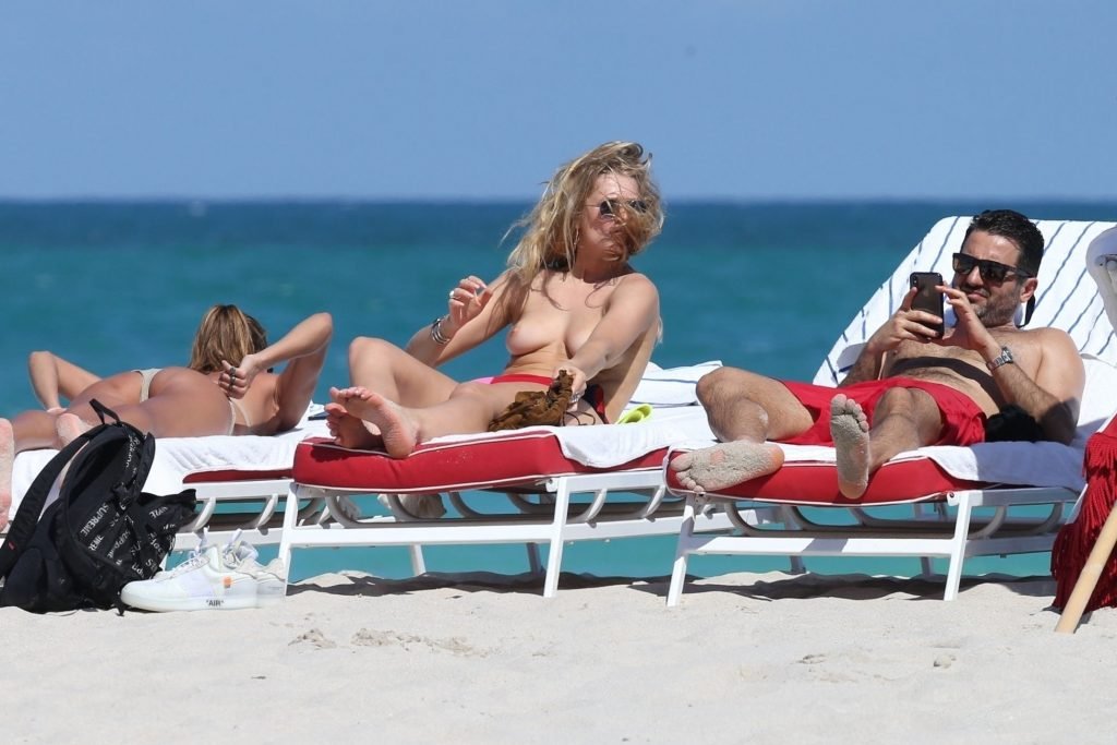 La modelo y actriz Toni Garrn va a la playa con amigos para tomar el sol durante el fin de semana de Pascua en Miami, 01/04/2018. Toni decidió quitarse la parte superior por el día, mostrando su pecho desnudo. Quizás Toni simplemente no quiere líneas de bronceado.
