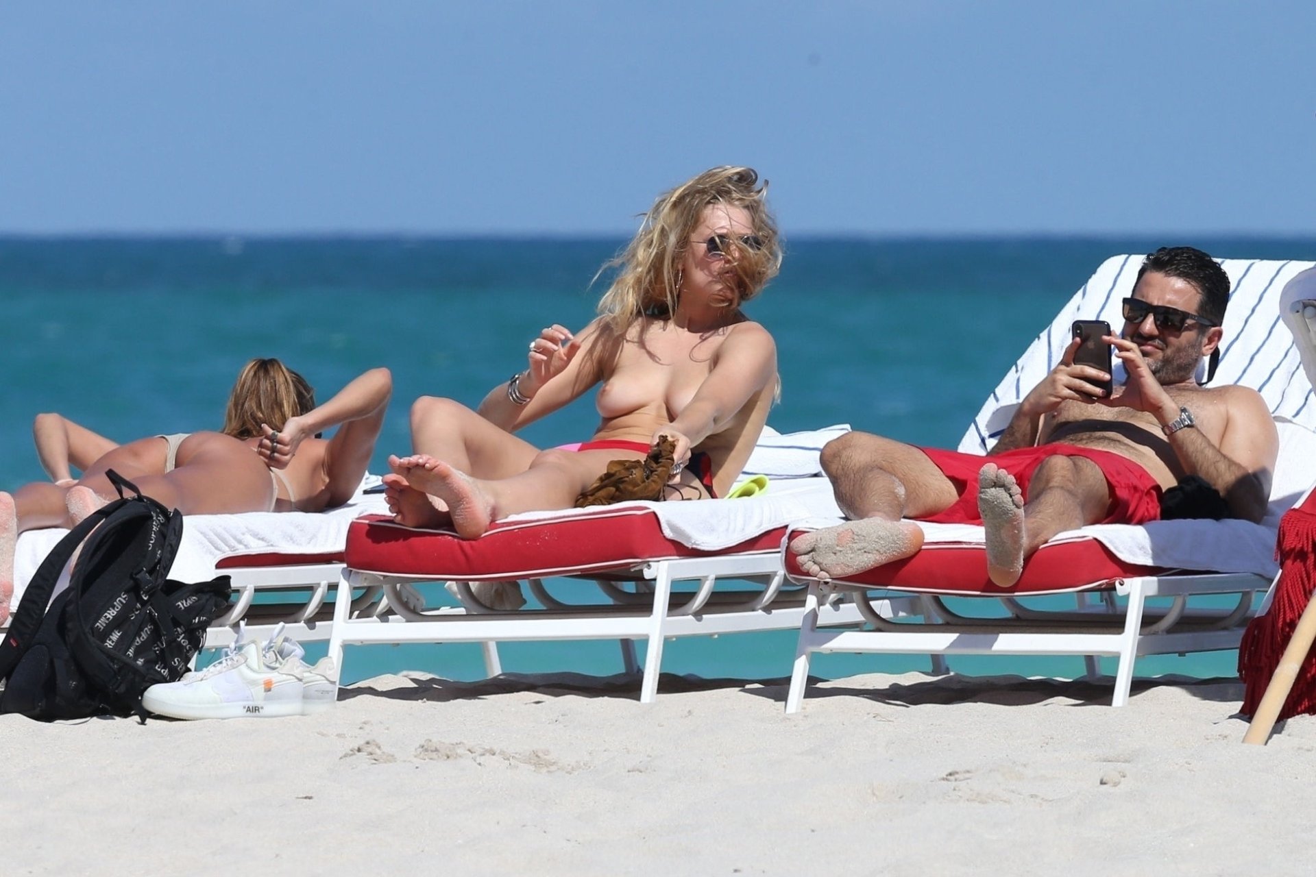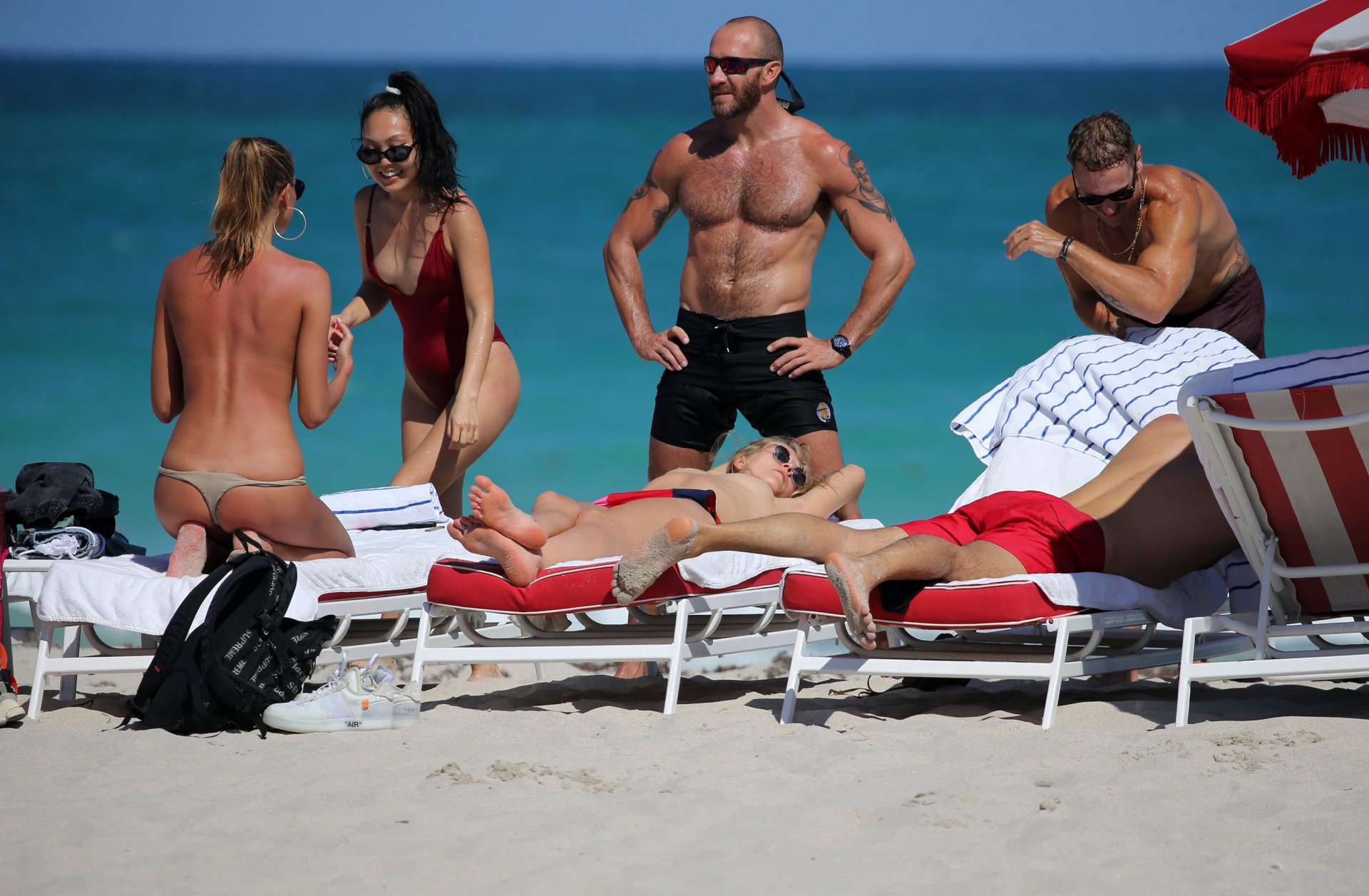 La modelo y actriz Toni Garrn va a la playa con amigos para tomar el sol durante el fin de semana de Pascua en Miami, 01/04/2018. Toni decidió quitarse la parte superior por el día, mostrando su pecho desnudo. Quizás Toni simplemente no quiere líneas de bronceado.