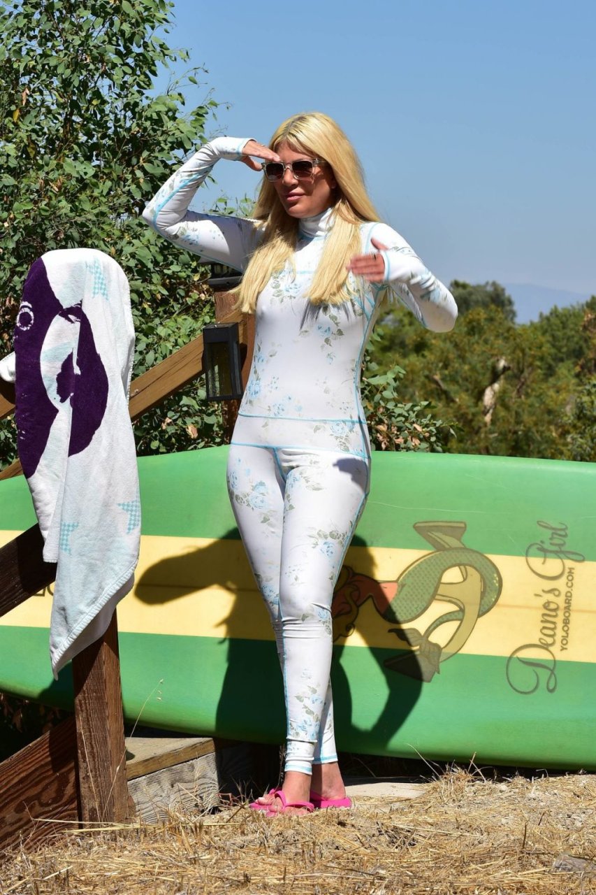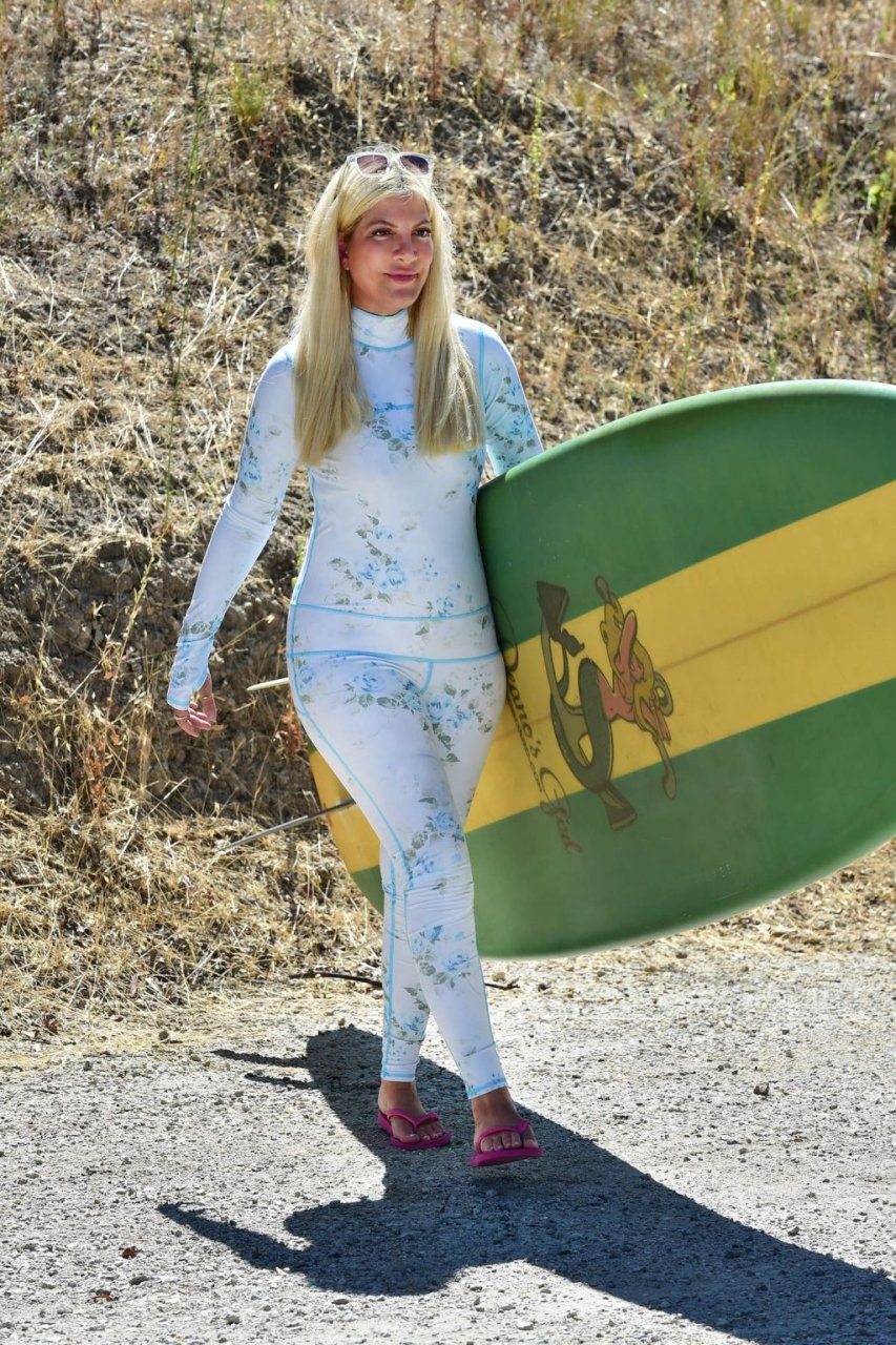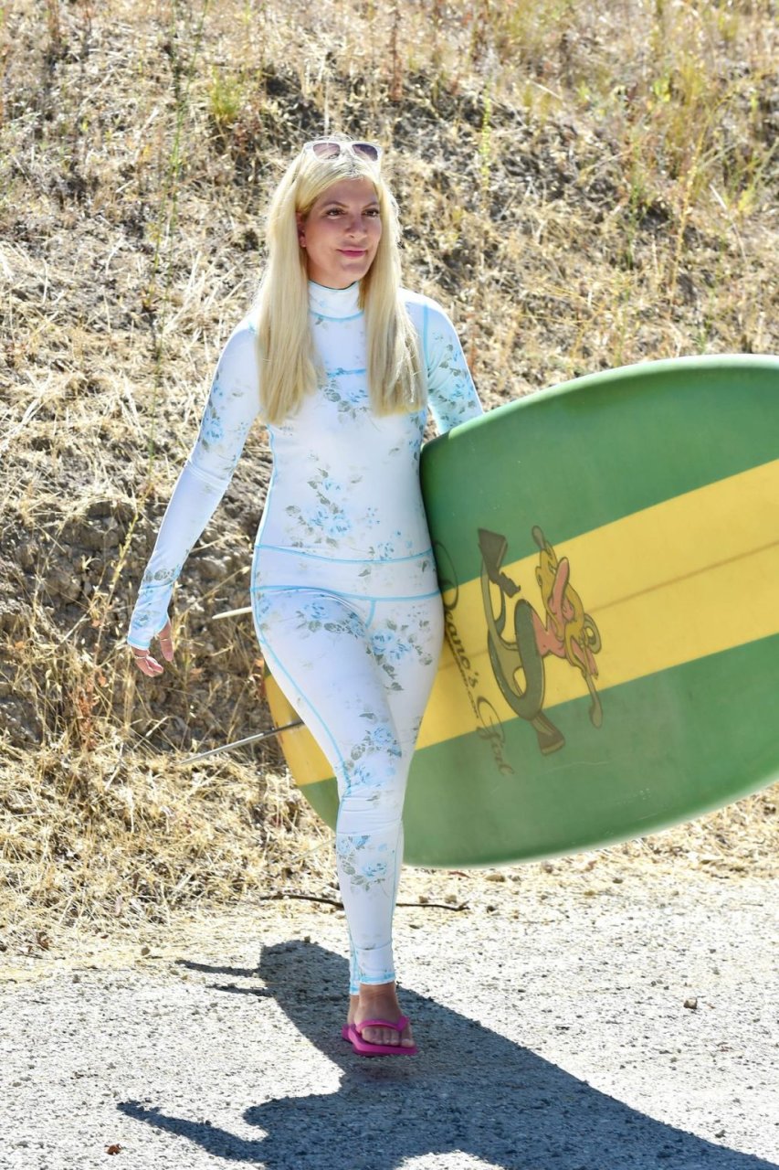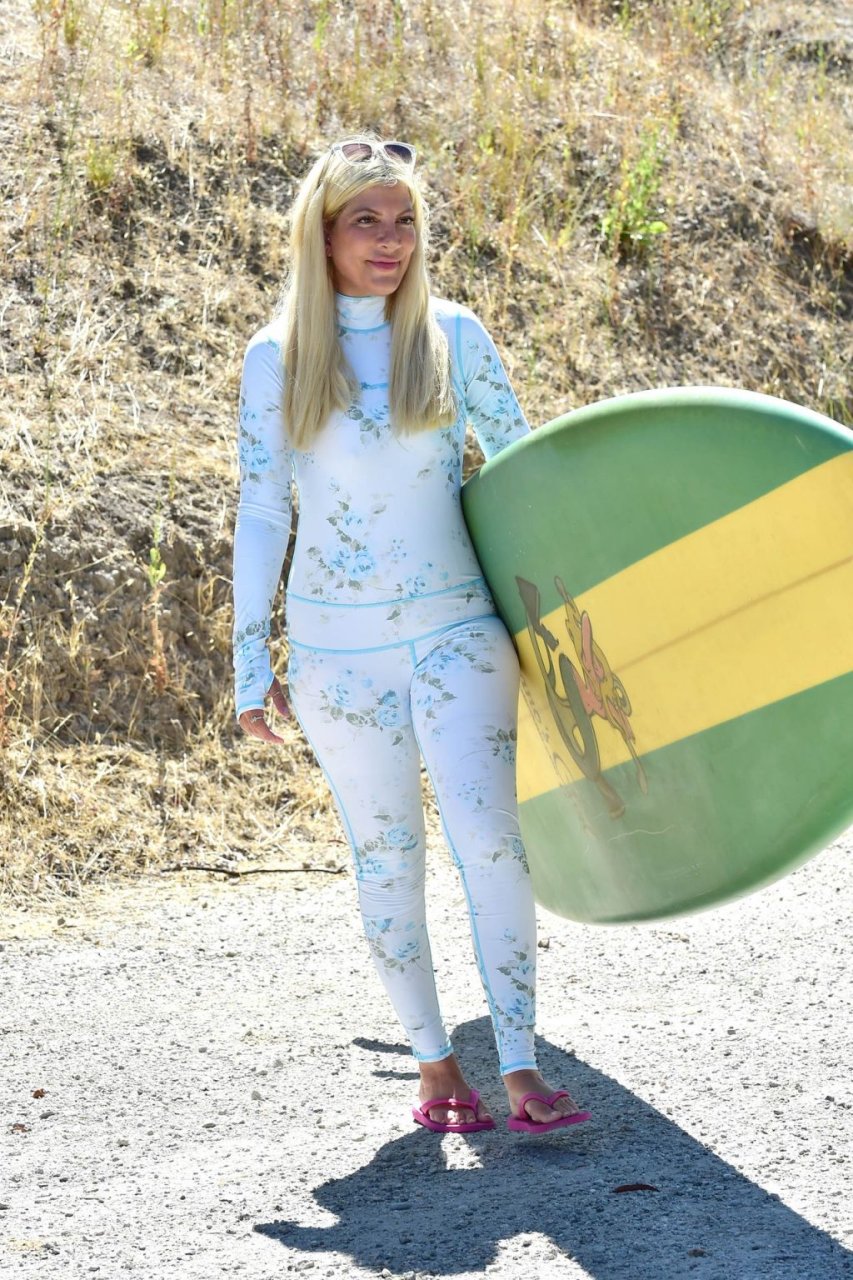 Tori Spelling fue fotografiada camino a una clase de surf en Malibu, 17/09/2019. Cuando le preguntaron qué llevaba puesto, le dijo a nuestro fotógrafo que es una línea de trajes de baño de una amiga actriz, Sarah Buxton, quien estuvo en el programa del padre de Spelling, Sunset Beach.