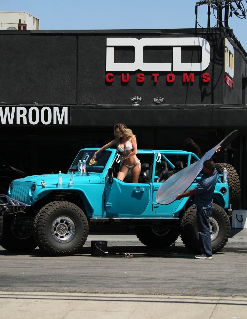 La modelo de Los Ángeles Trista Mikail Tomlinson posa para una sesión de fotos sexy en un lavado de autos para 138 Water en DCD Customs en Calabasas en colaboración con CWEN Magazine, 16/05/2018. La impresionante rubia mostró su cuerpo perfecto y mojado con bikini.