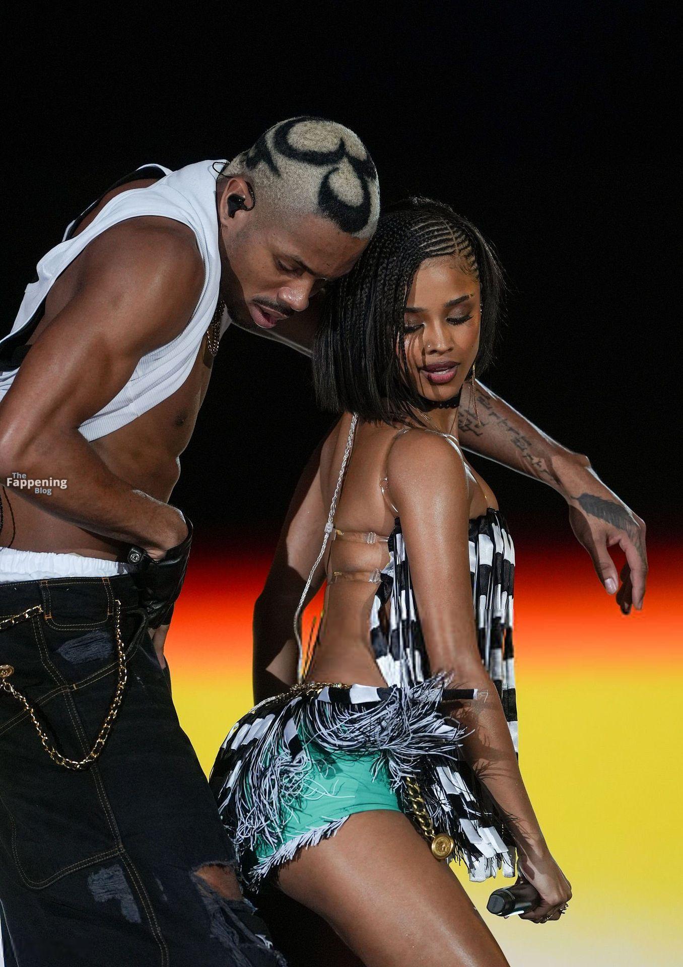Tyla lució espectacular en el Festival Global Citizen en NYC, con un vestido de flecos sobre pantalones cortos teal. Mostró sus piernas y trasero en una actuación.