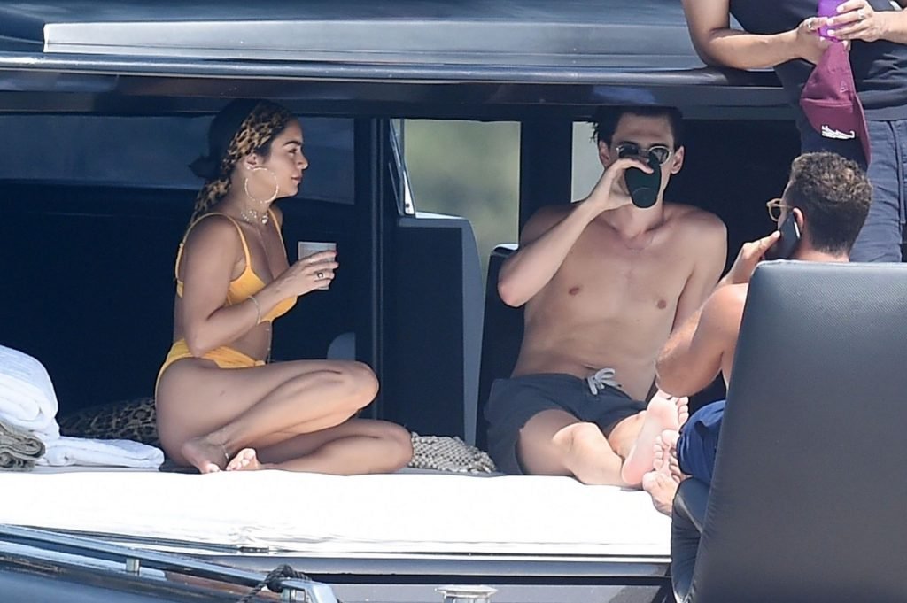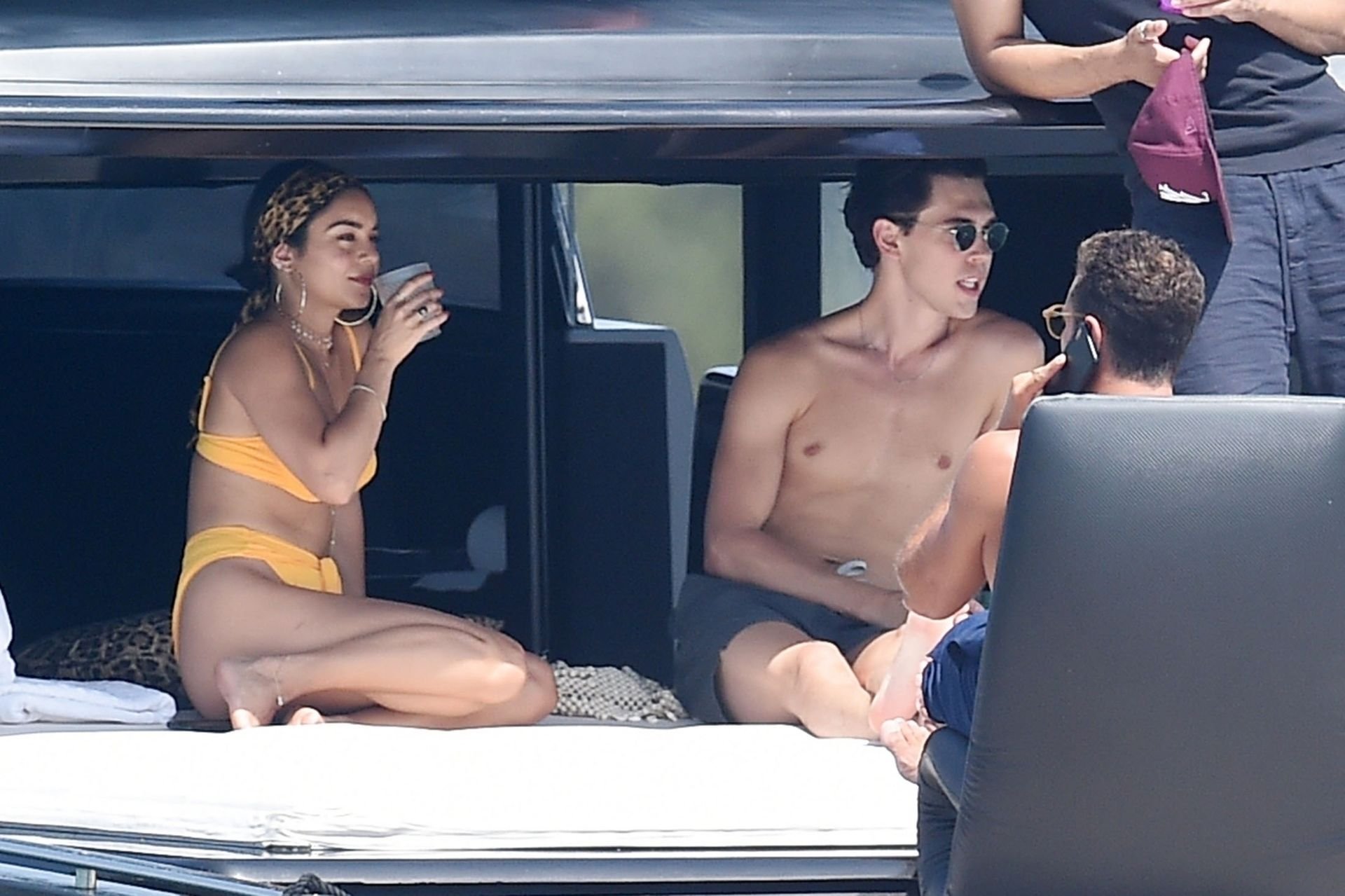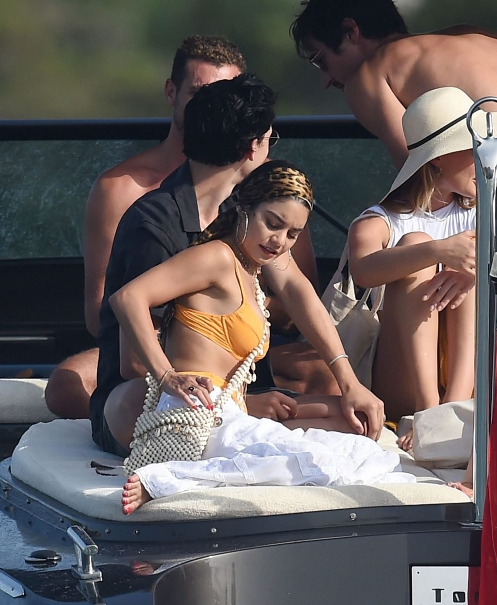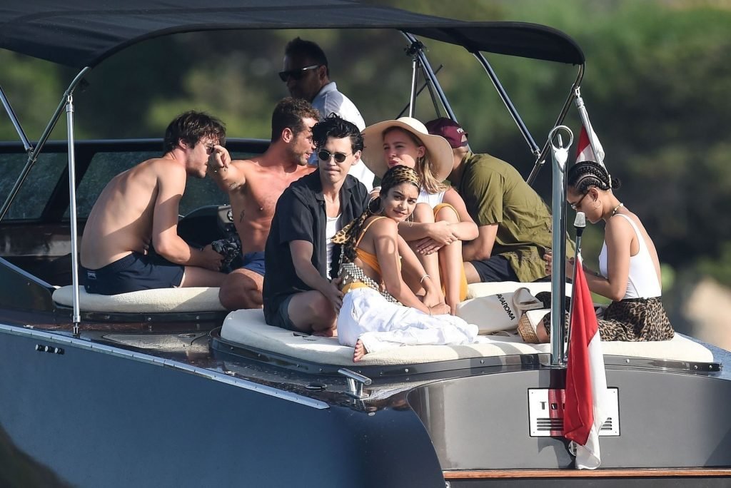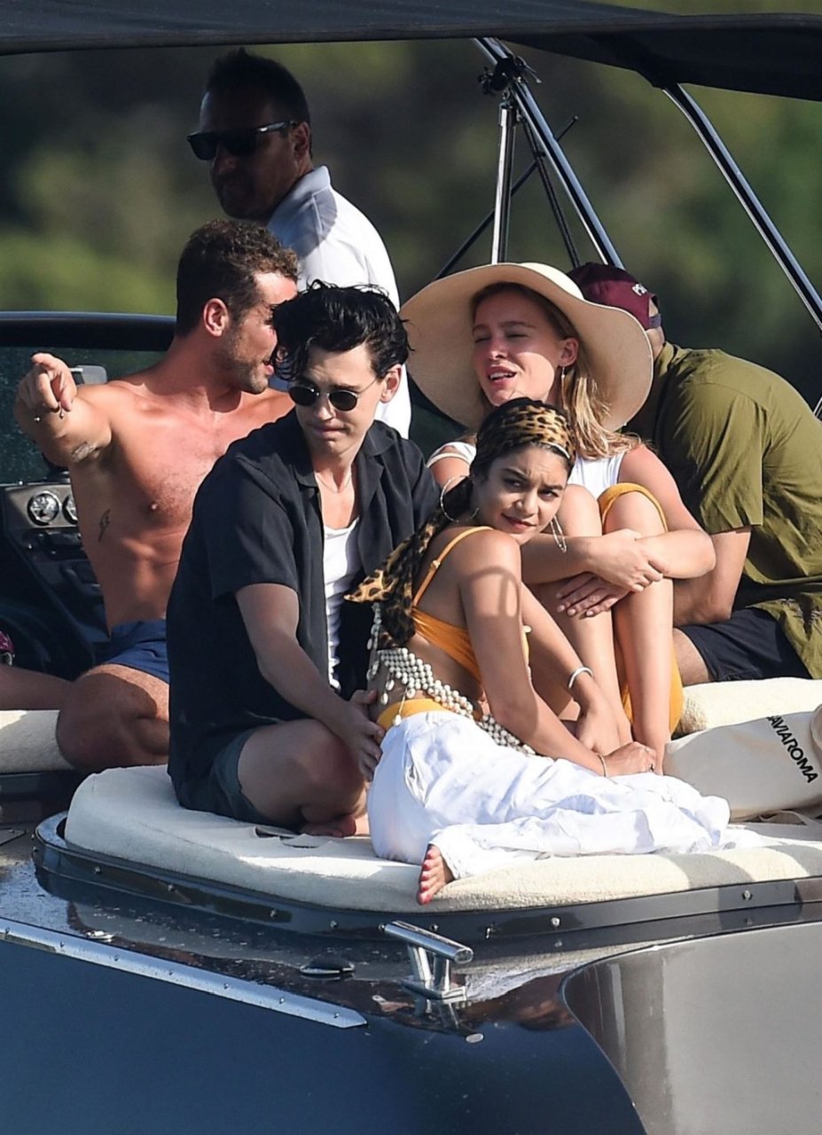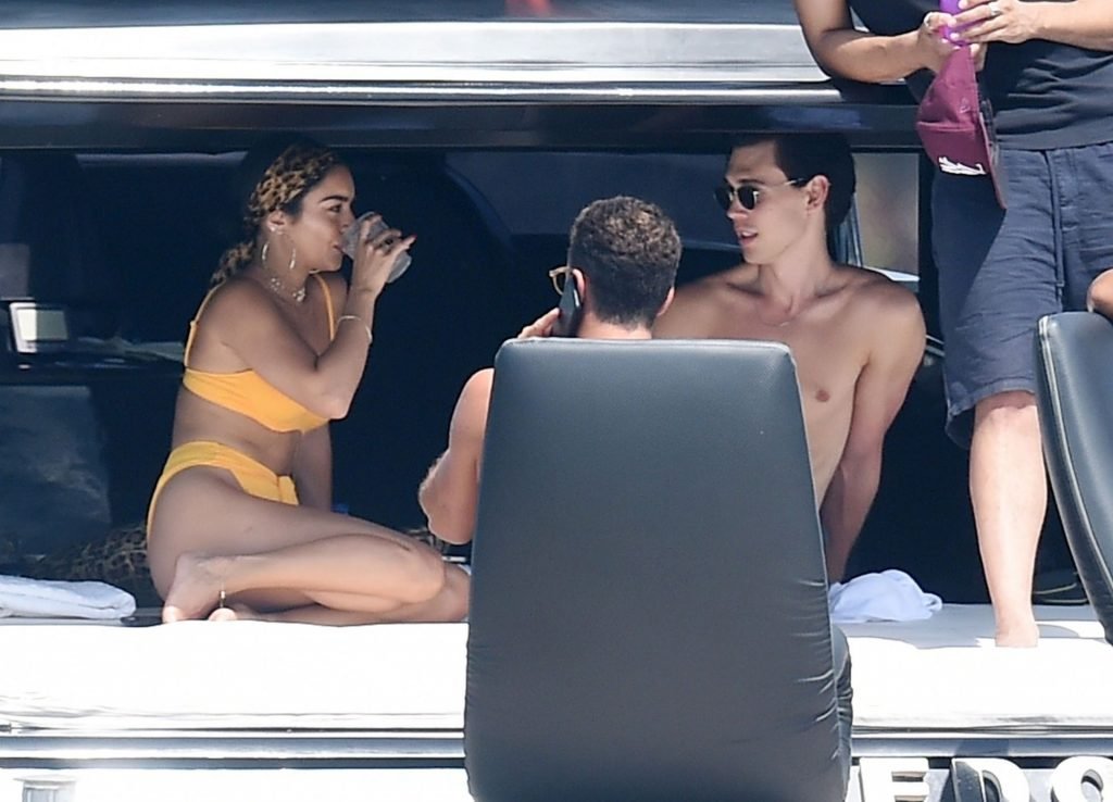La actriz estadounidense Vanessa Hudgens y su novio Austin Butler fueron vistos en sus vacaciones soleadas en su yate en Porto Cervo, Italia, 12/08/2019.