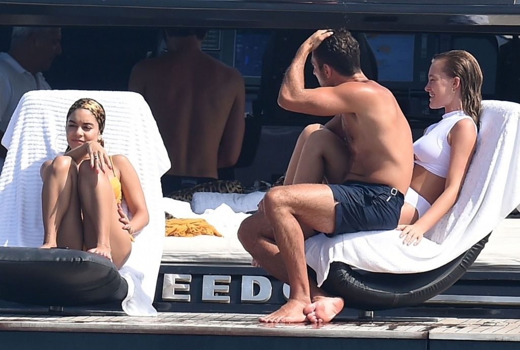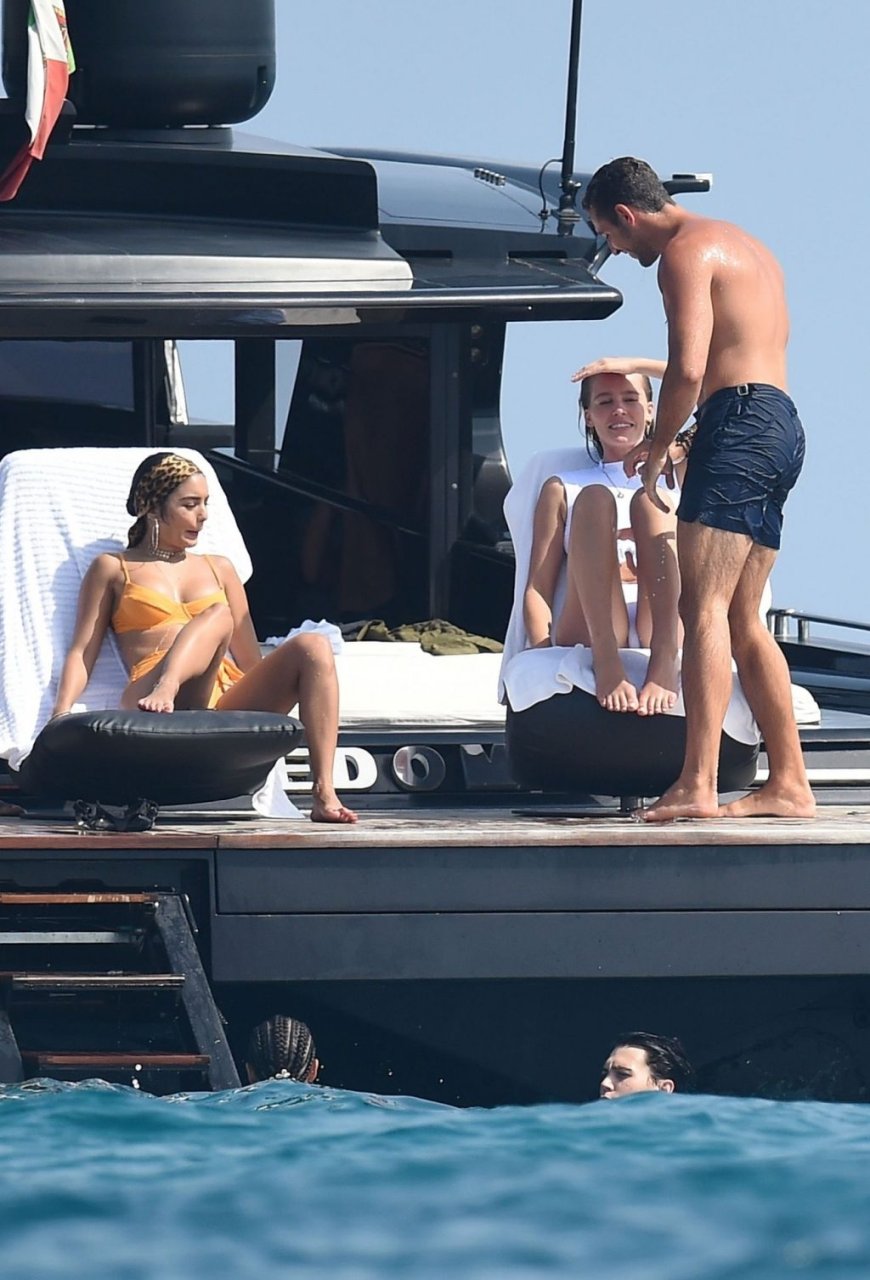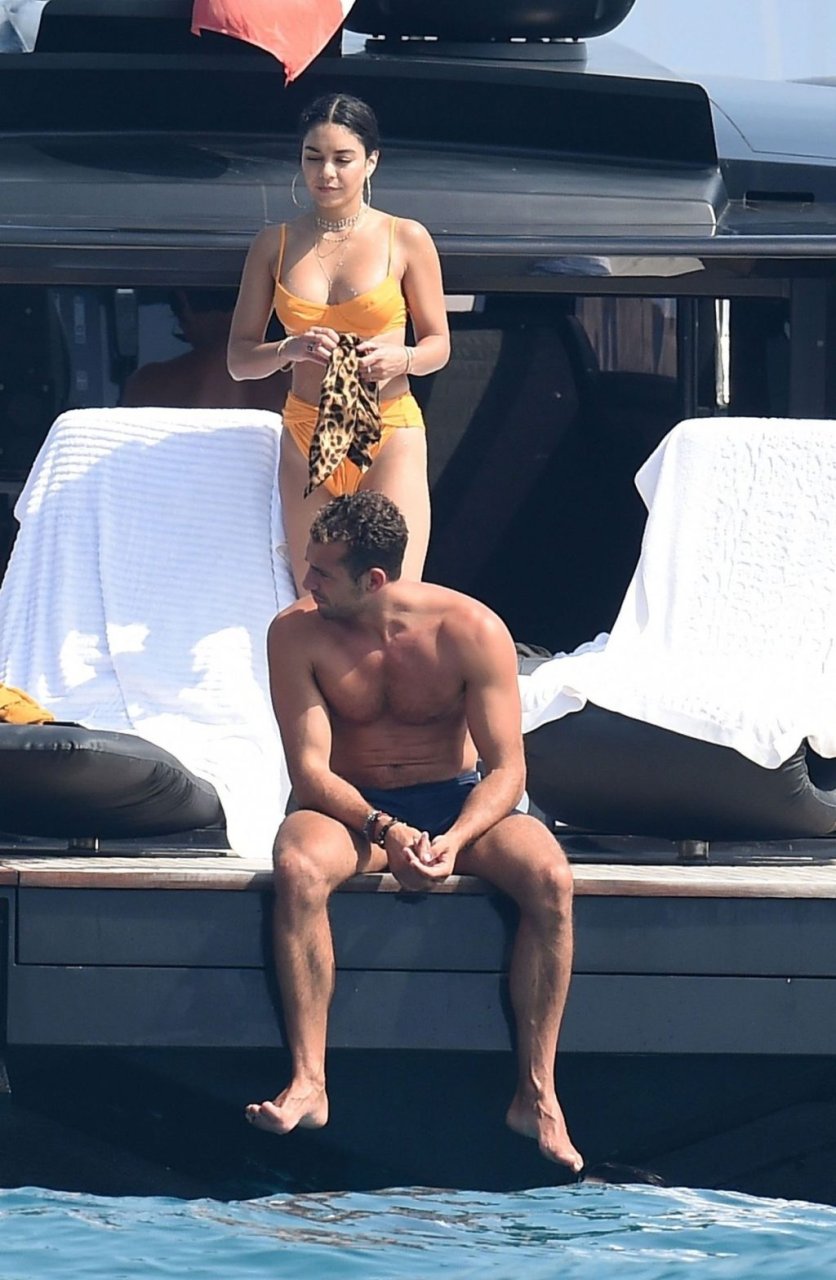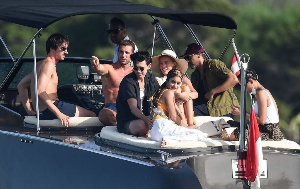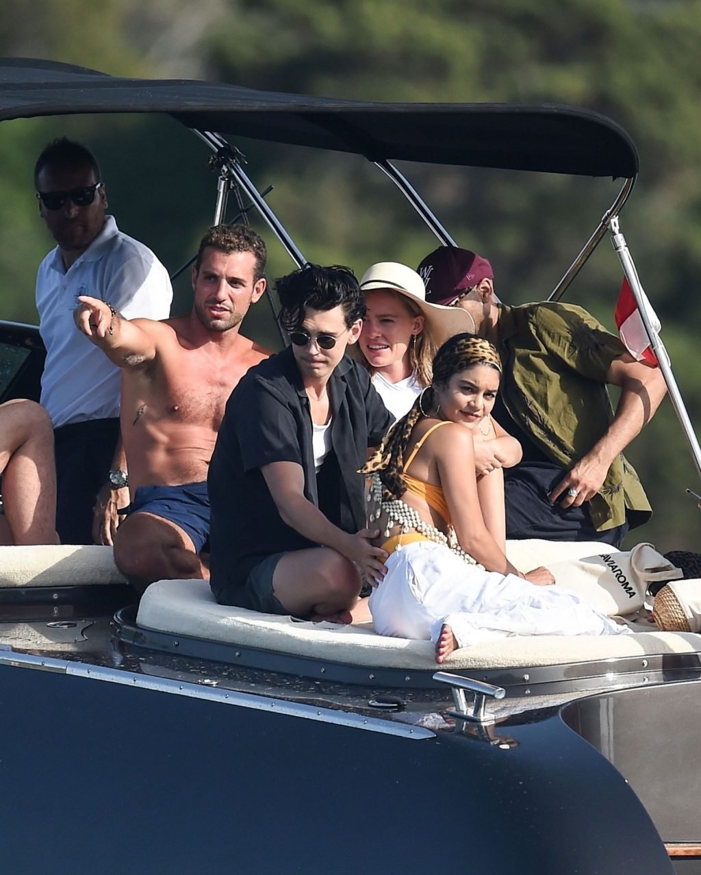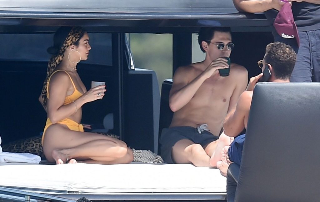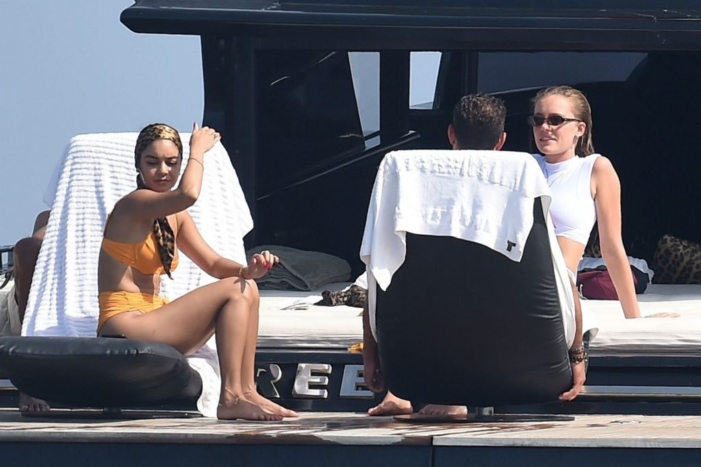 La actriz estadounidense Vanessa Hudgens y su novio Austin Butler fueron vistos en sus vacaciones soleadas en su yate en Porto Cervo, Italia, 12/08/2019.