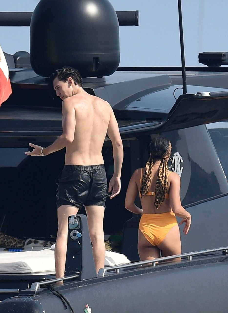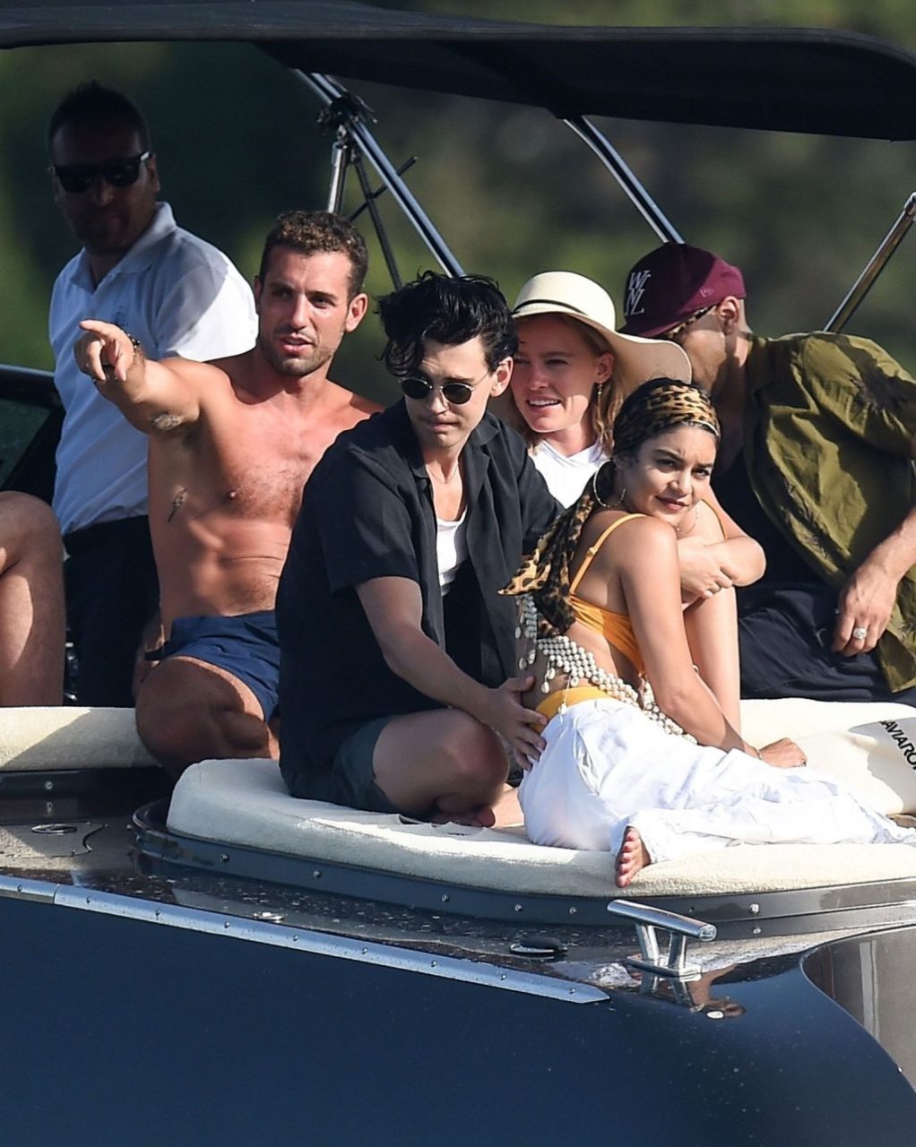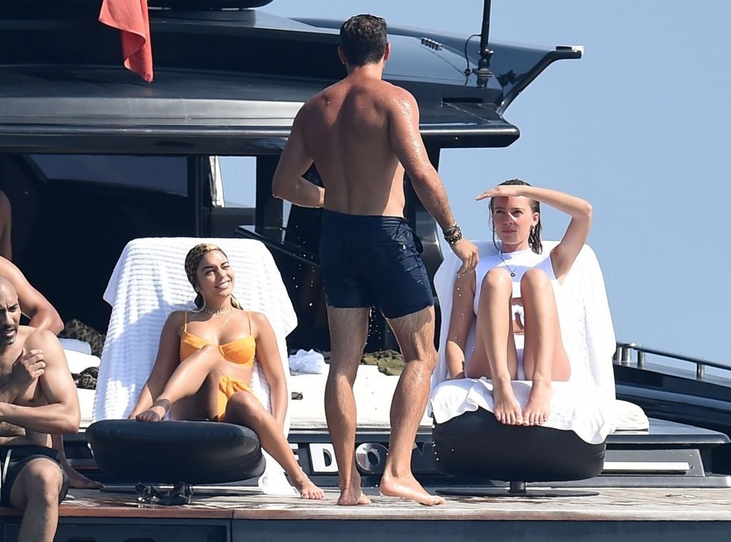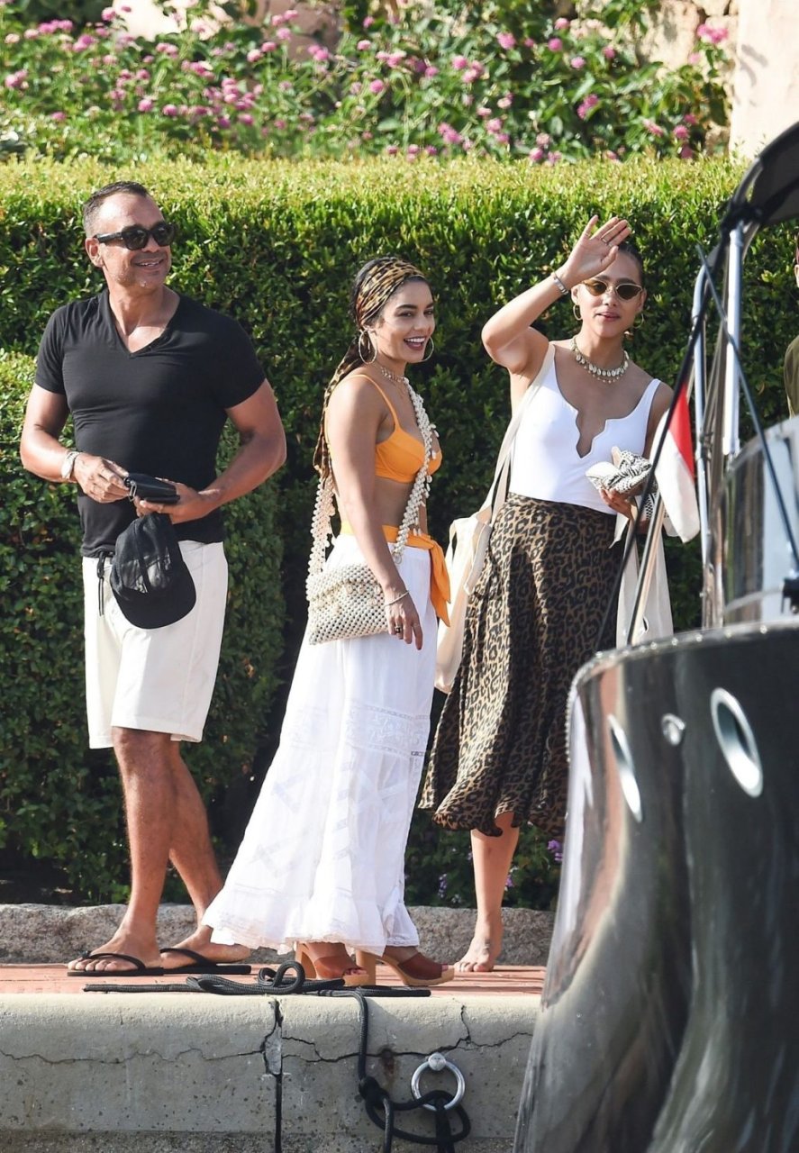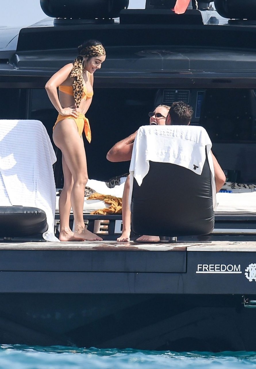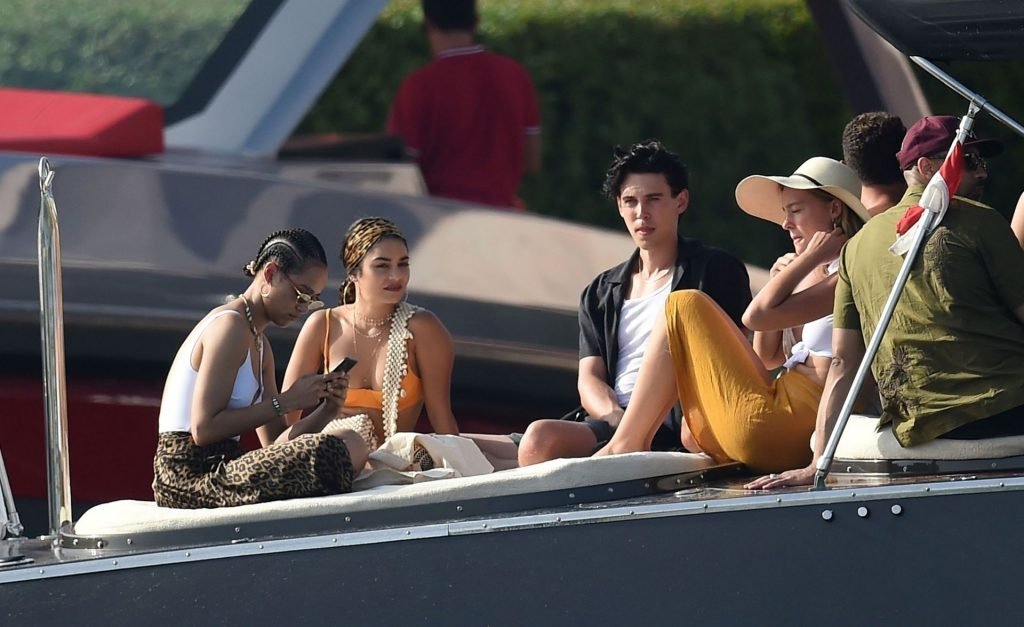 La actriz estadounidense Vanessa Hudgens y su novio Austin Butler fueron vistos en sus vacaciones soleadas en su yate en Porto Cervo, Italia, 12/08/2019.
