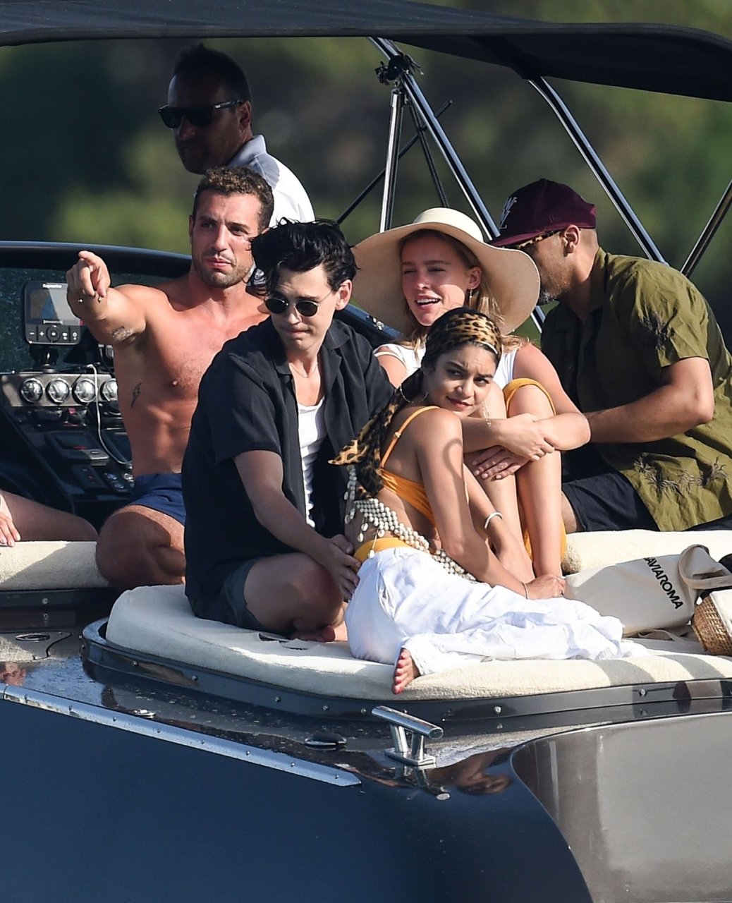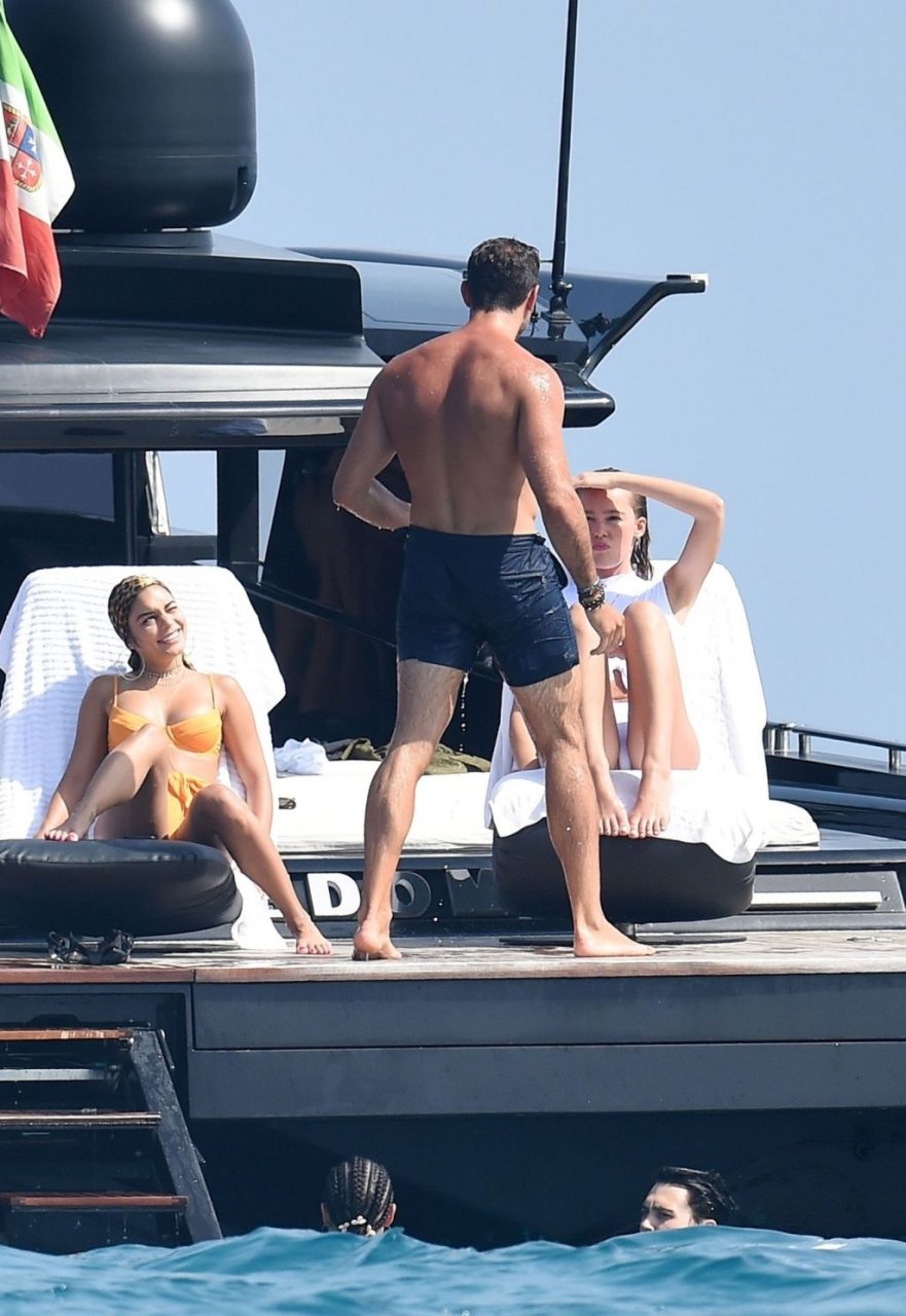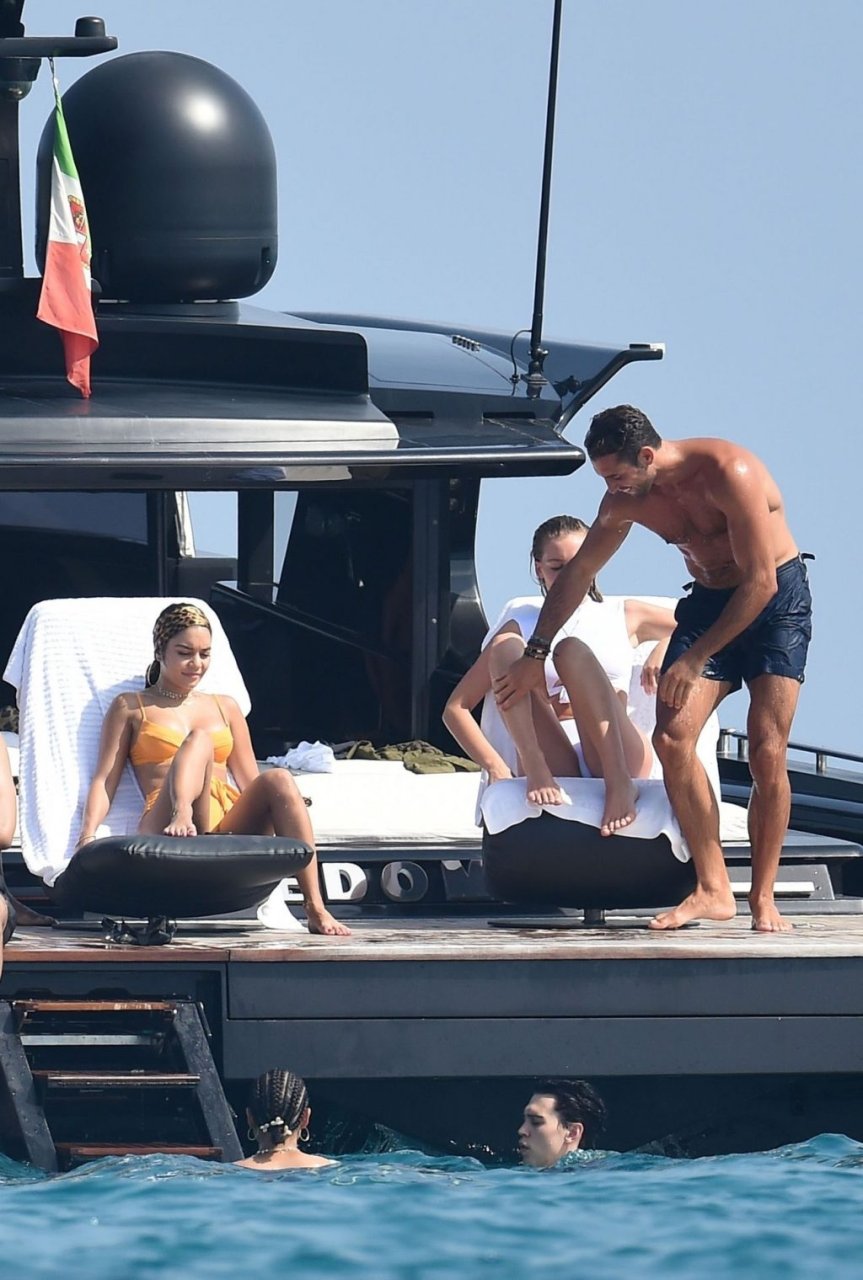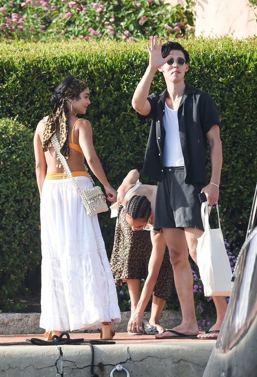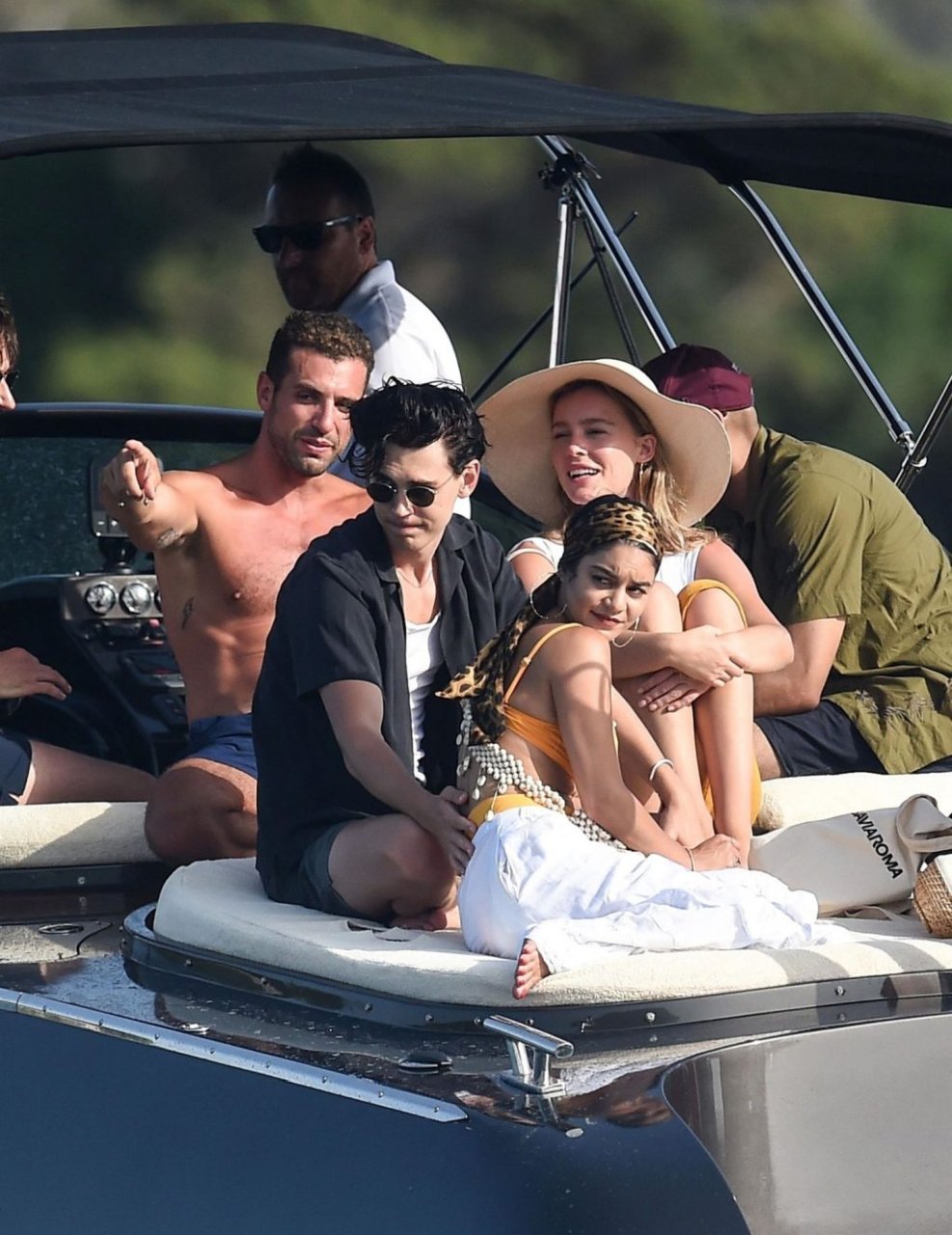 La actriz estadounidense Vanessa Hudgens y su novio Austin Butler fueron vistos en sus vacaciones soleadas en su yate en Porto Cervo, Italia, 12/08/2019.