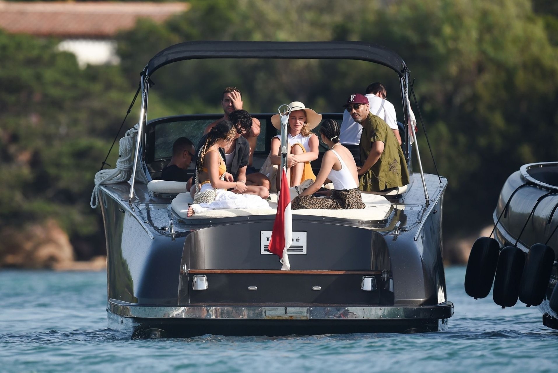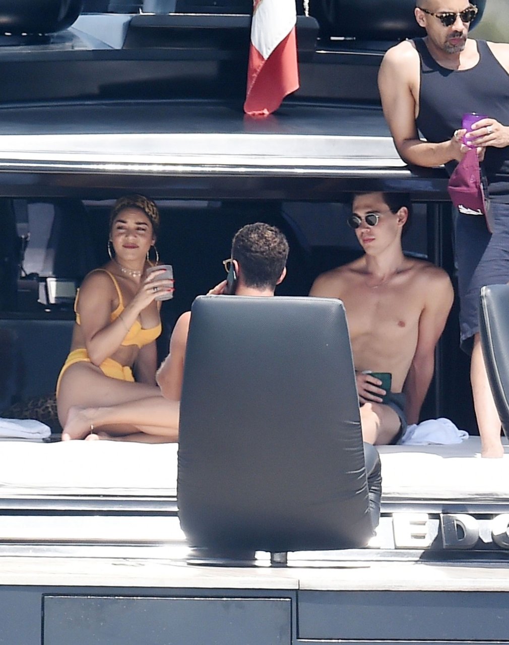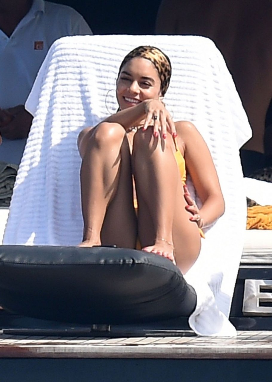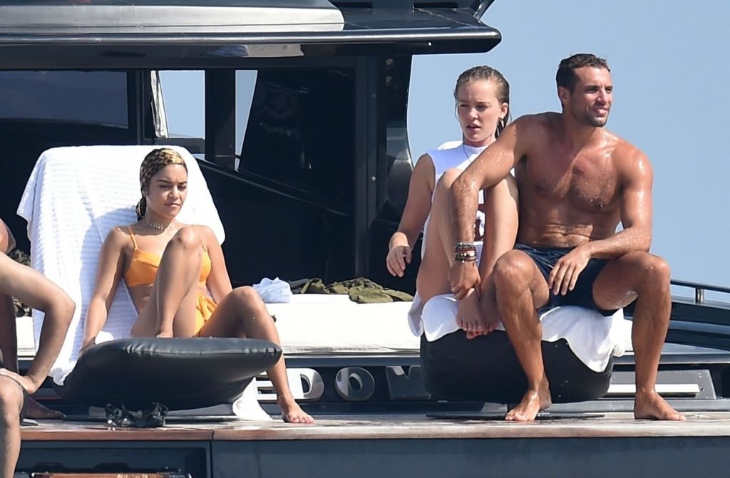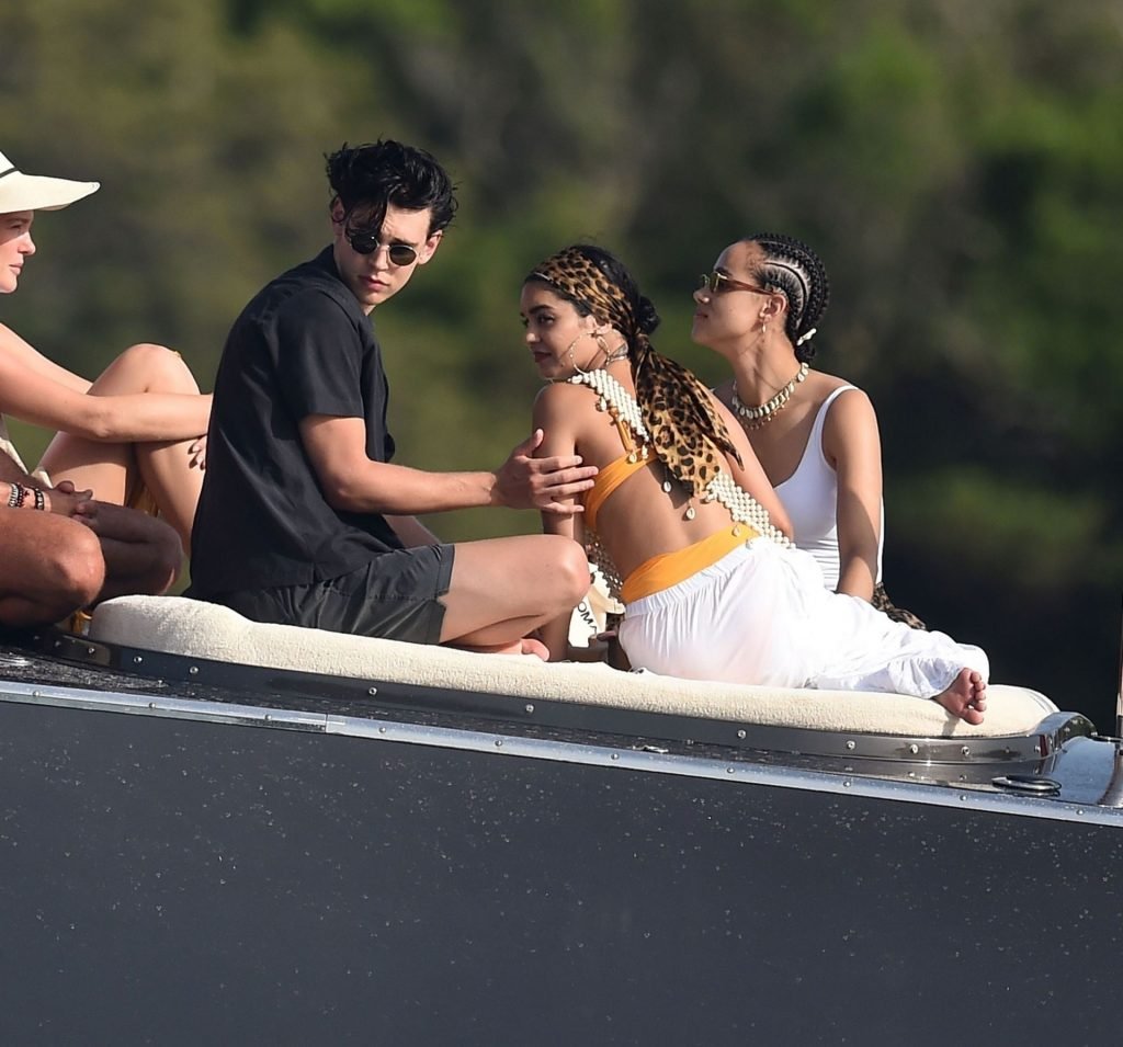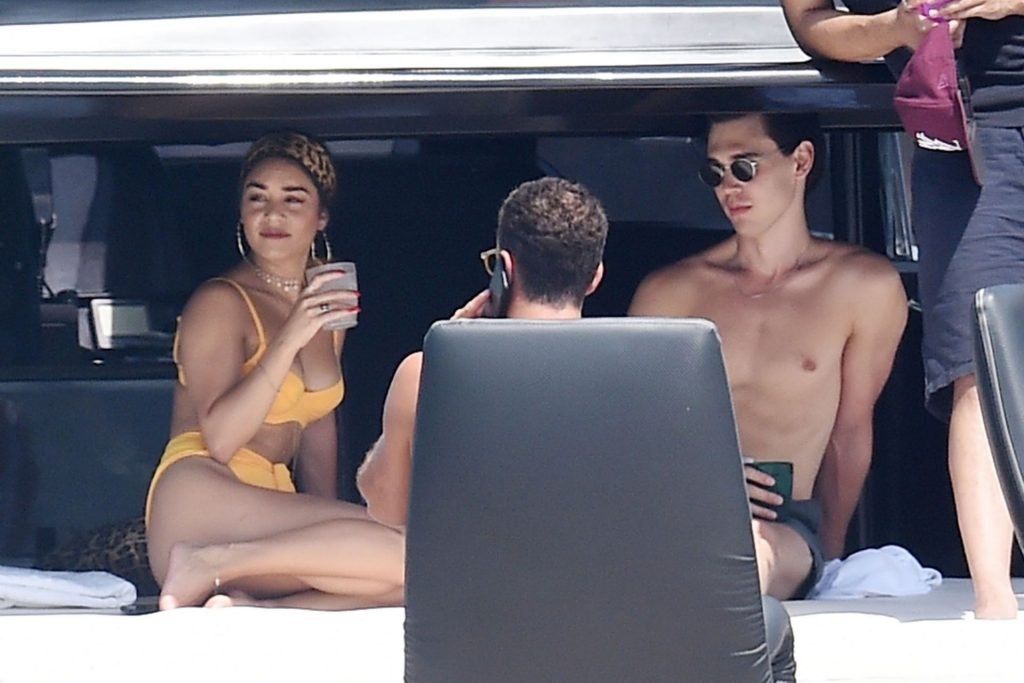 La actriz estadounidense Vanessa Hudgens y su novio Austin Butler fueron vistos en sus vacaciones soleadas en su yate en Porto Cervo, Italia, 12/08/2019.
