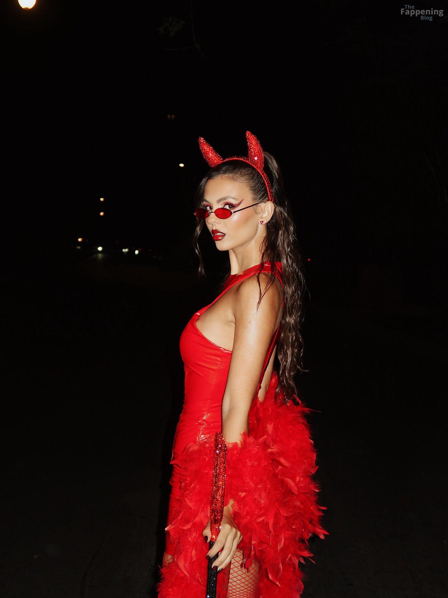 La estrella de The Fappening Victoria Justice deslumbra con un mini vestido de látex de diablo, medias de red y tacones de plataforma en Halloween.