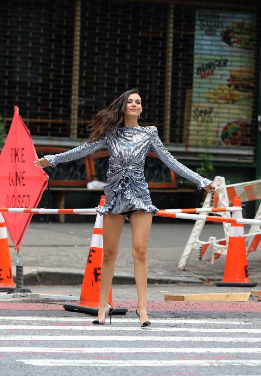 Actriz Victoria Justice (26) está sonriendo mientras luce un vestido plateado a la moda para una sesión de fotos en el barrio TriBeCa de Manhattan, 08/09/2019. La estrella de Fappening mostró sus piernas sexys, dejando ver algo de ropa interior.