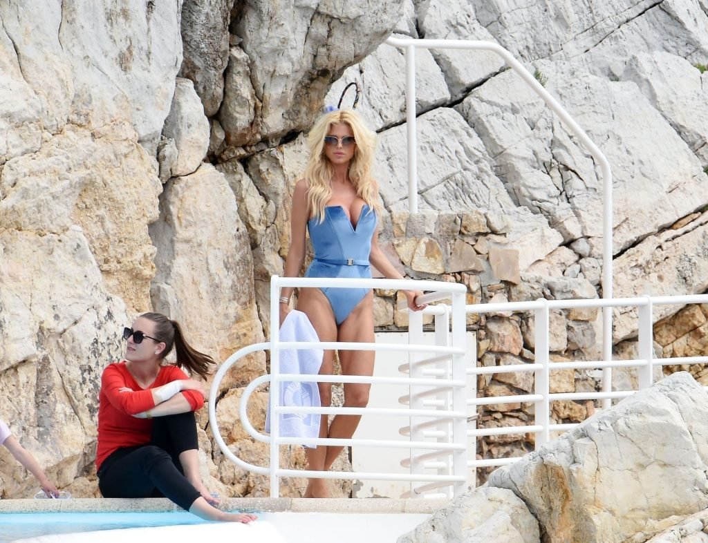 La modelo y actriz sueca Victoria Silvstedt fue fotografiada usando un traje de baño azul mientras se relajaba junto a la piscina en el Hotel du Cap-Eden-Roc, 22/05/2019.