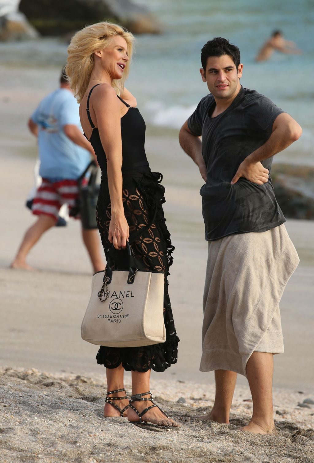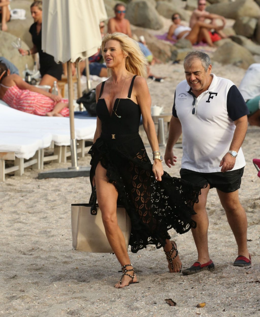La modelo nacida en Suecia Victoria Silvstedt exhibe una belleza impresionante con un vestido muy sexy con una abertura alta para una sesión de fotos en la playa en St. Barth, 29/12/2019. Silvstedt posa para una serie de poses sensuales, mostrando su enorme escote mientras sostiene su bolso Chanel.