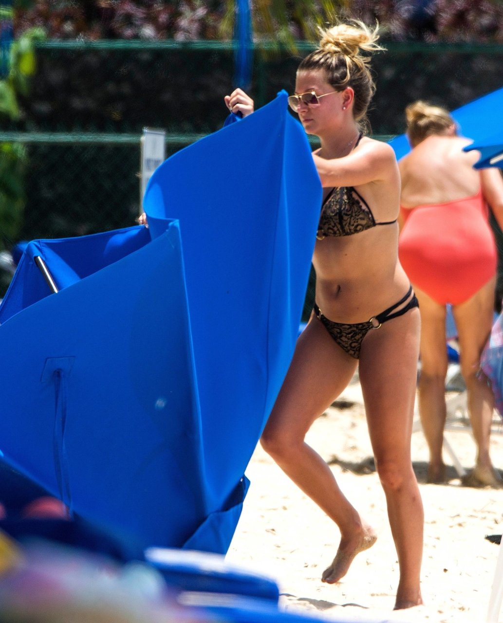 “Love Island” estrella Zara Holland y su madre Cheryl Hakeney fueron vistas en la playa en Barbados, 13/04/2019. La ex reina de belleza mostró sus pechos y glúteos luciendo un bikini genial con un diseño interesante de sujetador.