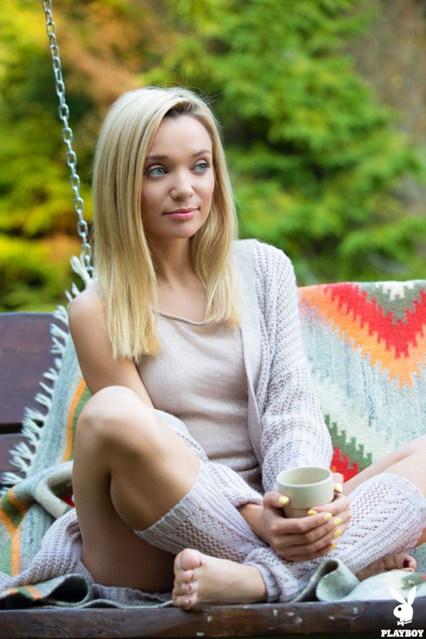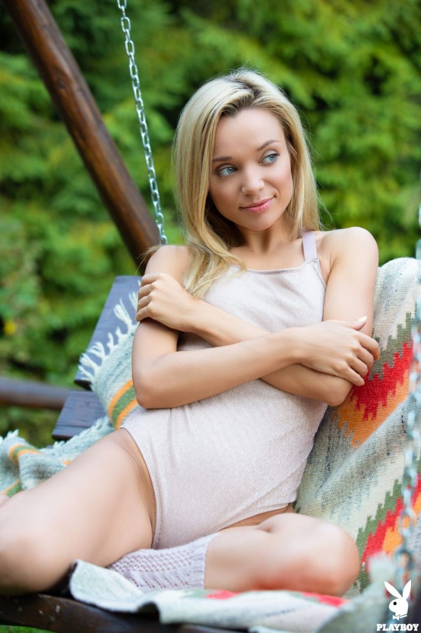 Zhenya Belaya está en una sesión de fotos desnuda para la revista Playboy + video HD. La modelo de 27 años posa en un hermoso día soleado. Es perfecto para jugar al aire libre con la pussy. La joven rubia se divierte completamente desnuda en el patio trasero y muestra sus pequeños pechos, trasero y piernas sexys en los columpios. A Zhenya le encanta viajar y mostrar su magnífico cuerpo.